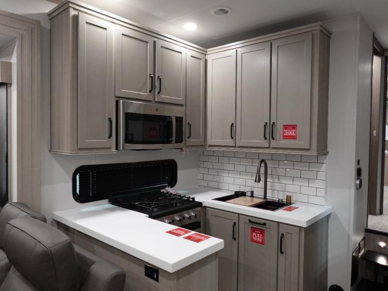 With any Momentum M-Class toy hauler by Grand Design, you will enjoy luxury at every turn! They have been constructed to a superior standard with a thermal roof design, triple insulated main floor and garage floor, and a Rail-Tite underbelly seal that will allow you to camp in all elements. Each model also features a, 8' 5" wide body chassis with a wide rail design, no wheel wheels, and a dovetail entry for easier loading. The Stealth A/C system provides maximum cooling power, and the CRE3000 suspension system means you can enjoy a smooth tow each time. You will love the luxurious interior with a professional grade stainless steel cooktop, interior color changing LED accent lighting, a fiberglass shower with a glass door, and solid surface countertops.