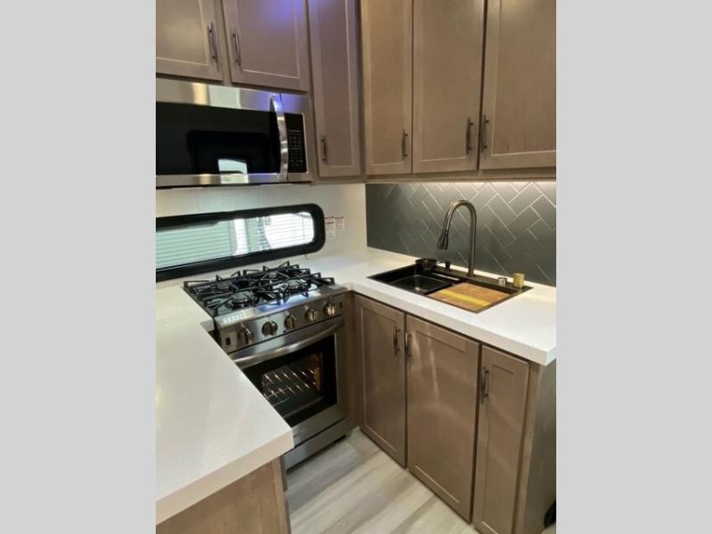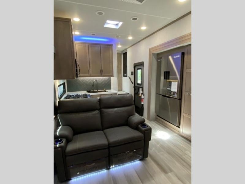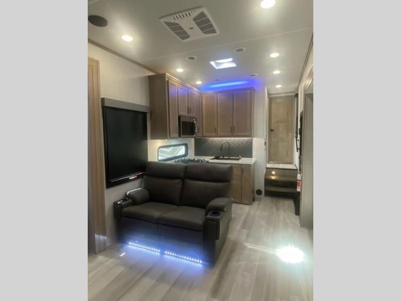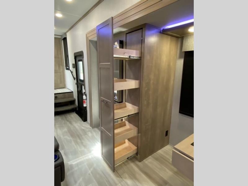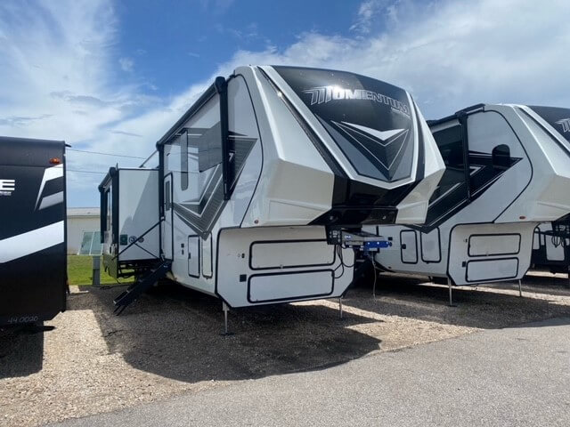 With any Momentum M-Class toy hauler by Grand Design, you will enjoy luxury at every turn! They have been constructed to a superior standard with a thermal roof design, triple insulated main floor and garage floor, and a Rail-Tite underbelly seal that will allow you to camp in all elements. Each model also features a, 8' 5" wide body chassis with a wide rail design, no wheel wheels, and a dovetail entry for easier loading. The Stealth A/C system provides maximum cooling power, and the CRE3000 suspension system means you can enjoy a smooth tow each time. You will love the luxurious interior with a professional grade stainless steel cooktop, interior color changing LED accent lighting, a fiberglass shower with a glass door, and solid surface countertops.