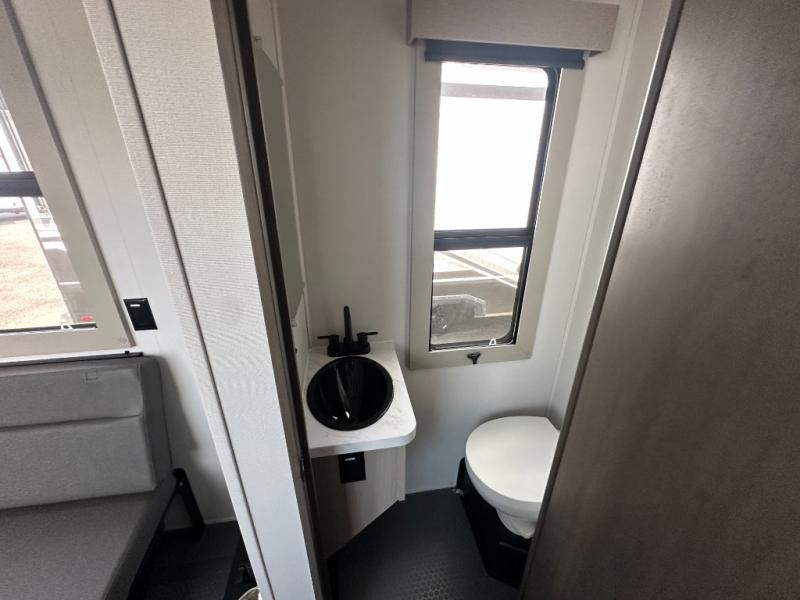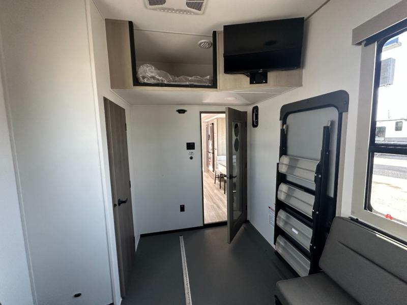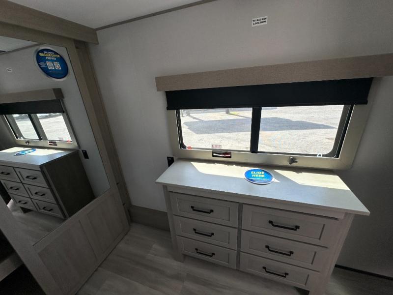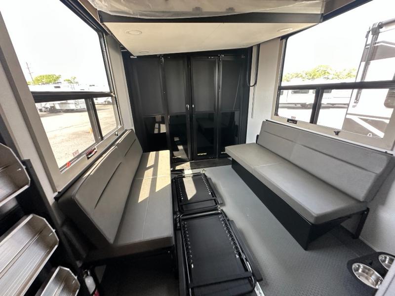 Any time spent in this spacious toy hauler will be time well spent! The 14' garage includes an overhead loft bed and a flip-up pet dish for your furry friends. If you're needing more sleeping space, you might want to choose the optional Liftsuite System and optional half bath. Once you enter in the main living area, you can relax on the L-shaped sofa with recline across from the fireplace, and there is a free-standing dinette if you want to play a game or two. The chef of your group will love the generous counter space in the kitchen, and the dual entry bath will let everyone stay clean throughout your trip! Head to the front master bedroom to enjoy the queen bed slide out with an optional king bed, a slide top dresser with TV prep, plus a large front closet, complete with washer and dryer prep!