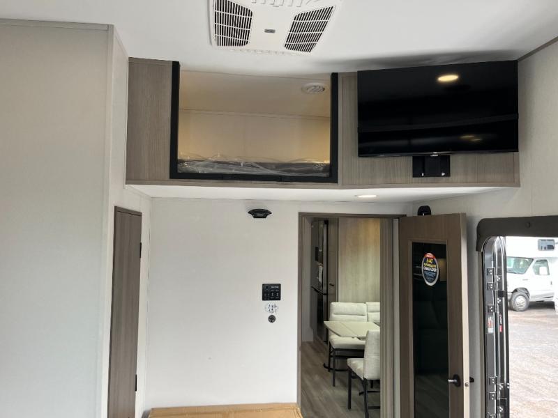 Any time spent in this spacious toy hauler will be time well spent! The 14' garage includes an overhead loft bed and a flip-up pet dish for your furry friends. If you're needing more sleeping space, you might want to choose the optional Liftsuite System and optional half bath. Once you enter in the main living area, you can relax on the L-shaped sofa with recline across from the fireplace, and there is a free-standing dinette if you want to play a game or two. The chef of your group will love the generous counter space in the kitchen, and the dual entry bath will let everyone stay clean throughout your trip! Head to the front master bedroom to enjoy the queen bed slide out with an optional king bed, a slide top dresser with TV prep, plus a large front closet, complete with washer and dryer prep!