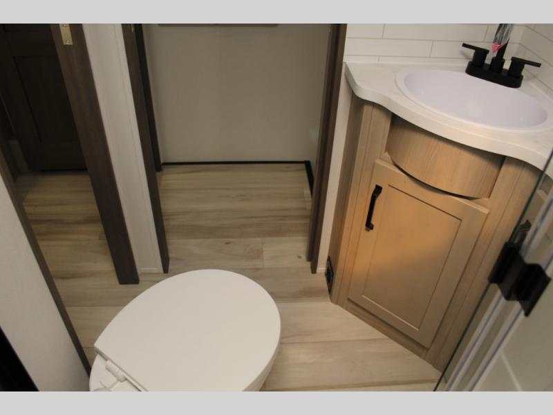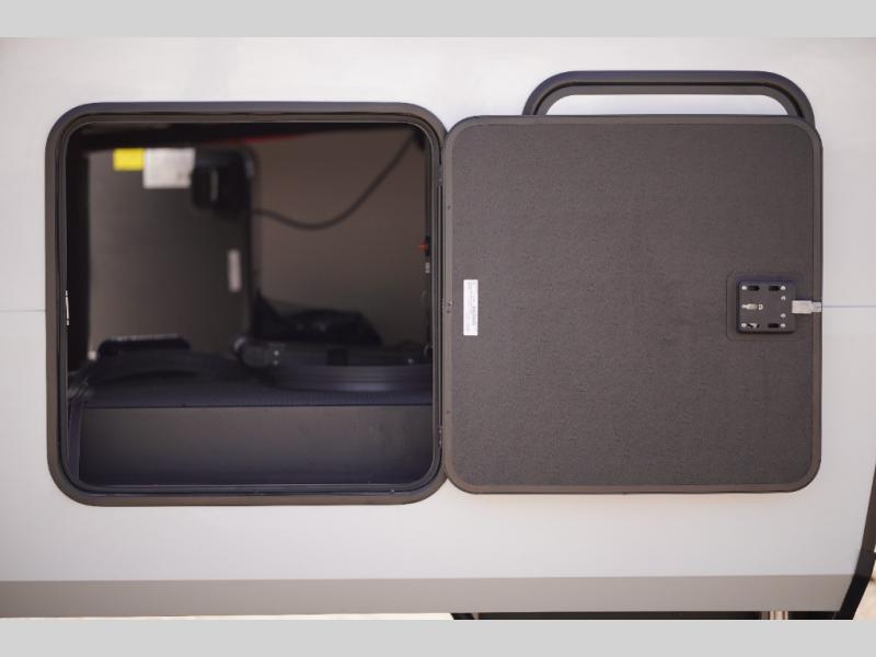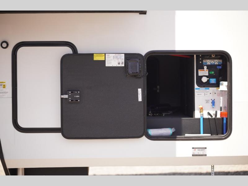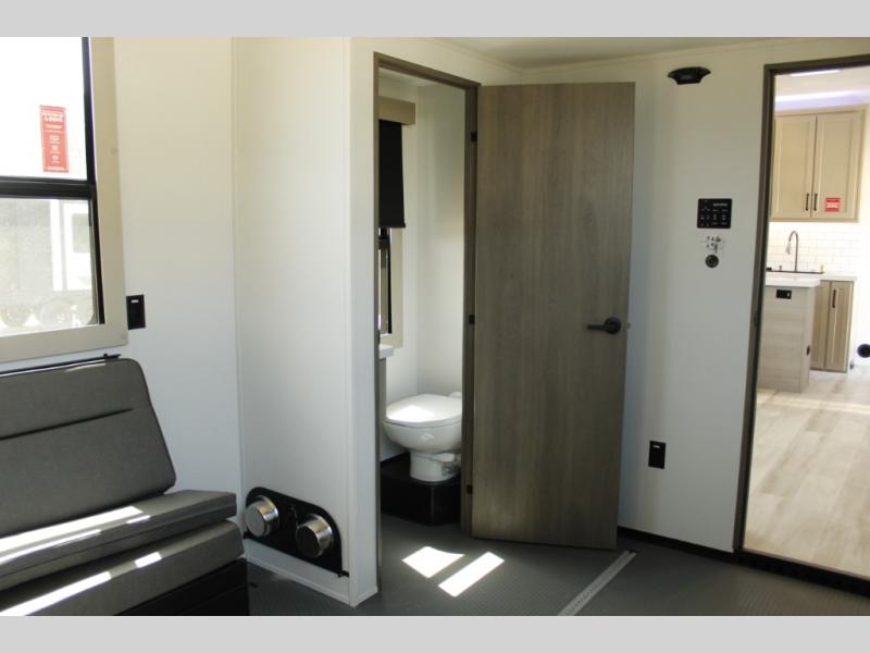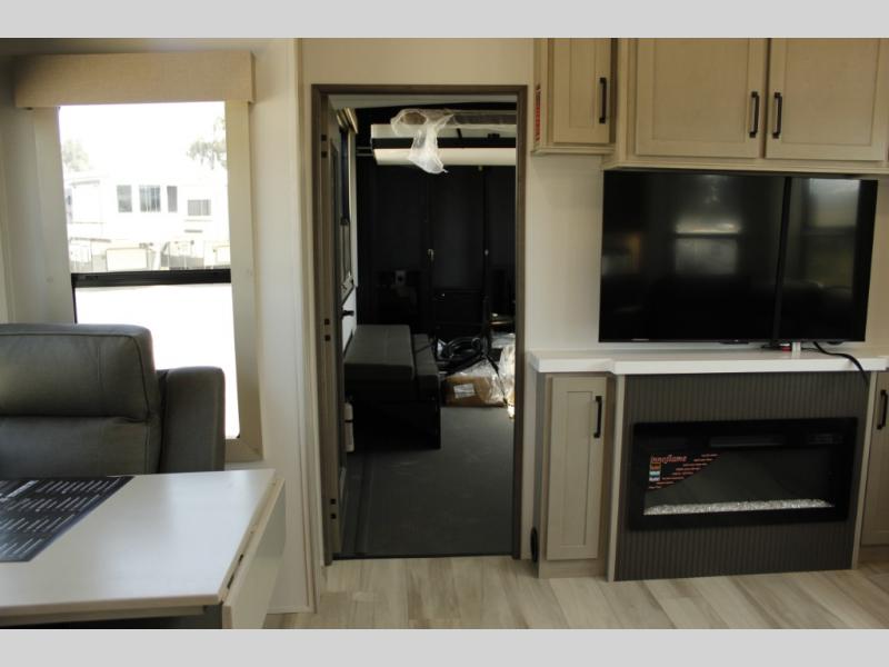 Any time spent in this spacious toy hauler will be time well spent! The 14' garage includes an overhead loft bed and a flip-up pet dish for your furry friends. If you're needing more sleeping space, you might want to choose the optional Liftsuite System and optional half bath. Once you enter in the main living area, you can relax on the L-shaped sofa with recline across from the fireplace, and there is a free-standing dinette if you want to play a game or two. The chef of your group will love the generous counter space in the kitchen, and the dual entry bath will let everyone stay clean throughout your trip! Head to the front master bedroom to enjoy the queen bed slide out with an optional king bed, a slide top dresser with TV prep, plus a large front closet, complete with washer and dryer prep!