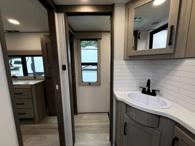 Any time spent in this spacious toy hauler will be time well spent! The 14' garage includes an overhead loft bed and a flip-up pet dish for your furry friends. If you're needing more sleeping space, you might want to choose the optional Liftsuite System and optional half bath. Once you enter in the main living area, you can relax on the L-shaped sofa with recline across from the fireplace, and there is a free-standing dinette if you want to play a game or two. The chef of your group will love the generous counter space in the kitchen, and the dual entry bath will let everyone stay clean throughout your trip! Head to the front master bedroom to enjoy the queen bed slide out with an optional king bed, a slide top dresser with TV prep, plus a large front closet, complete with washer and dryer prep!