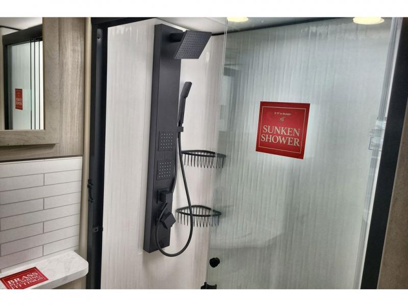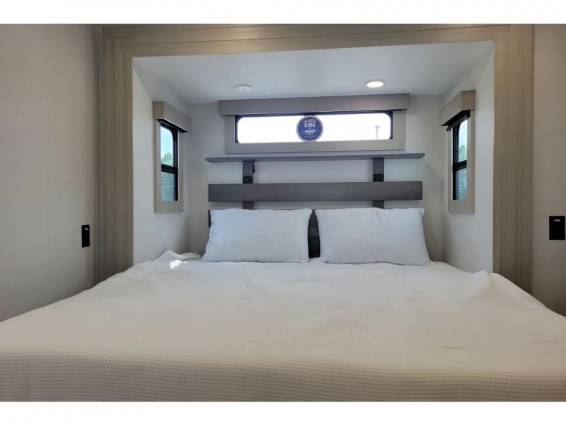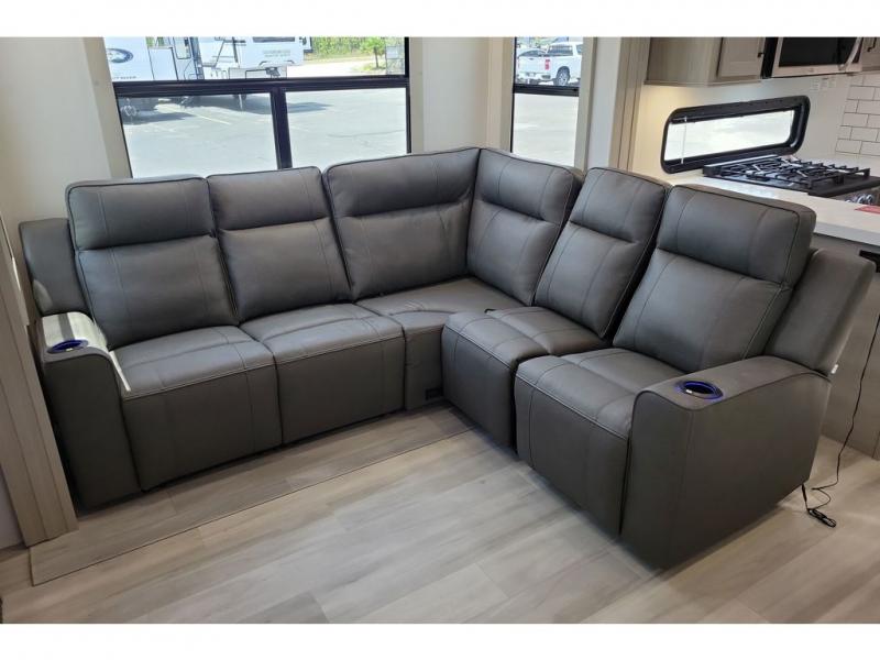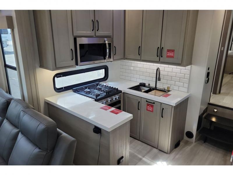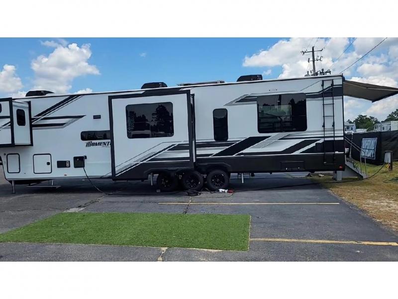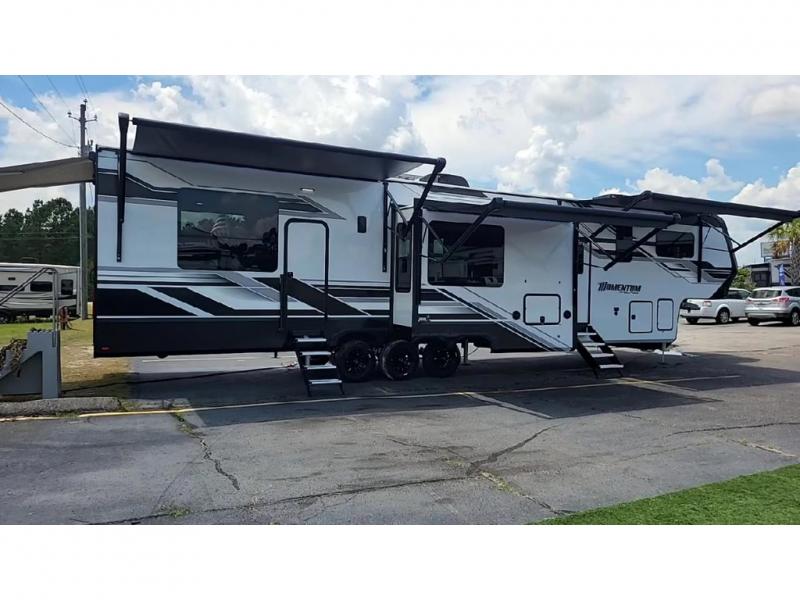 With any Momentum M-Class toy hauler by Grand Design, you will enjoy luxury at every turn! They have been constructed to a superior standard with a thermal roof design, triple insulated main floor and garage floor, and a Rail-Tite underbelly seal that will allow you to camp in all elements. Each model also features a, 8' 5" wide body chassis with a wide rail design, no wheel wheels, and a dovetail entry for easier loading. The Stealth A/C system provides maximum cooling power, and the CRE3000 suspension system means you can enjoy a smooth tow each time. You will love the luxurious interior with a professional grade stainless steel cooktop, interior color changing LED accent lighting, a fiberglass shower with a glass door, and solid surface countertops.