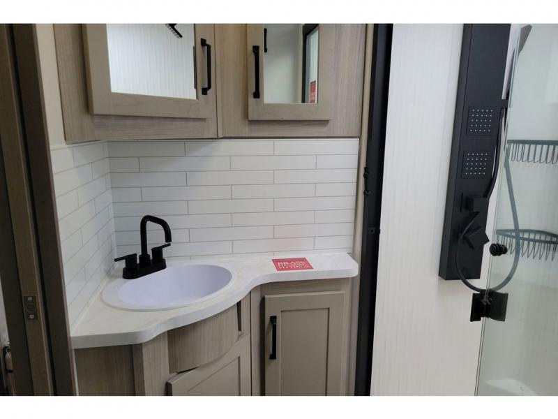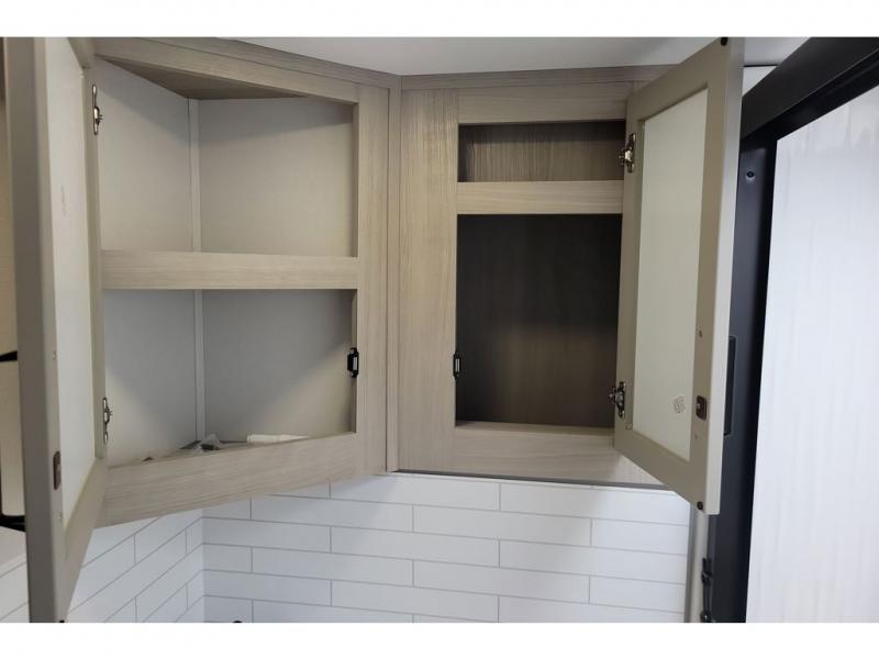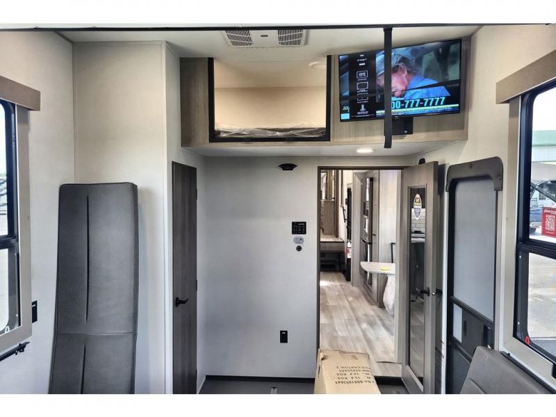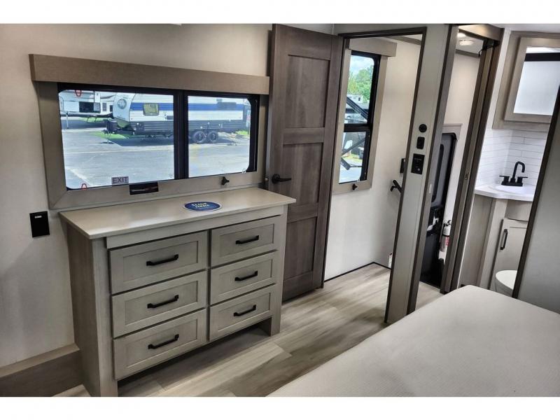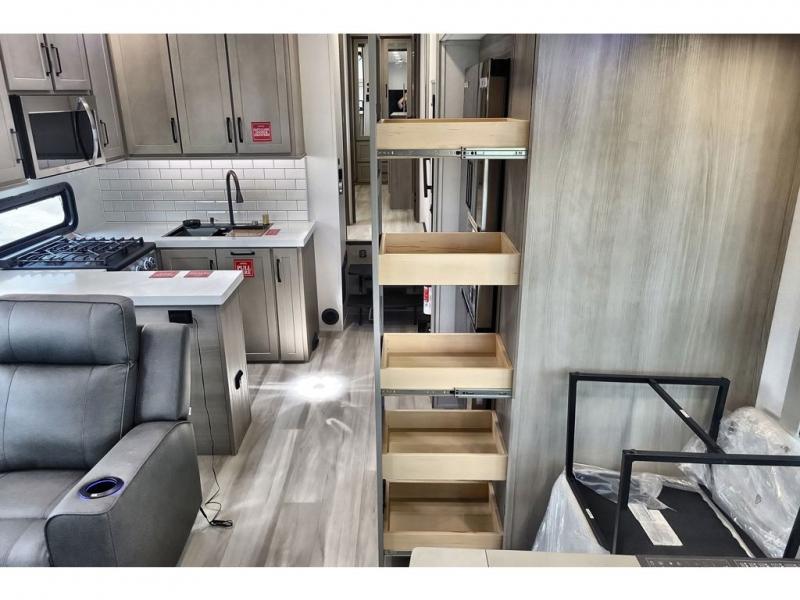 Any time spent in this spacious toy hauler will be time well spent! The 14' garage includes an overhead loft bed and a flip-up pet dish for your furry friends. If you're needing more sleeping space, you might want to choose the optional Liftsuite System and optional half bath. Once you enter in the main living area, you can relax on the L-shaped sofa with recline across from the fireplace, and there is a free-standing dinette if you want to play a game or two. The chef of your group will love the generous counter space in the kitchen, and the dual entry bath will let everyone stay clean throughout your trip! Head to the front master bedroom to enjoy the queen bed slide out with an optional king bed, a slide top dresser with TV prep, plus a large front closet, complete with washer and dryer prep!