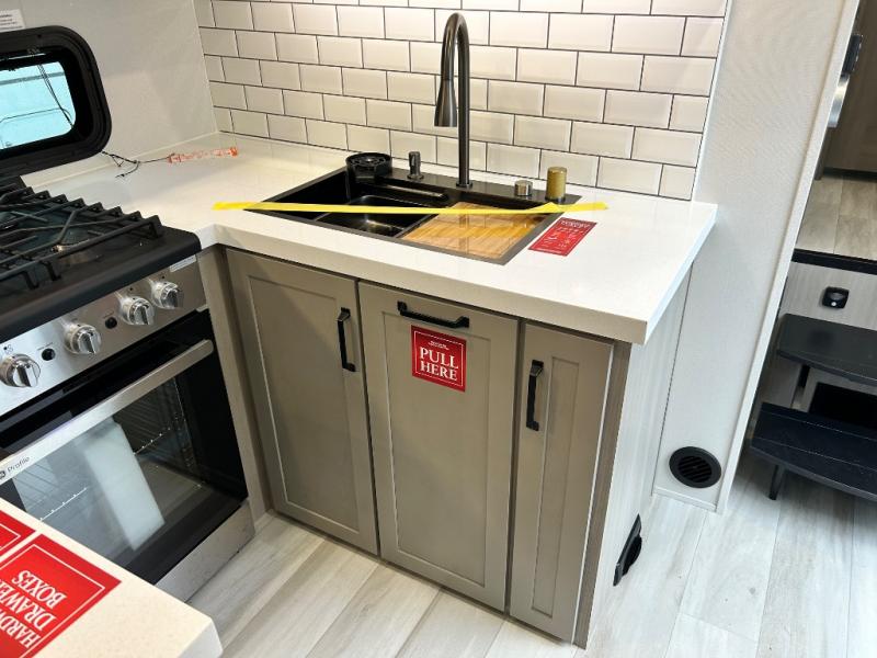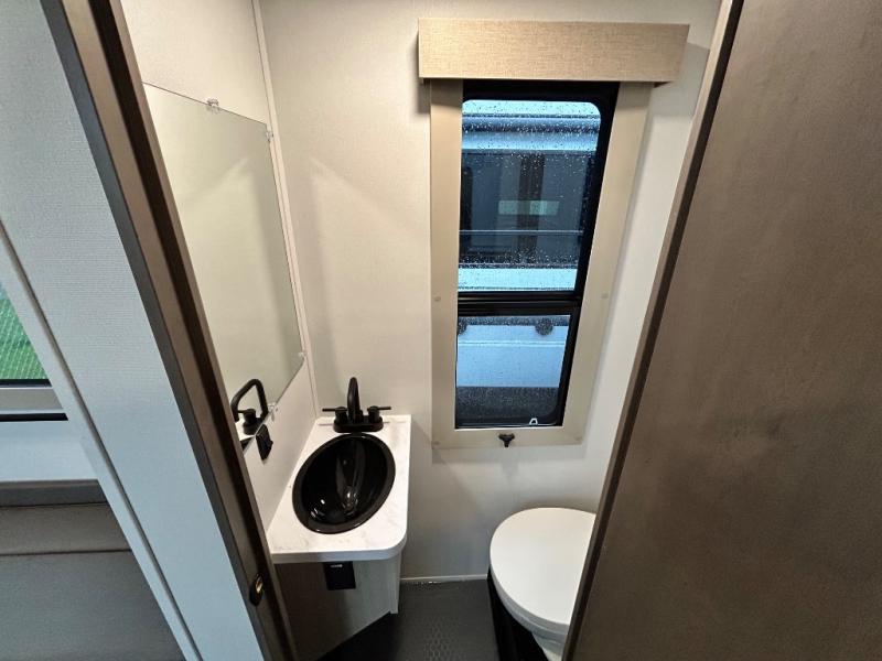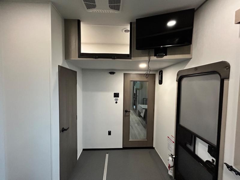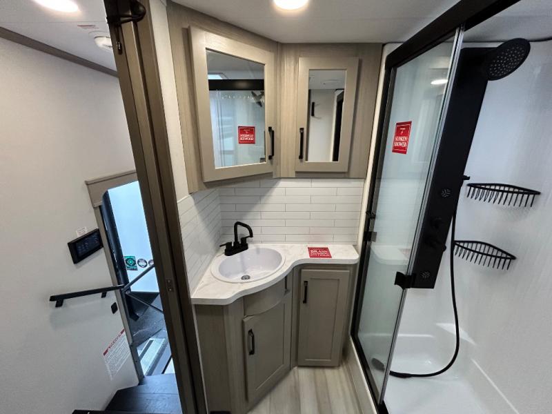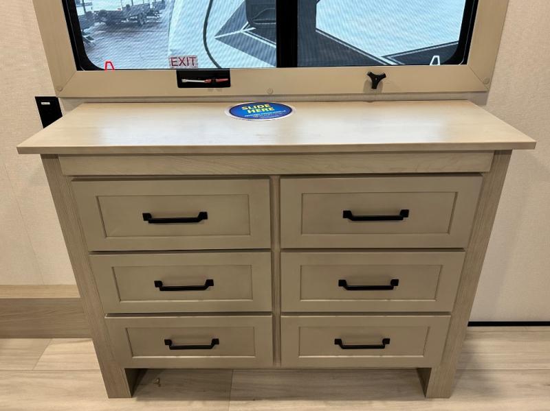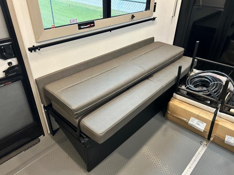 Any time spent in this spacious toy hauler will be time well spent! The 14' garage includes an overhead loft bed and a flip-up pet dish for your furry friends. If you're needing more sleeping space, you might want to choose the optional Liftsuite System and optional half bath. Once you enter in the main living area, you can relax on the L-shaped sofa with recline across from the fireplace, and there is a free-standing dinette if you want to play a game or two. The chef of your group will love the generous counter space in the kitchen, and the dual entry bath will let everyone stay clean throughout your trip! Head to the front master bedroom to enjoy the queen bed slide out with an optional king bed, a slide top dresser with TV prep, plus a large front closet, complete with washer and dryer prep!