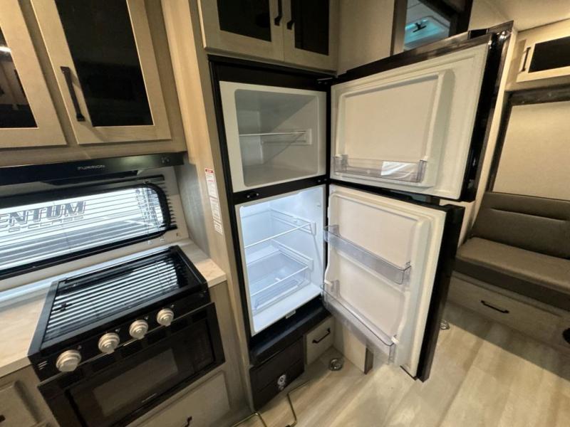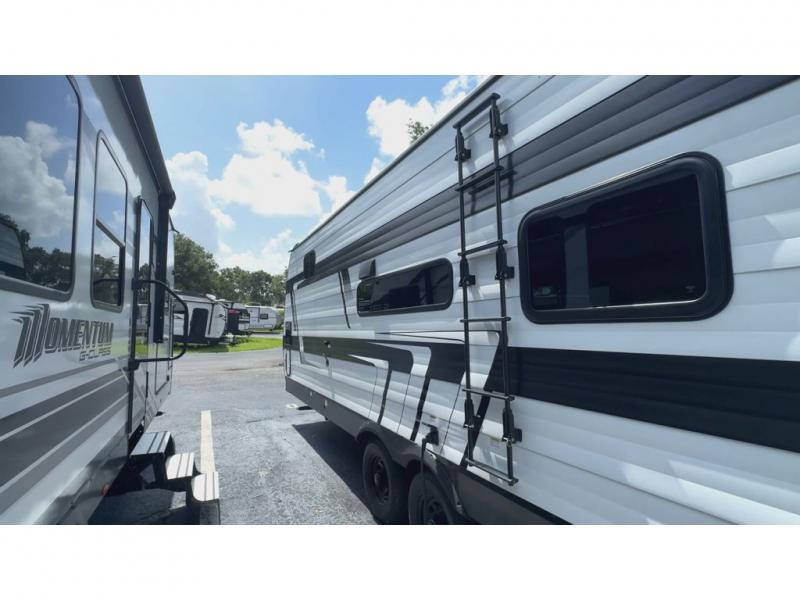 The Momentum MAV toy hauler travel trailers by Grand Design are designed to provide exactly what you need. The spacious garage provides tons of cargo space, with no wheel wells to get in the way. Additional storage includes magnetic storage door catches, and overhead consoles throughout. Conveniences like motion sensor lights and USB outlets will make your life easier, and you will be comfortable in all seasons with the 30K BTU furnace plus 15K BTU ducted air conditioning. The standard Solar Package comes with a 180W solar panel, a 40 Amp charge controller with Bluetooth, and a 12V refrigerator so you can go off-grid when the adventure calls for it.