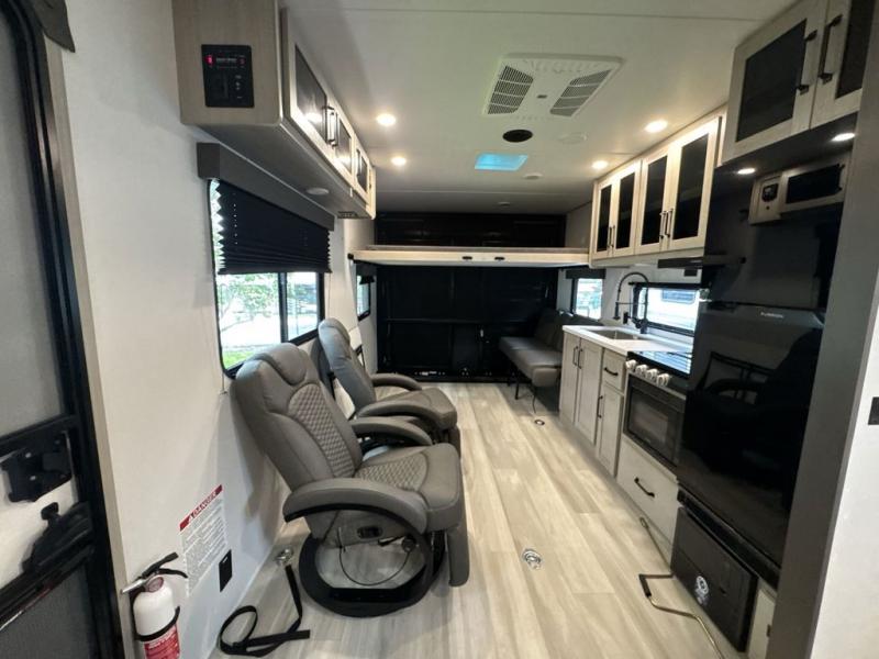 Head for the lake in this toy hauler that can sleep five campers each night. Your crew can relax on the rollover sofa with a table, and the top bed will be perfect for your guests to sleep on. The front corner queen Murphy bed includes drawers to store clothes, plus overhead storage for personal belongings. In the morning, you can prepare breakfast on the three burner range with an oven, pour yourself milk from the 12V 8 cu. ft. refrigerator, then relax on the dual Euro chairs. This model also includes a patio with a pull down screen to let fresh air in without letting the bugs in!