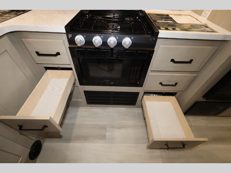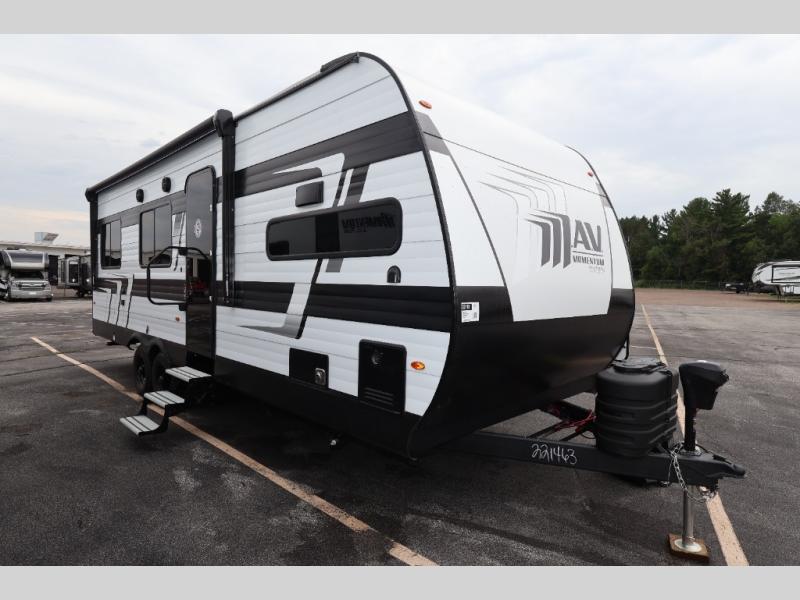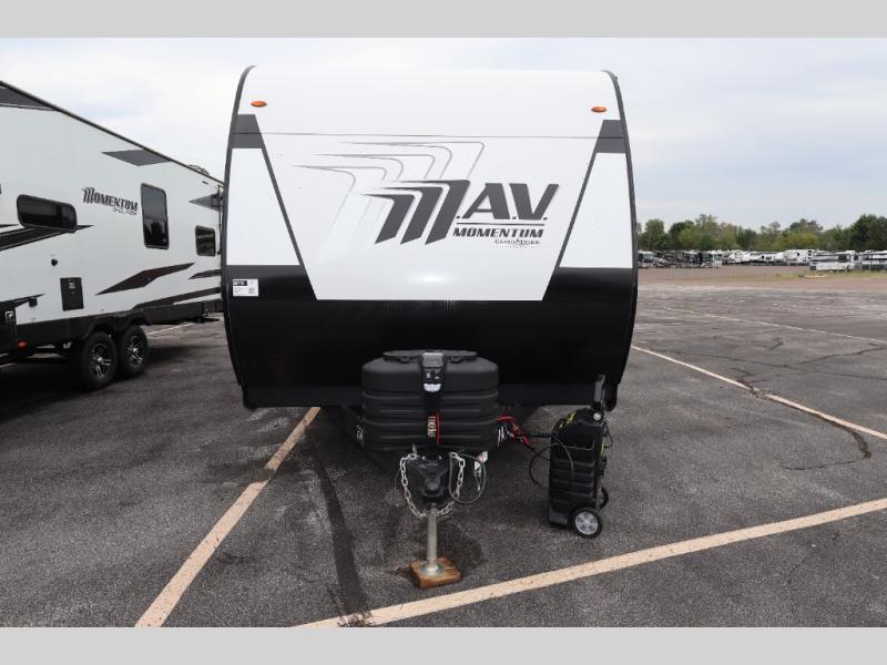 The Momentum MAV toy hauler travel trailers by Grand Design are designed to provide exactly what you need. The spacious garage provides tons of cargo space, with no wheel wells to get in the way. Additional storage includes magnetic storage door catches, underbed storage with a gas strut lift, and overhead consoles throughout. Conveniences like motion sensor lights and USB outlets will make your life easier, and you will be comfortable in all seasons with the 30K BTU furnace plus 15K BTU ducted air conditioning. The standard Solar Package comes with a 180W solar panel, a 40 Amp charge controller with Bluetooth, and a 12V refrigerator so you can go off-grid when the adventure calls for it.