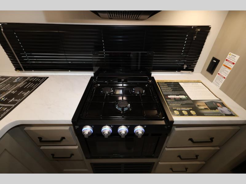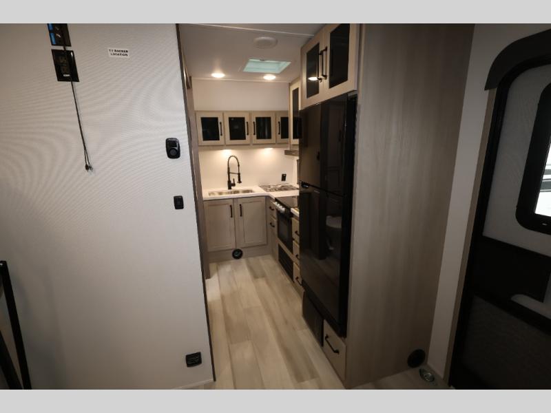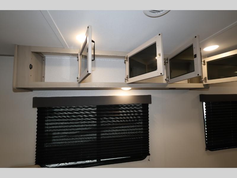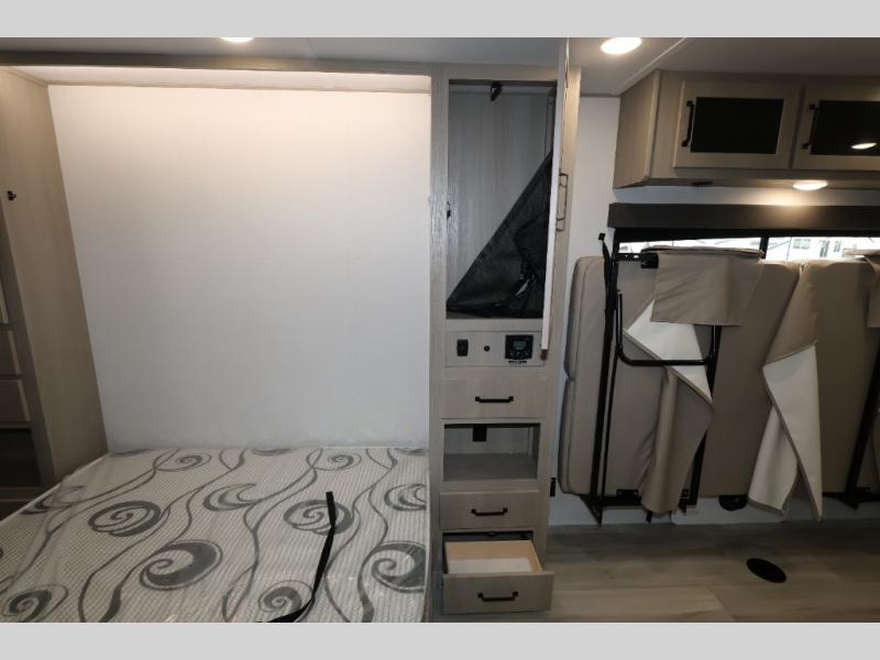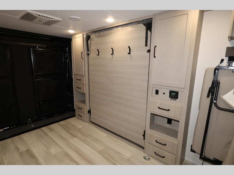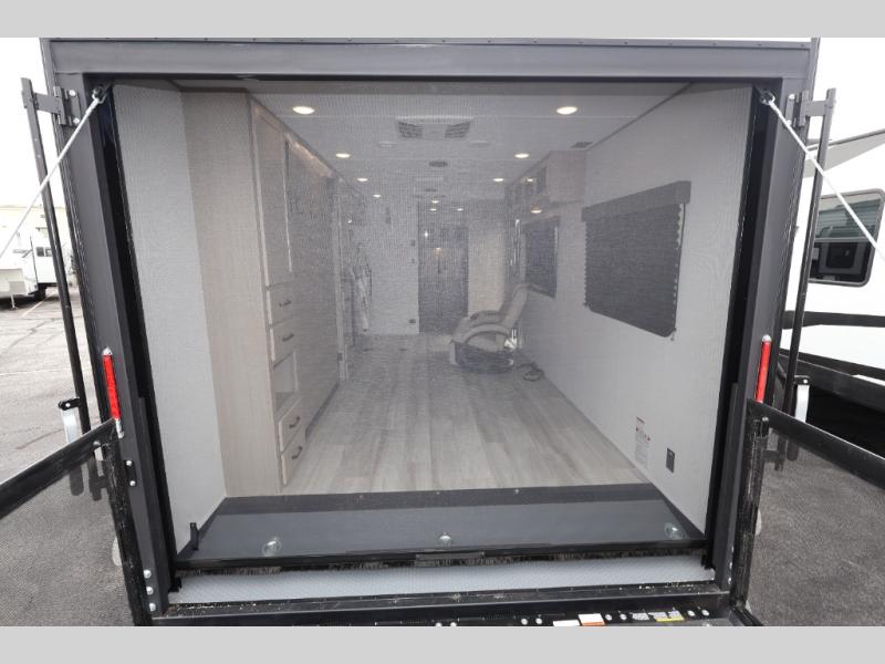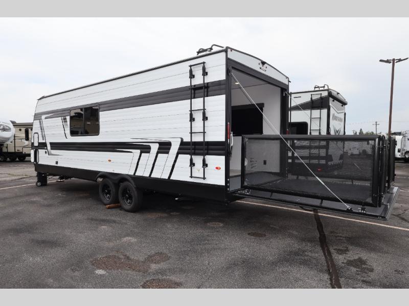 This is the perfect toy hauler for two campers looking for adventure! Once your toys are unloaded using the ramp door, you will enjoy the patio system that will provide more living space. The queen Murphy bed will provide seating and sleeping space, and there is TV prep across from the bed if you want the option to watch movies in bed. Head to the front corner kitchen to make lunch on the three burner range, and leftovers can go in the 8 cu. ft. 12V refrigerator. You'll find the full bath in the other front corner, which will allow you to freshen up after a day of trail riding! This model also includes a fold-up dinette where you can dine each day, or you can take your plate outdoors to sit under the 17' power awning!