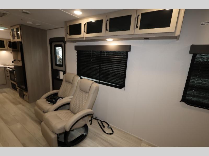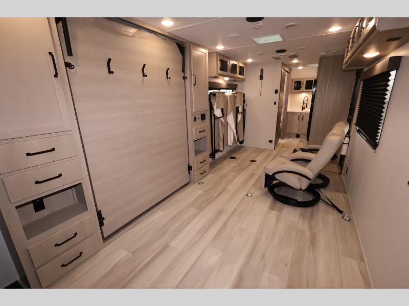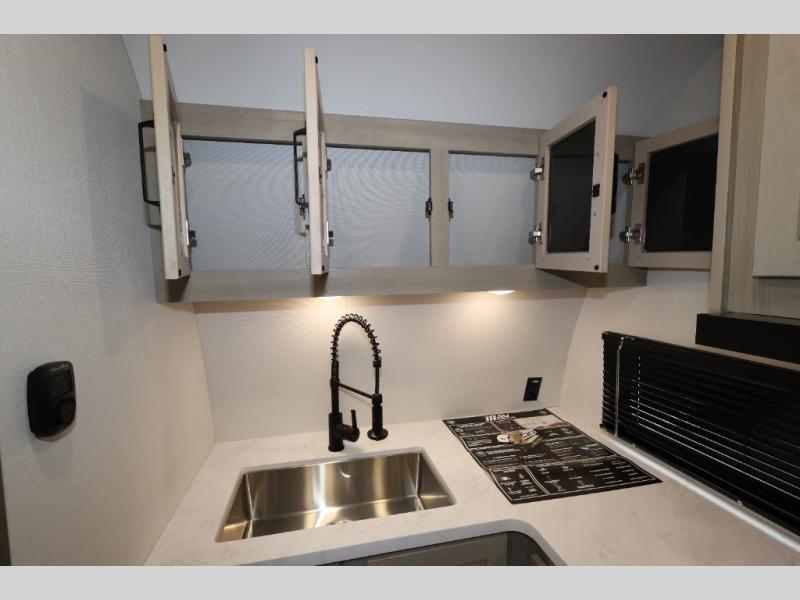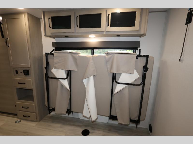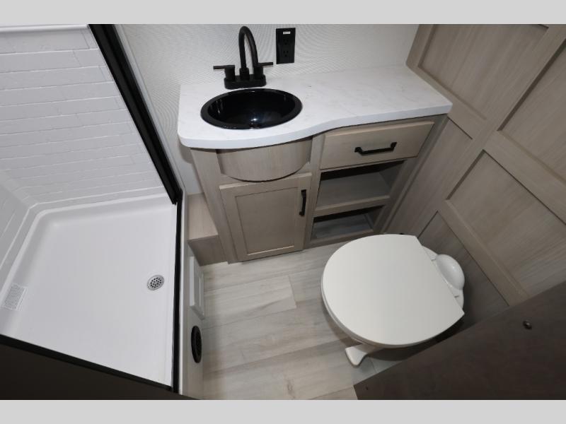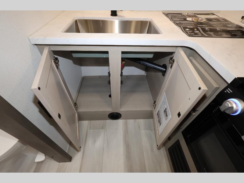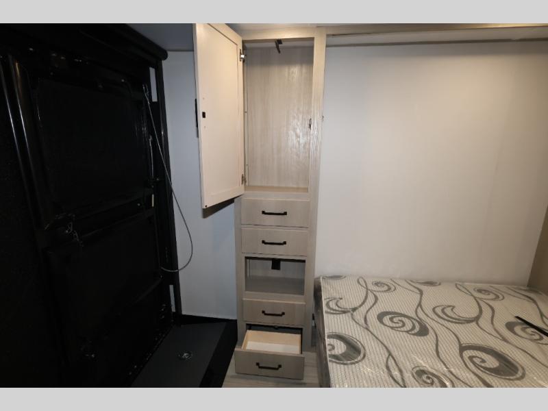 This is the perfect toy hauler for two campers looking for adventure! Once your toys are unloaded using the ramp door, you will enjoy the patio system that will provide more living space. The queen Murphy bed will provide seating and sleeping space, and there is TV prep across from the bed if you want the option to watch movies in bed. Head to the front corner kitchen to make lunch on the three burner range, and leftovers can go in the 8 cu. ft. 12V refrigerator. You'll find the full bath in the other front corner, which will allow you to freshen up after a day of trail riding! This model also includes a fold-up dinette where you can dine each day, or you can take your plate outdoors to sit under the 17' power awning!
