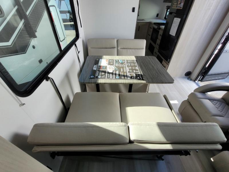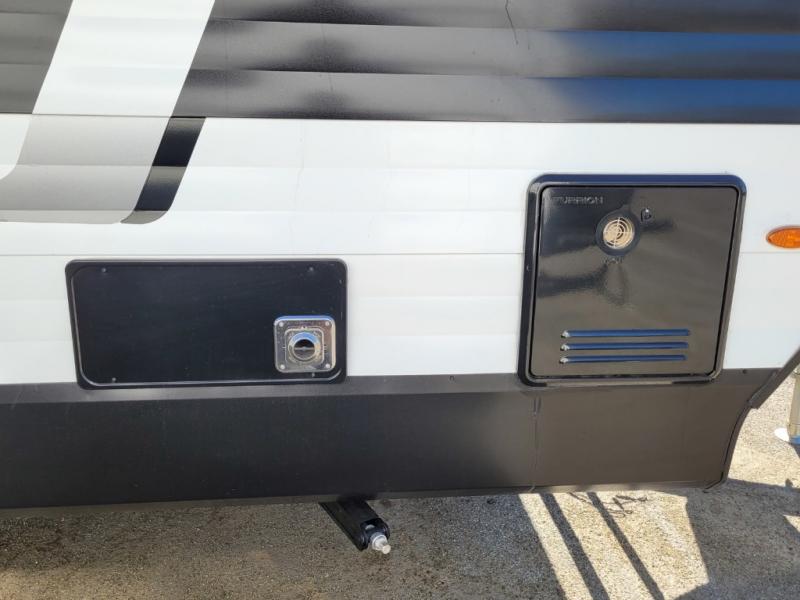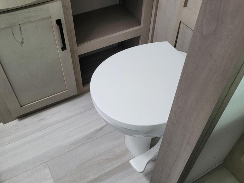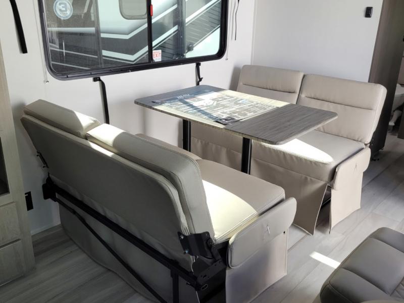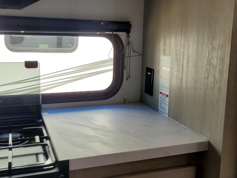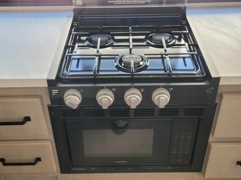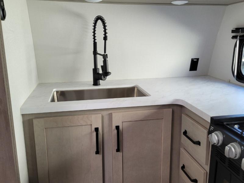 This is the perfect toy hauler for two campers looking for adventure! Once your toys are unloaded using the ramp door, you will enjoy the patio system that will provide more living space. The queen Murphy bed will provide seating and sleeping space, and there is TV prep across from the bed if you want the option to watch movies in bed. Head to the front corner kitchen to make lunch on the three burner range, and leftovers can go in the 8 cu. ft. 12V refrigerator. You'll find the full bath in the other front corner, which will allow you to freshen up after a day of trail riding! This model also includes a fold-up dinette where you can dine each day, or you can take your plate outdoors to sit under the 17' power awning!