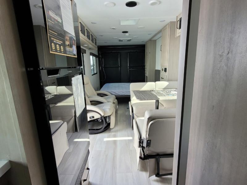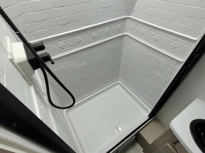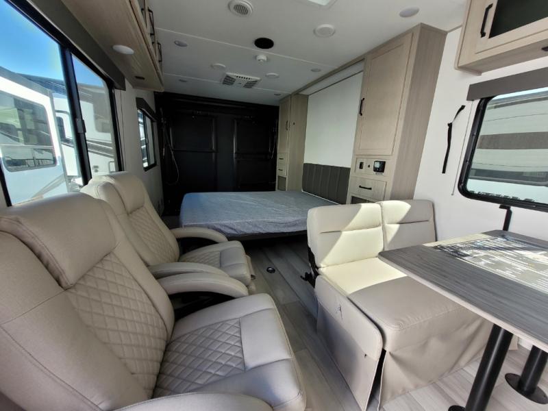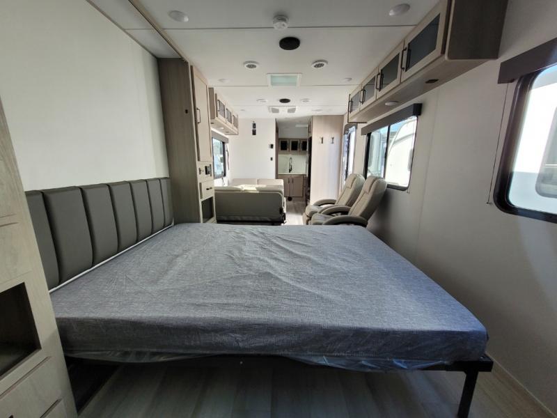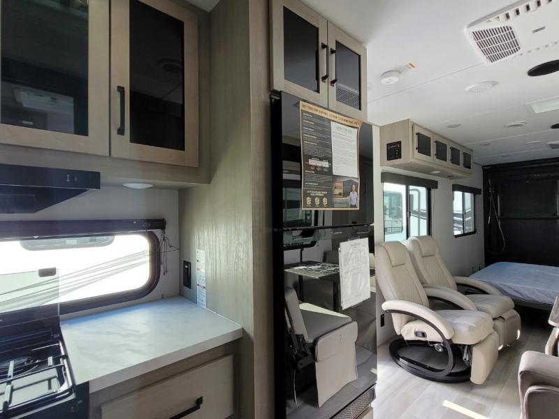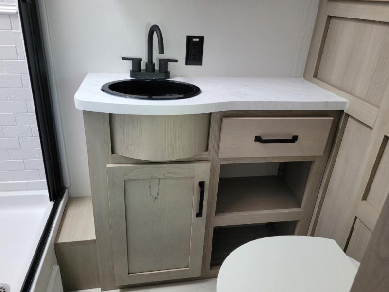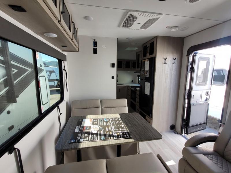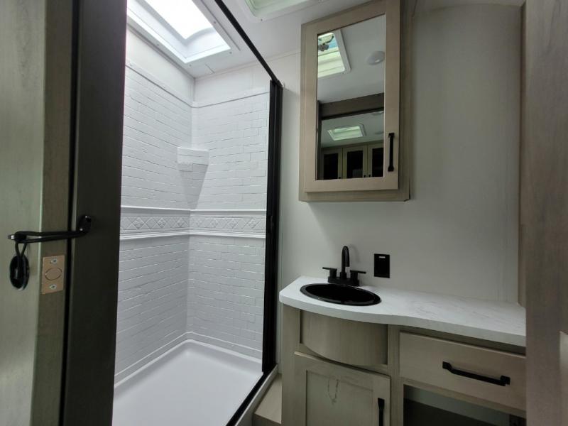 This is the perfect toy hauler for two campers looking for adventure! Once your toys are unloaded using the ramp door, you will enjoy the patio system that will provide more living space. The queen Murphy bed will provide seating and sleeping space, and there is TV prep across from the bed if you want the option to watch movies in bed. Head to the front corner kitchen to make lunch on the three burner range, and leftovers can go in the 8 cu. ft. 12V refrigerator. You'll find the full bath in the other front corner, which will allow you to freshen up after a day of trail riding! This model also includes a fold-up dinette where you can dine each day, or you can take your plate outdoors to sit under the 17' power awning!
