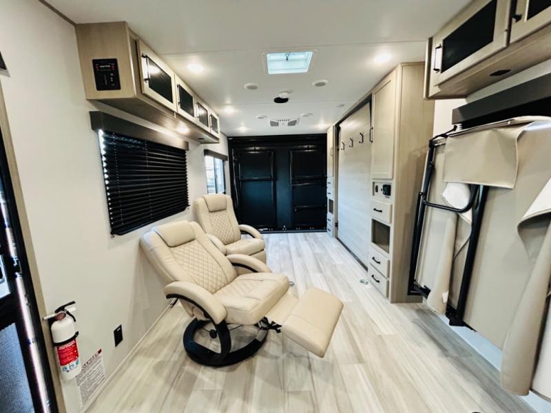This is the perfect toy hauler for two campers looking for adventure! Once your toys are unloaded using the ramp door, you will enjoy the patio system that will provide more living space. The queen Murphy bed will provide seating and sleeping space, and there is TV prep across from the bed if you want the option to watch movies in bed. Head to the front corner kitchen to make lunch on the three burner range, and leftovers can go in the 8 cu. ft. 12V refrigerator. You'll find the full bath in the other front corner, which will allow you to freshen up after a day of trail riding! This model also includes a fold-up dinette where you can dine each day, or you can take your plate outdoors to sit under the 17' power awning!