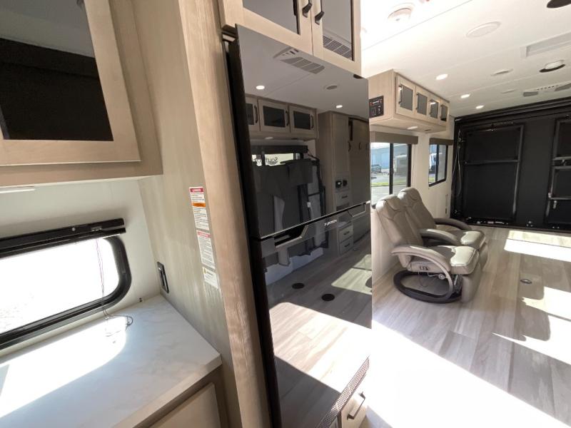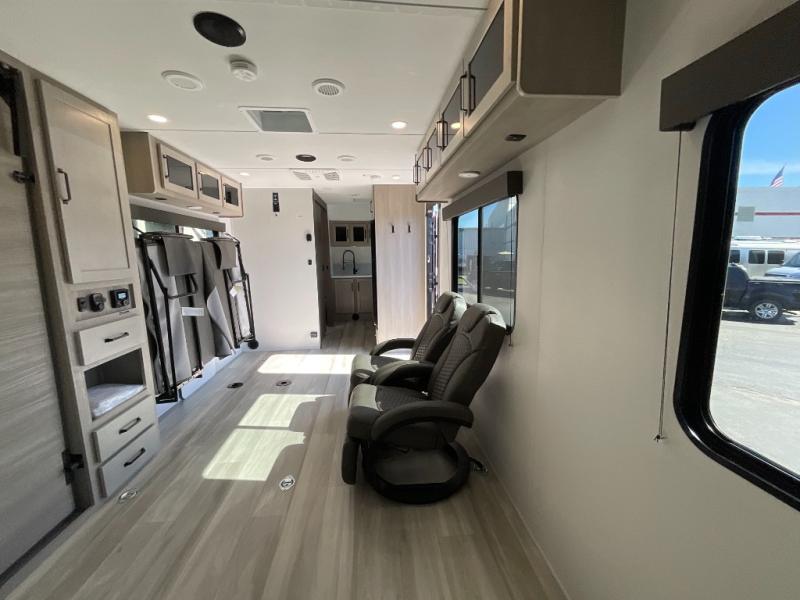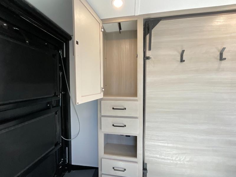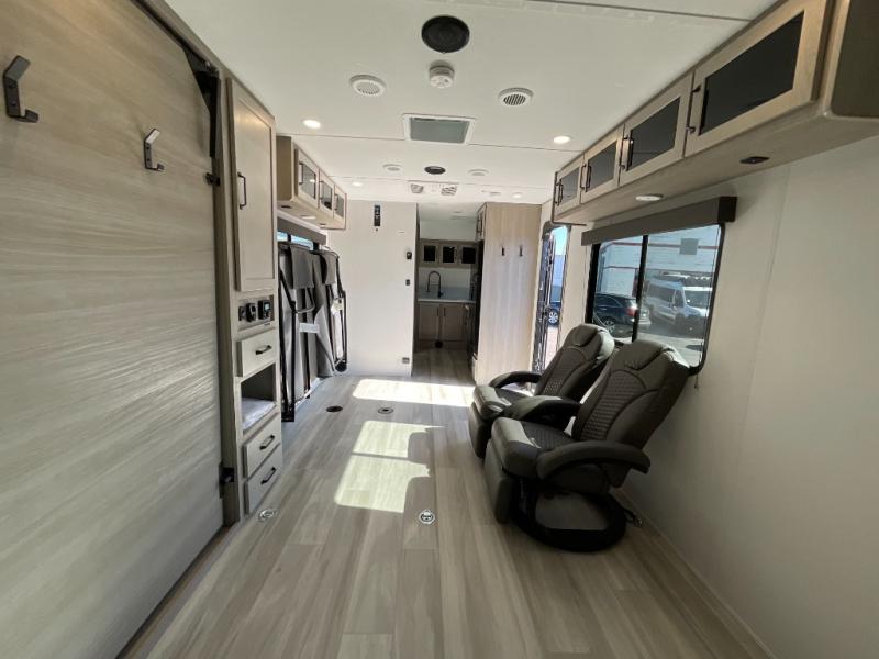 Inside, the Momentum MAV 24MAV focuses on smart design and practical comfort. The spacious garage area easily transforms into a flexible living space with rollover sofas, an optional queen bed lift, and tie-downs engineered to secure even the toughest equipment. The kitchen features premium appliances, plenty of countertop room, and cabinetry built to withstand real use. The front bedroom offers a private retreat with a comfortable queen bed, while the bathroom includes a residential-style shower and efficient layout that keeps everything accessible and organized.