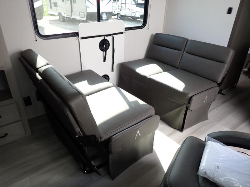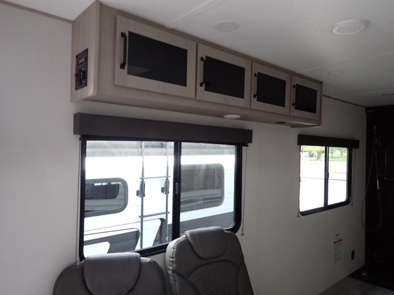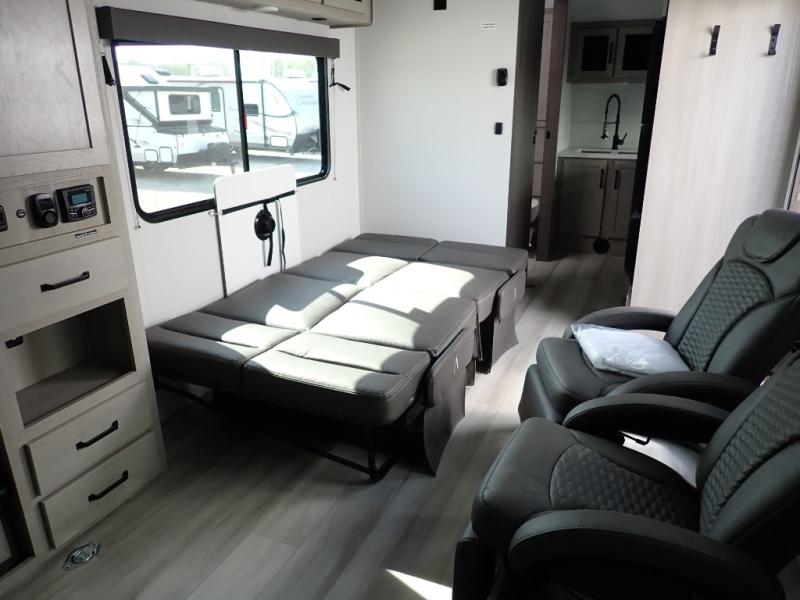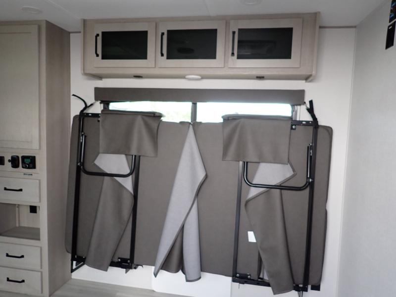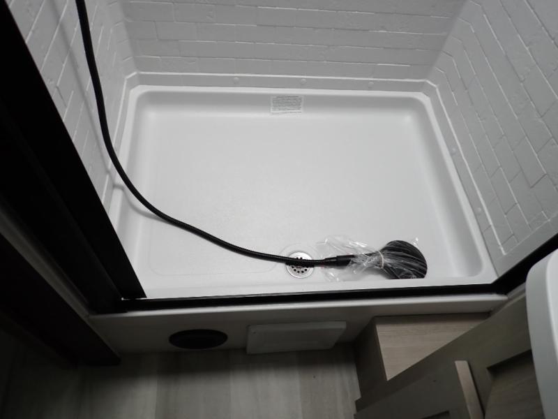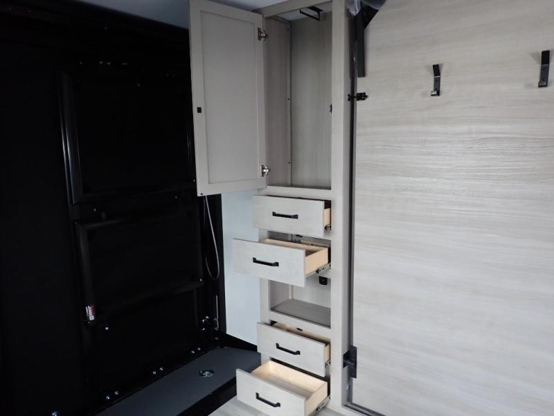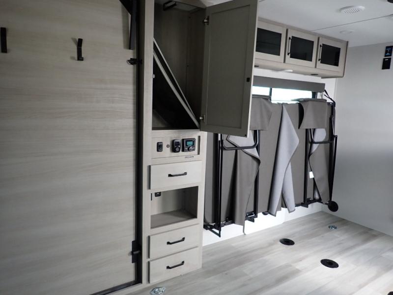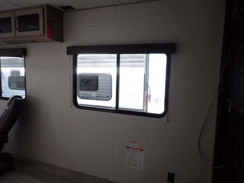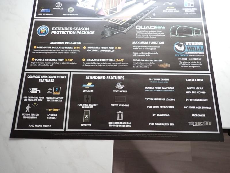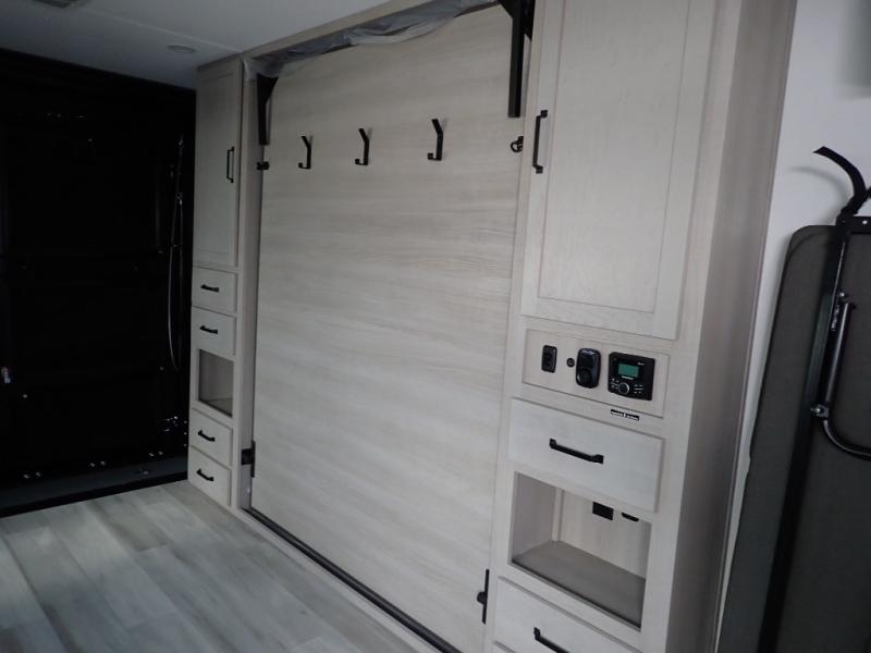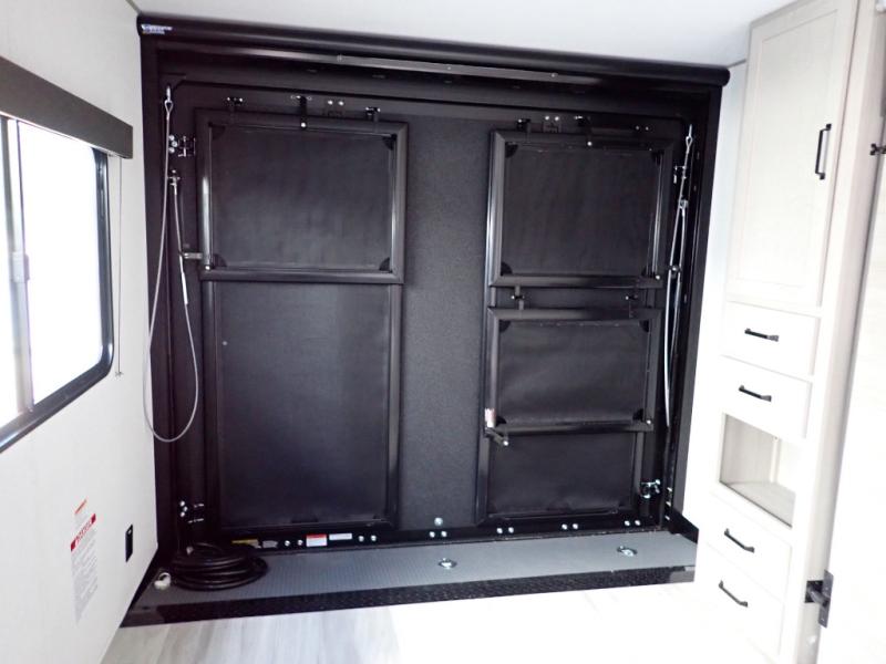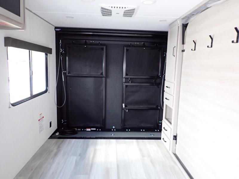 This is the perfect toy hauler for two campers looking for adventure! Once your toys are unloaded using the ramp door, you will enjoy the patio system that will provide more living space. The queen Murphy bed will provide seating and sleeping space, and there is TV prep across from the bed if you want the option to watch movies in bed. Head to the front corner kitchen to make lunch on the three burner range, and leftovers can go in the 8 cu. ft. 12V refrigerator. You'll find the full bath in the other front corner, which will allow you to freshen up after a day of trail riding! This model also includes a fold-up dinette where you can dine each day, or you can take your plate outdoors to sit under the 17' power awning!