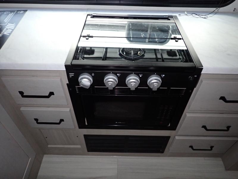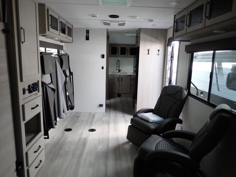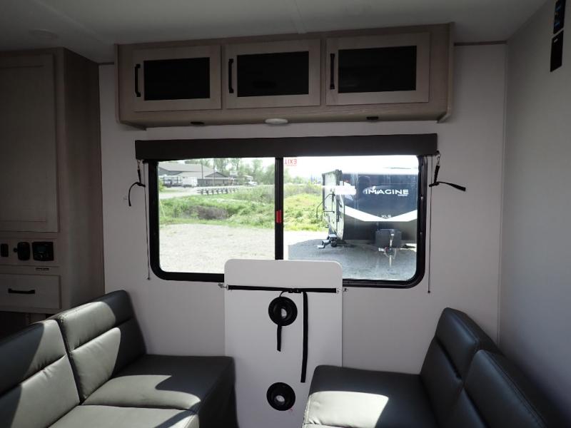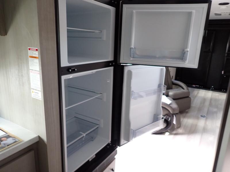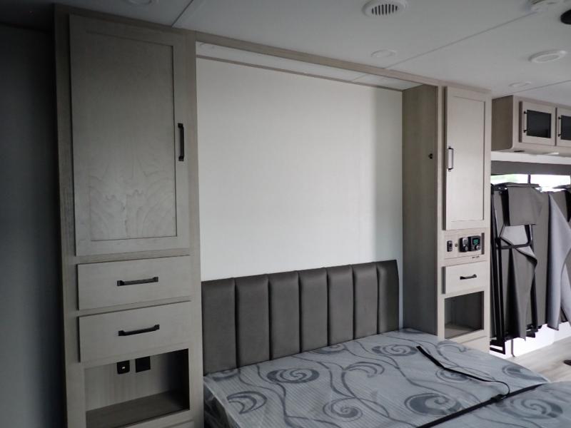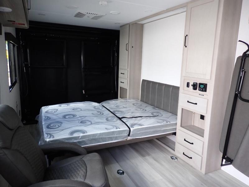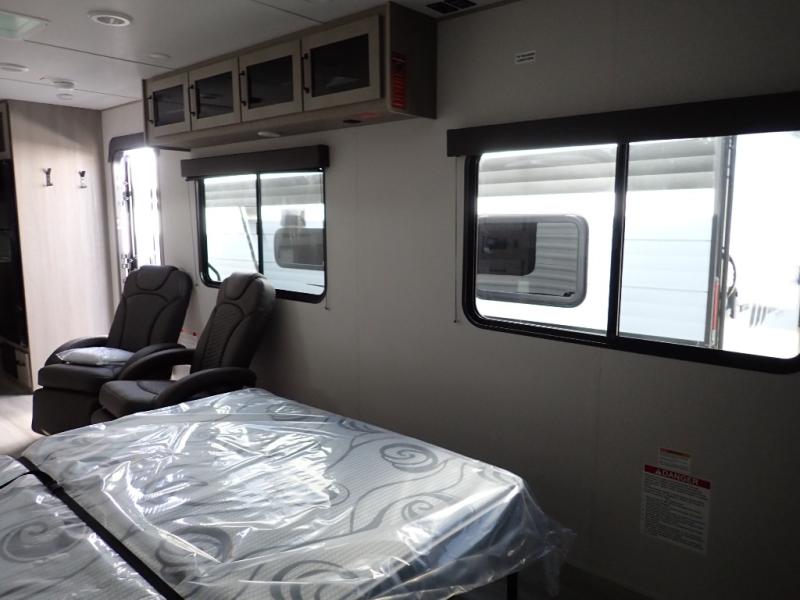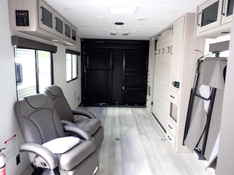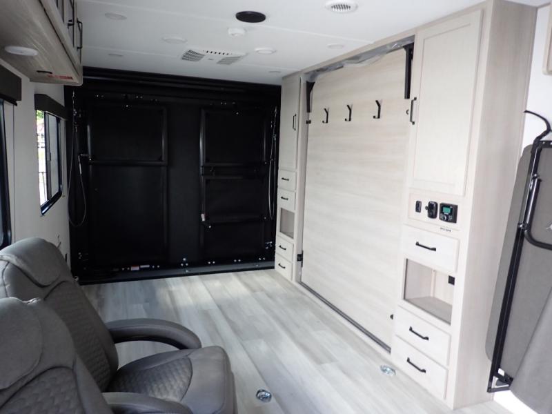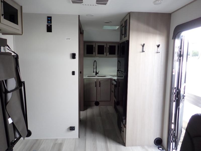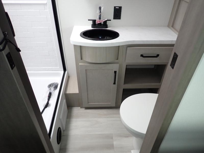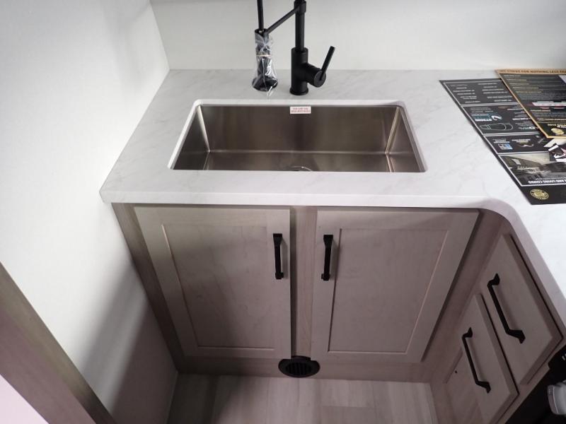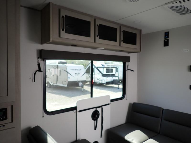 This is the perfect toy hauler for two campers looking for adventure! Once your toys are unloaded using the ramp door, you will enjoy the patio system that will provide more living space. The queen Murphy bed will provide seating and sleeping space, and there is TV prep across from the bed if you want the option to watch movies in bed. Head to the front corner kitchen to make lunch on the three burner range, and leftovers can go in the 8 cu. ft. 12V refrigerator. You'll find the full bath in the other front corner, which will allow you to freshen up after a day of trail riding! This model also includes a fold-up dinette where you can dine each day, or you can take your plate outdoors to sit under the 17' power awning!