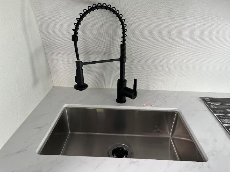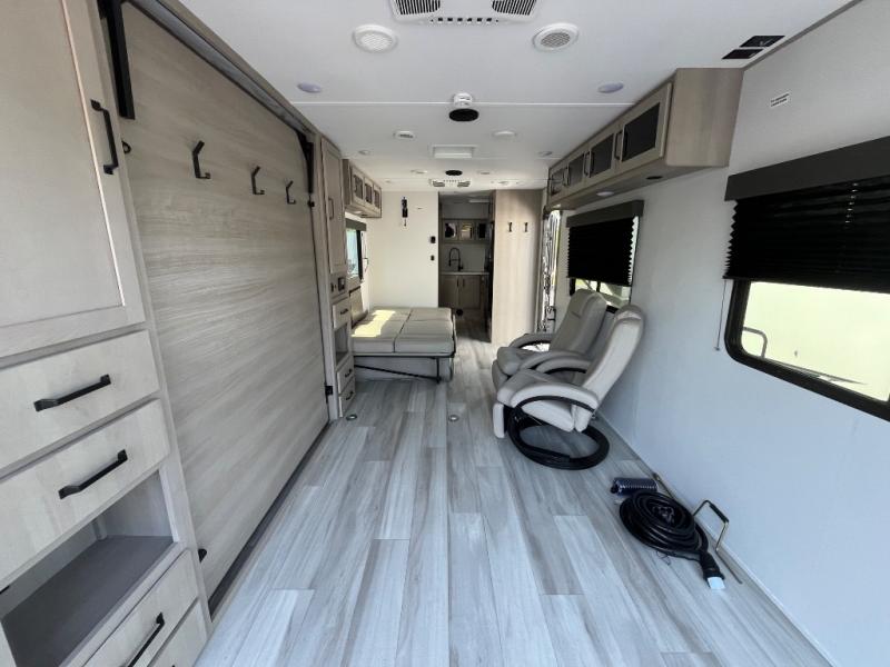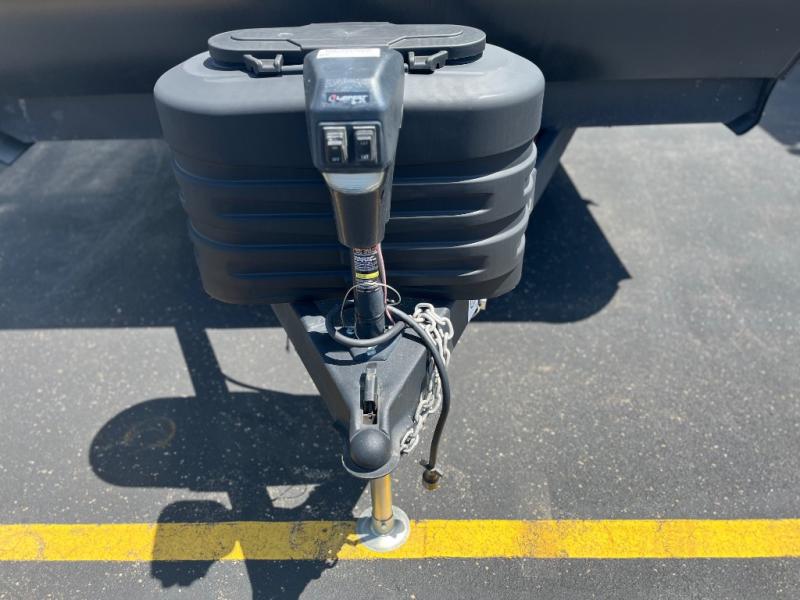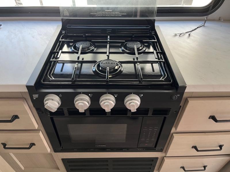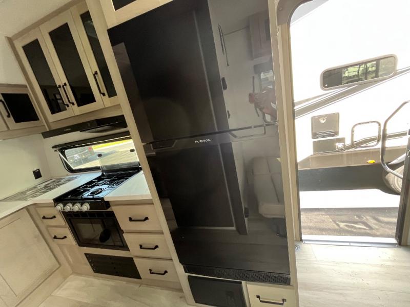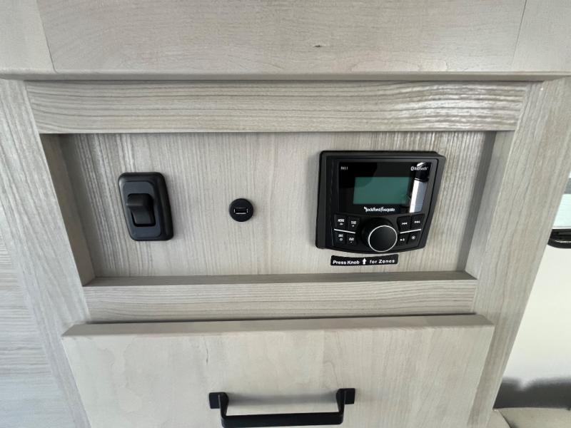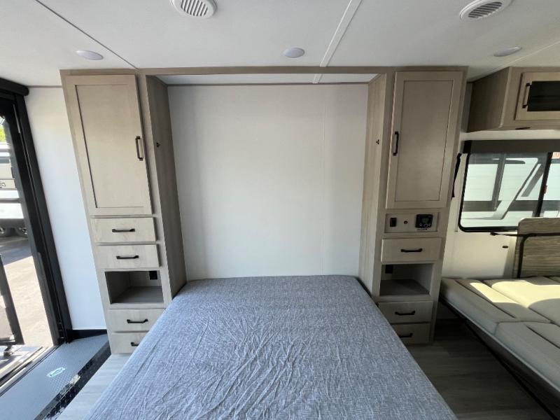 This is the perfect toy hauler for two campers looking for adventure! Once your toys are unloaded using the ramp door, you will enjoy the patio system that will provide more living space. The queen Murphy bed will provide seating and sleeping space, and there is TV prep across from the bed if you want the option to watch movies in bed. Head to the front corner kitchen to make lunch on the three burner range, and leftovers can go in the 8 cu. ft. 12V refrigerator. You'll find the full bath in the other front corner, which will allow you to freshen up after a day of trail riding! This model also includes a fold-up dinette where you can dine each day, or you can take your plate outdoors to sit under the 17' power awning!