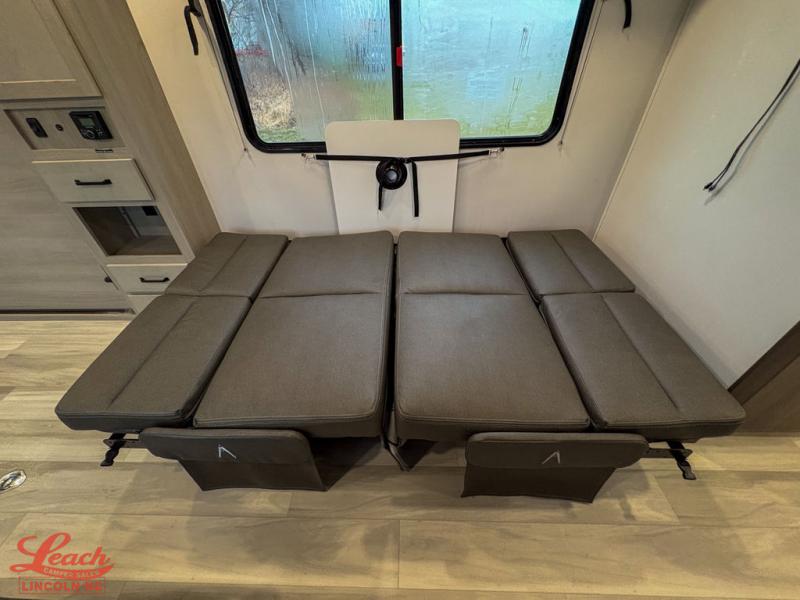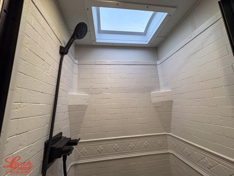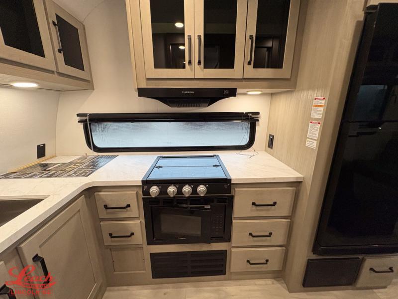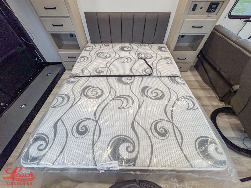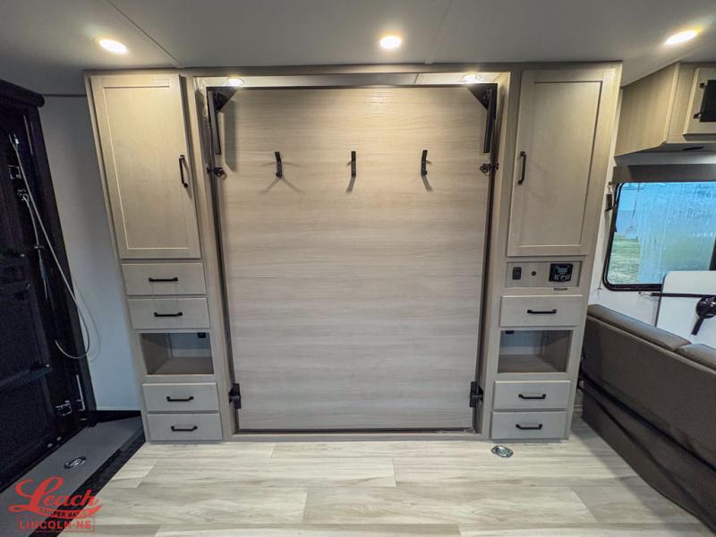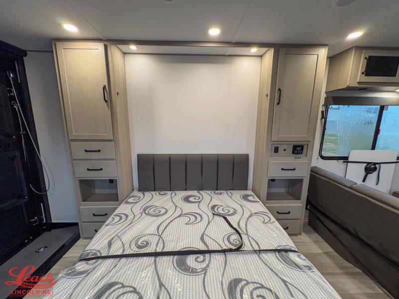 This is the perfect toy hauler for two campers looking for adventure! Once your toys are unloaded using the ramp door, you will enjoy the patio system that will provide more living space. The queen Murphy bed will provide seating and sleeping space, and there is TV prep across from the bed if you want the option to watch movies in bed. Head to the front corner kitchen to make lunch on the three burner range, and leftovers can go in the 8 cu. ft. 12V refrigerator. You'll find the full bath in the other front corner, which will allow you to freshen up after a day of trail riding! This model also includes a fold-up dinette where you can dine each day, or you can take your plate outdoors to sit under the 17' power awning!