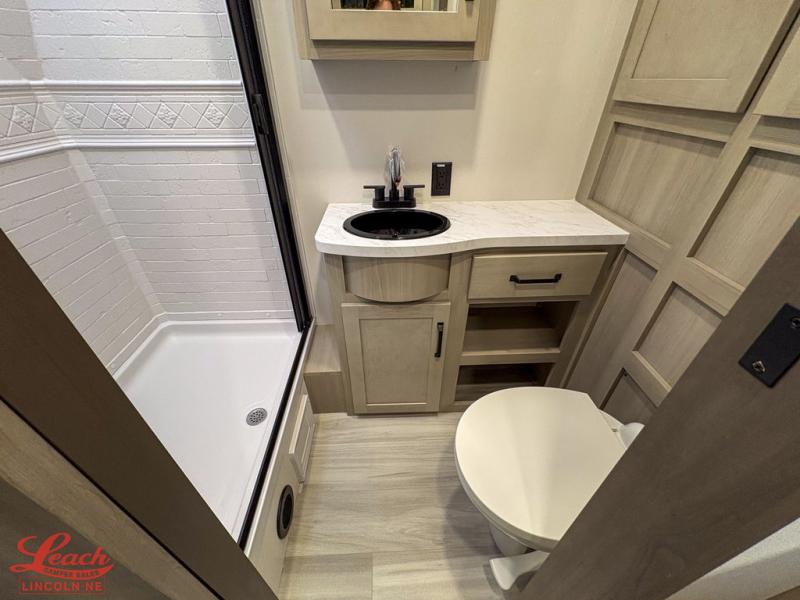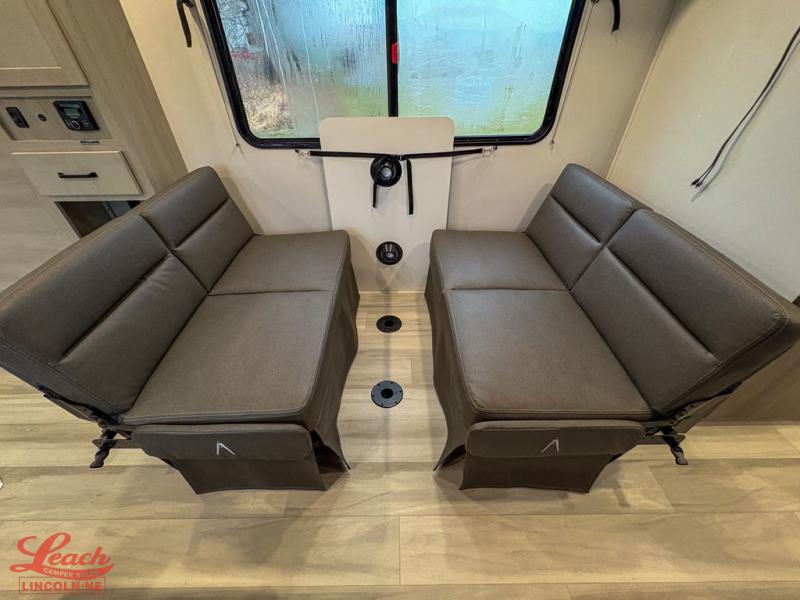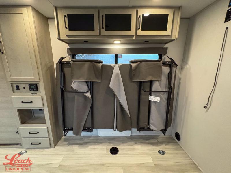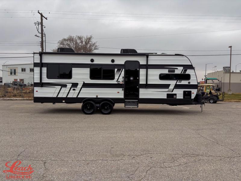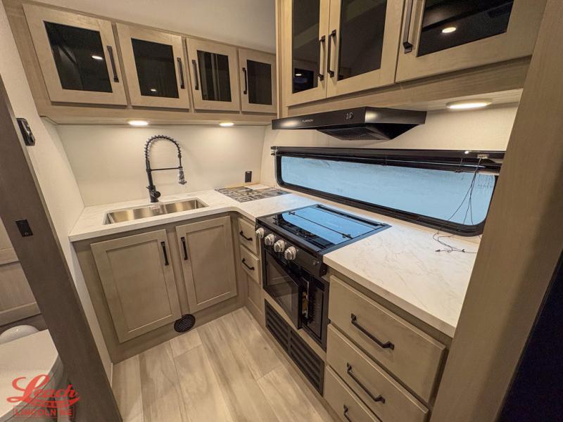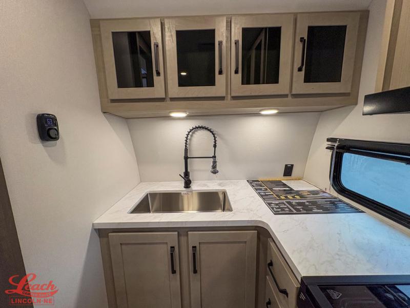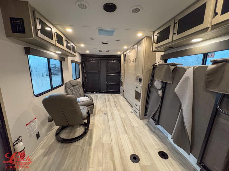This is the perfect toy hauler for two campers looking for adventure! Once your toys are unloaded using the ramp door, you will enjoy the patio system that will provide more living space. The queen Murphy bed will provide seating and sleeping space, and there is TV prep across from the bed if you want the option to watch movies in bed. Head to the front corner kitchen to make lunch on the three burner range, and leftovers can go in the 8 cu. ft. 12V refrigerator. You'll find the full bath in the other front corner, which will allow you to freshen up after a day of trail riding! This model also includes a fold-up dinette where you can dine each day, or you can take your plate outdoors to sit under the 17' power awning!