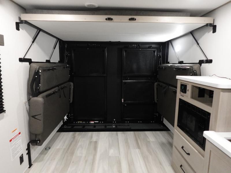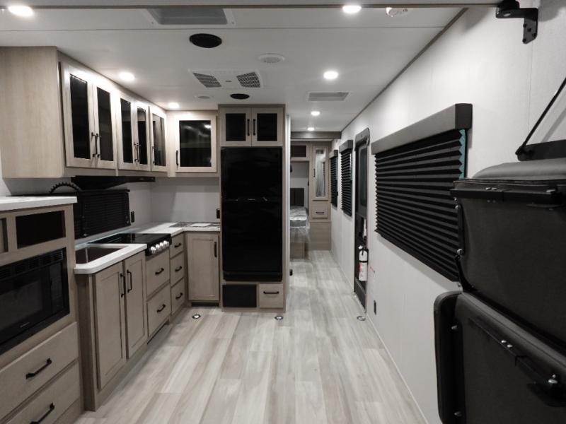 You will love this Momentum MAV toy hauler travel trailer! The front bedroom features a queen bed, and there is plenty of room to walk around. The sliding solid bedroom door helps with space. Overhead storage and a pair of nightstands are convenient storage, plus there is a wardrobe with both drawers and space to hang items. The kitchen offers a microwave, stainless steel sink, and an 8 cu. ft. 12V refrigerator. In the garage, you'll find rollover sofas with a table and a top bed for guests to sleep on. The ramp door/patio will provide additional living space once your toys are unloaded, and the pull down screen will keep bugs out!