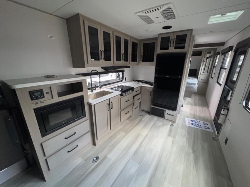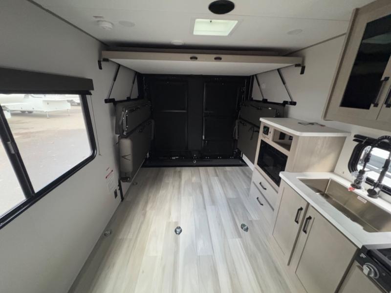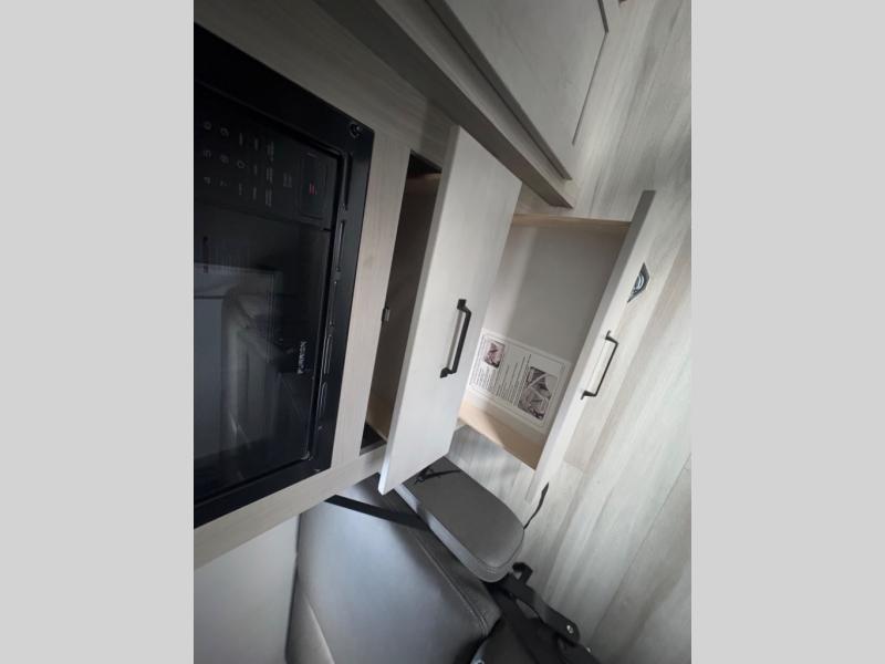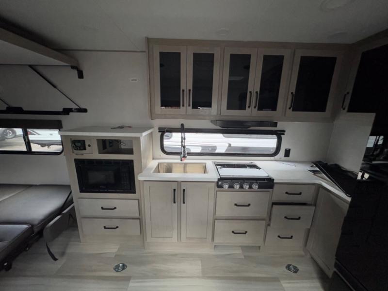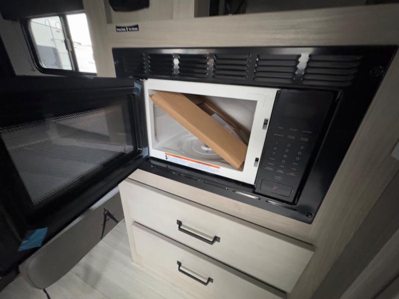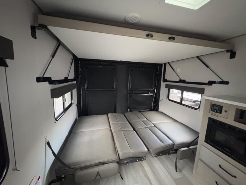 You will love this Momentum MAV toy hauler travel trailer! The front bedroom features a queen bed, and there is plenty of room to walk around. The sliding solid bedroom door helps with space. Overhead storage and a pair of nightstands are convenient storage, plus there is a wardrobe with both drawers and space to hang items. The kitchen offers a microwave, stainless steel sink, and an 8 cu. ft. 12V refrigerator. In the garage, you'll find rollover sofas with a table and a top bed for guests to sleep on. The ramp door/patio will provide additional living space once your toys are unloaded, and the pull down screen will keep bugs out!