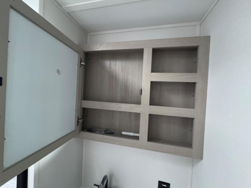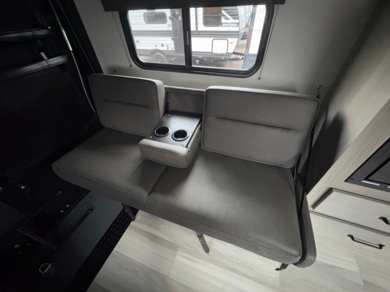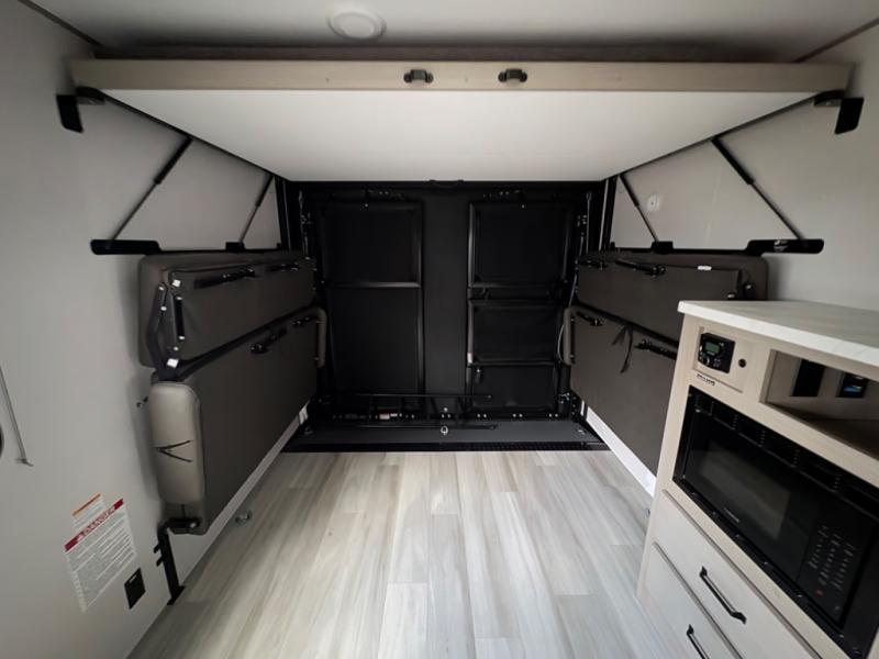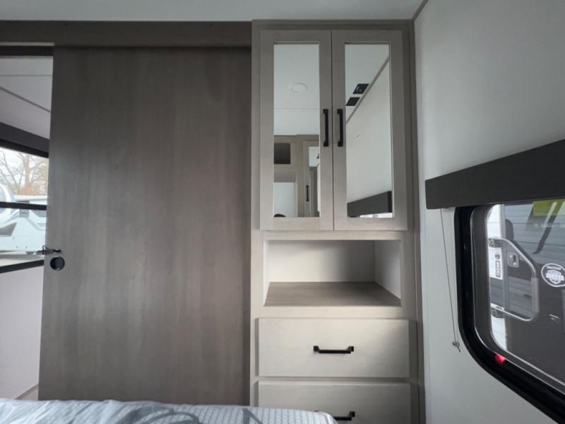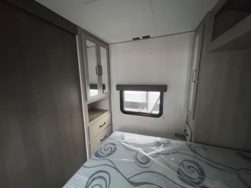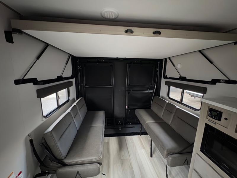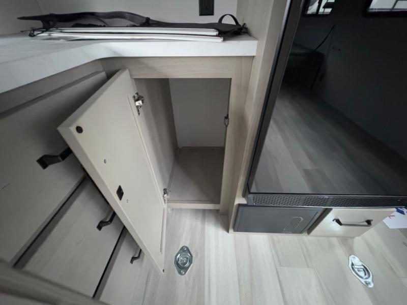 You will love this Momentum MAV toy hauler travel trailer! The front bedroom features a queen bed, and there is plenty of room to walk around. The sliding solid bedroom door helps with space. Overhead storage and a pair of nightstands are convenient storage, plus there is a wardrobe with both drawers and space to hang items. The kitchen offers a microwave, stainless steel sink, and an 8 cu. ft. 12V refrigerator. In the garage, you'll find rollover sofas with a table and a top bed for guests to sleep on. The ramp door/patio will provide additional living space once your toys are unloaded, and the pull down screen will keep bugs out!