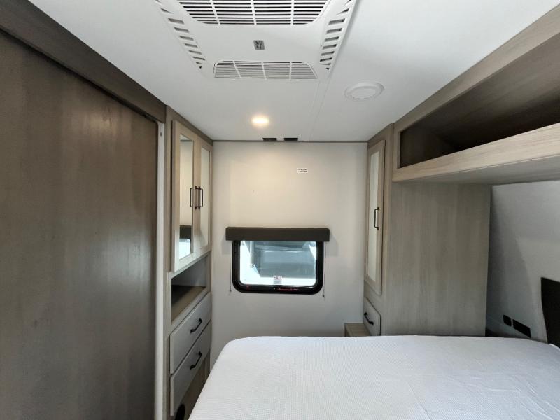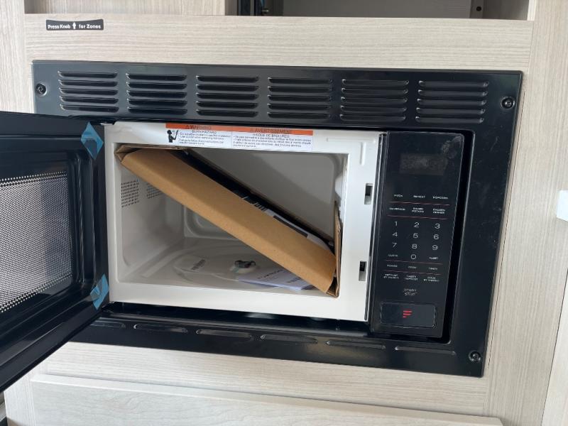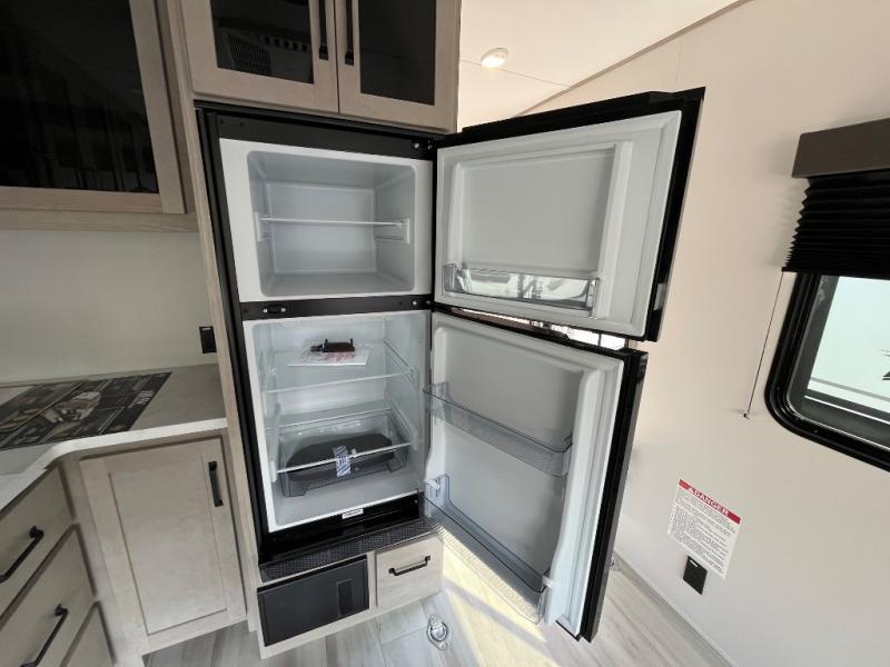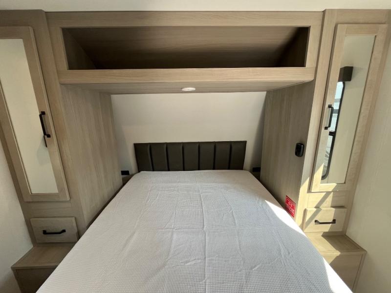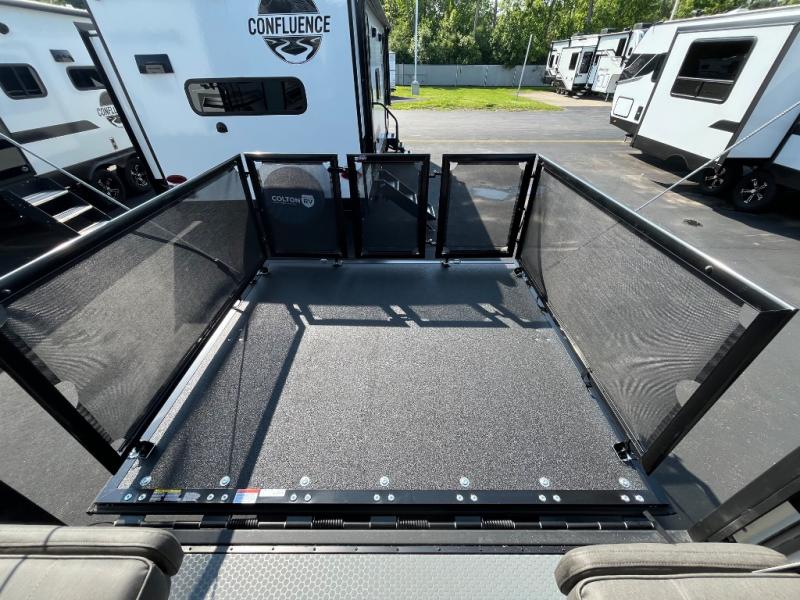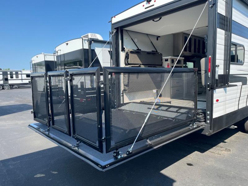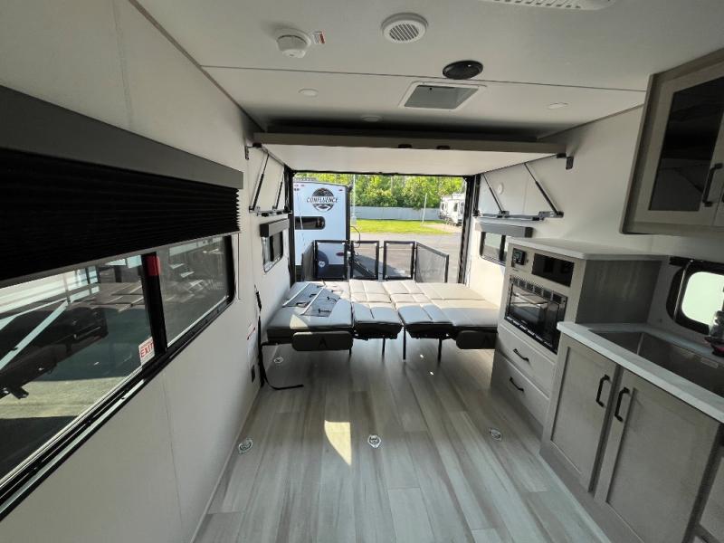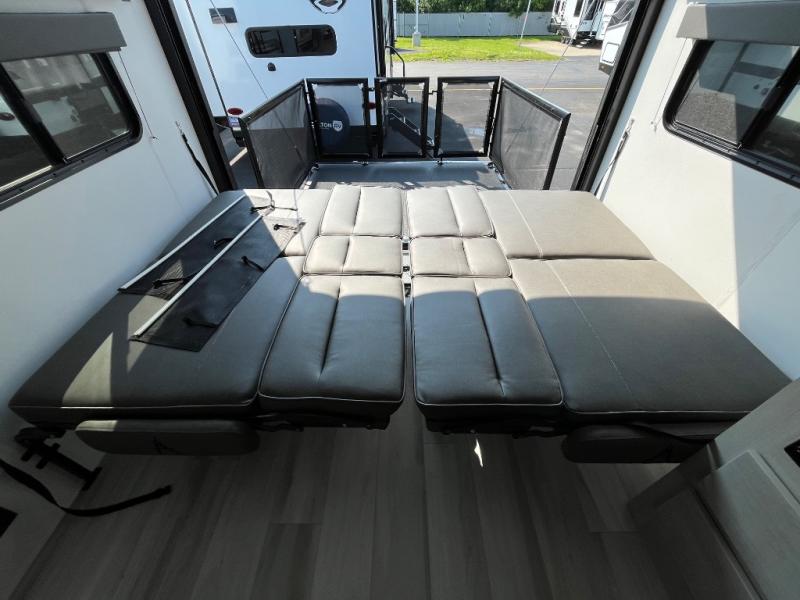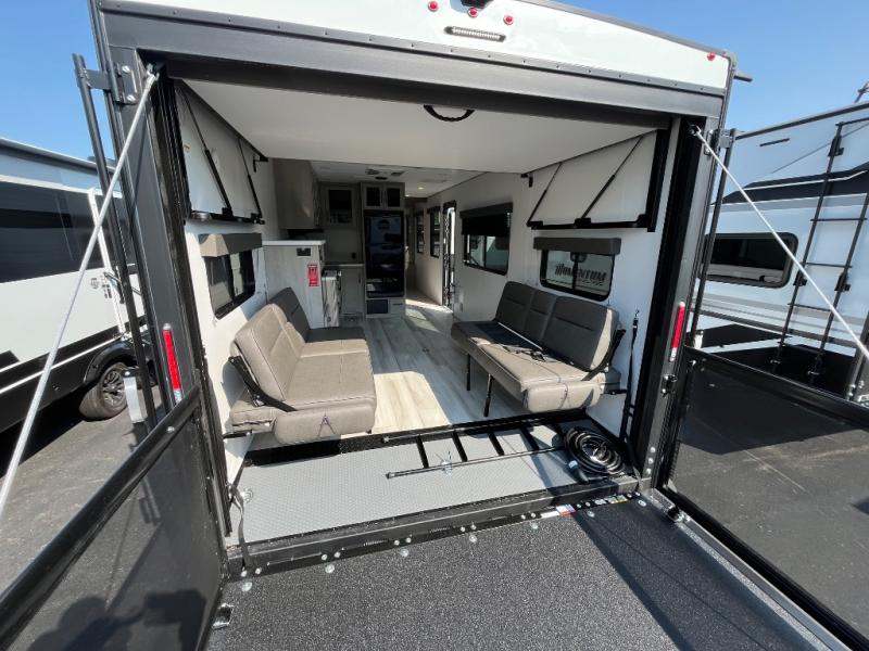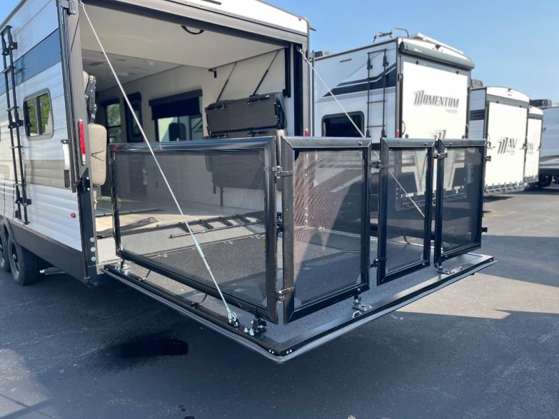 You will love this Momentum MAV toy hauler travel trailer! The front bedroom features a queen bed, and there is plenty of room to walk around. The sliding solid bedroom door helps with space. Overhead storage and a pair of nightstands are convenient storage, plus there is a wardrobe with both drawers and space to hang items. The kitchen offers a microwave, stainless steel sink, and an 8 cu. ft. 12V refrigerator. In the garage, you'll find rollover sofas with a table and a top bed for guests to sleep on. The ramp door/patio will provide additional living space once your toys are unloaded, and the pull down screen will keep bugs out!