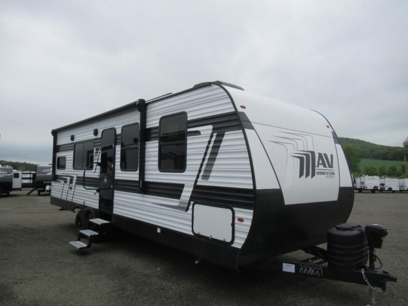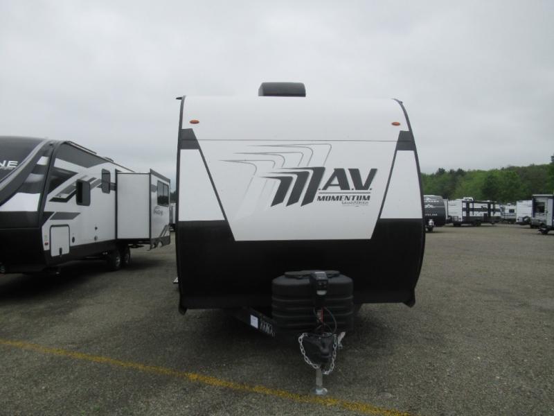 The Momentum MAV toy hauler travel trailers by Grand Design are designed to provide exactly what you need. The spacious garage provides tons of cargo space, with no wheel wells to get in the way. Additional storage includes magnetic storage door catches, underbed storage with a gas strut lift, and overhead consoles throughout. Conveniences like motion sensor lights and USB outlets will make your life easier, and you will be comfortable in all seasons with the 30K BTU furnace plus 15K BTU ducted air conditioning. The standard Solar Package comes with a 180W solar panel, a 40 Amp charge controller with Bluetooth, and a 12V refrigerator so you can go off-grid when the adventure calls for it.