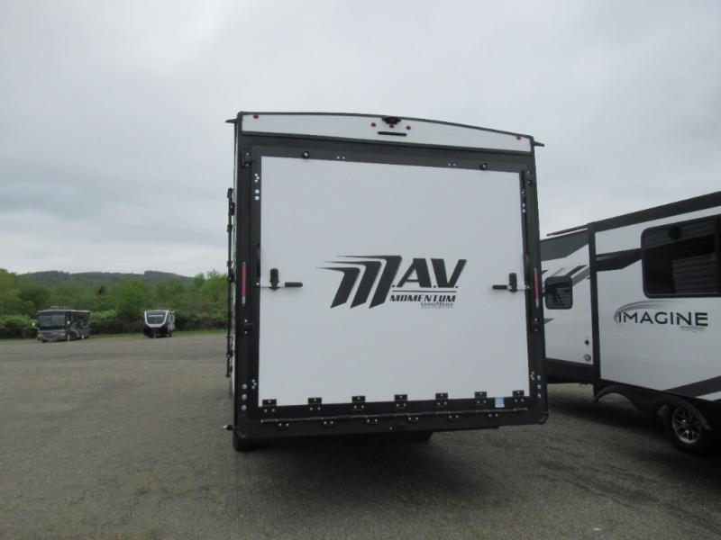 You will love this Momentum MAV toy hauler travel trailer! The front bedroom features a queen bed, and there is plenty of room to walk around. The sliding solid bedroom door helps with space. Overhead storage and a pair of nightstands are convenient storage, plus there is a wardrobe with both drawers and space to hang items. The kitchen offers a microwave, stainless steel sink, and an 8 cu. ft. 12V refrigerator. In the garage, you'll find rollover sofas with a table and a top bed for guests to sleep on. The ramp door/patio will provide additional living space once your toys are unloaded, and the pull down screen will keep bugs out!