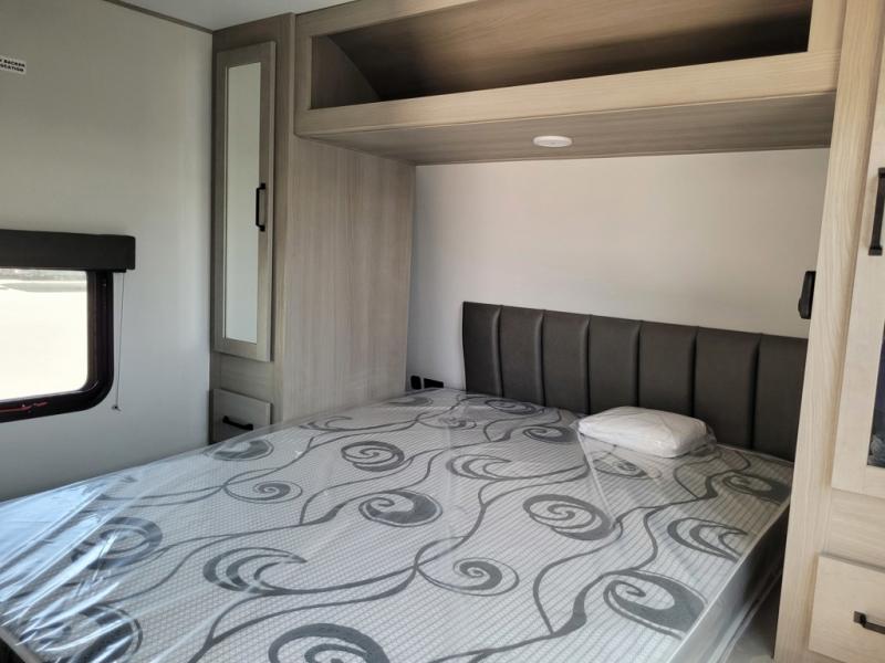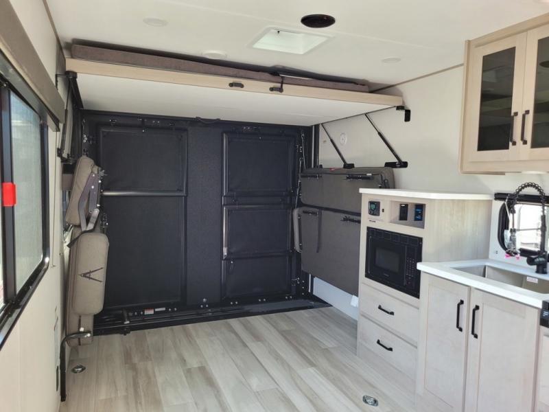 You will love this Momentum MAV toy hauler travel trailer! The front bedroom features a queen bed, and there is plenty of room to walk around. The sliding solid bedroom door helps with space. Overhead storage and a pair of nightstands are convenient storage, plus there is a wardrobe with both drawers and space to hang items. The kitchen offers a microwave, stainless steel sink, and an 8 cu. ft. 12V refrigerator. In the garage, you'll find rollover sofas with a table and a top bed for guests to sleep on. The ramp door/patio will provide additional living space once your toys are unloaded, and the pull down screen will keep bugs out!