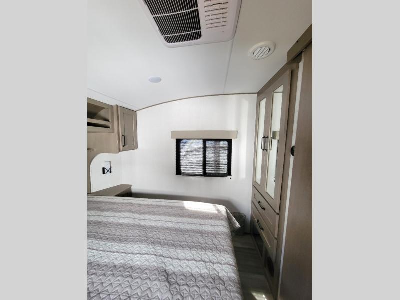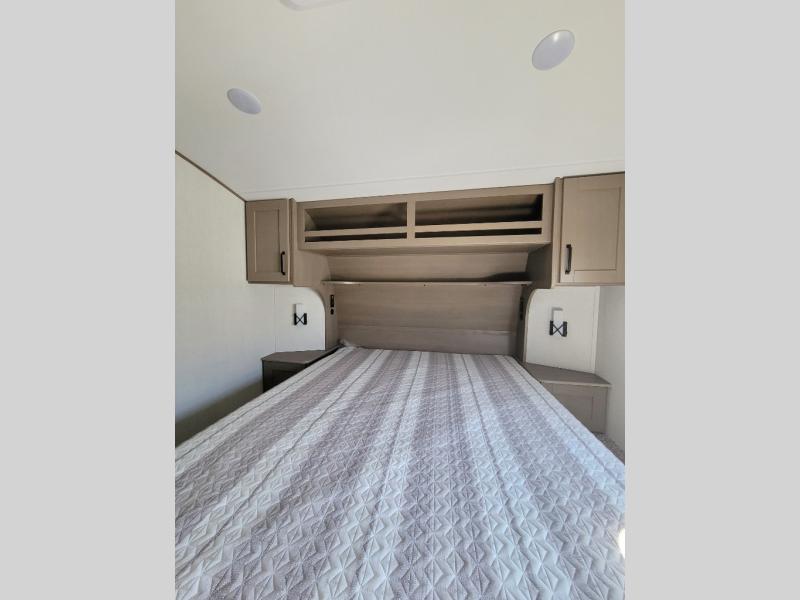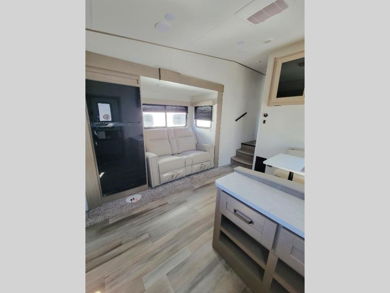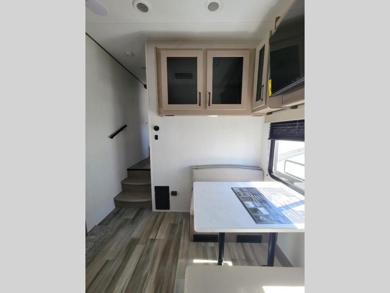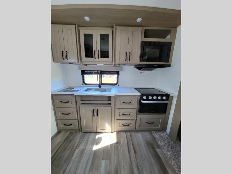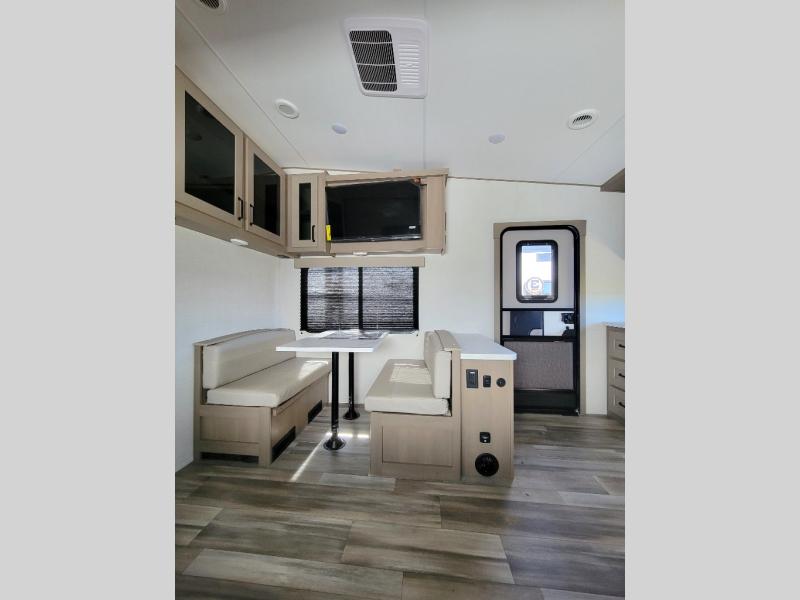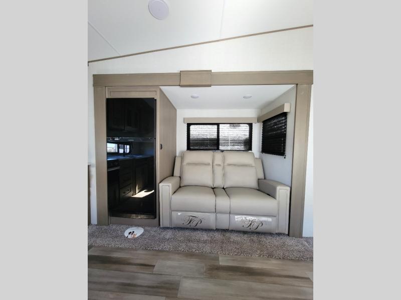 This rear kitchen fifth wheel is sure to meet all of your camping needs! Since the exterior length is only 26' 11", you can easily maneuver in and out of campgrounds. The rear kitchen includes ample counter space to prep meals, a three burner cooktop, and overhead storage for all your necessities. There is a 10 cu. ft. 12V refrigerator within the slide out that also includes the theater seating, and the booth dinette provides a place to dine or play a card game. You will appreciate having convenient storage by the entry door, along with pull-out pet bowls, a functional wardrobe closet in the bedroom and an exterior pass-thru for belongings and camping gear. When you're ready to turn in for the night, the queen bed is sure to bring a great night's rest, while your guests sleep on the booth dinette or optional tri-fold sofa if you replace the theater seating!