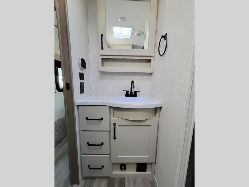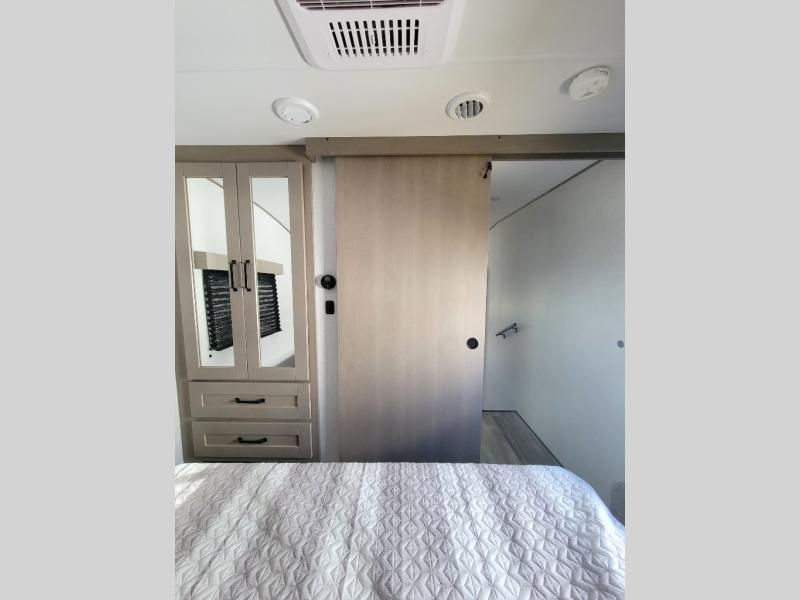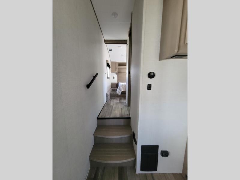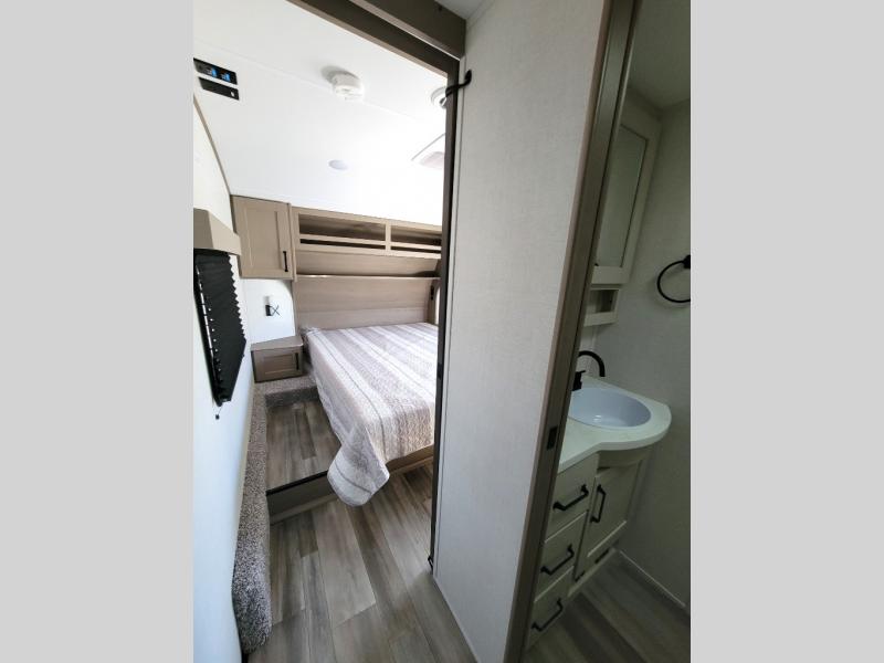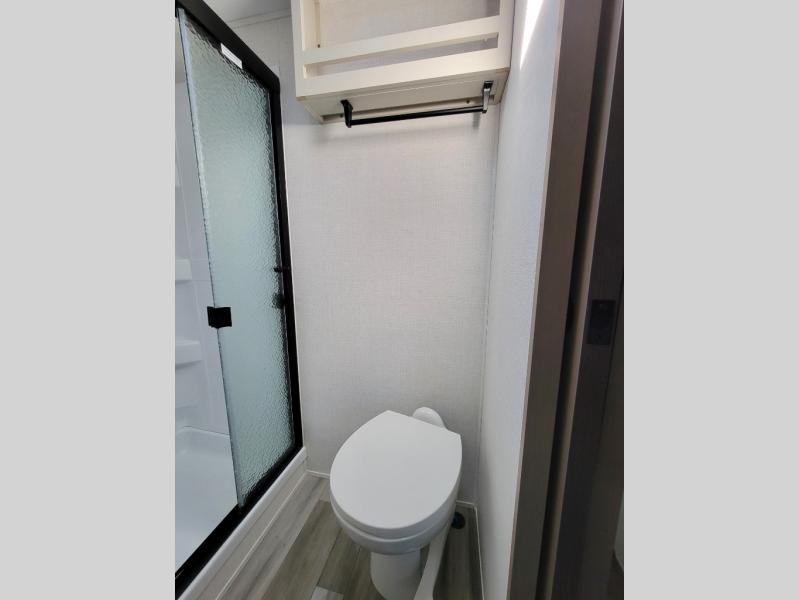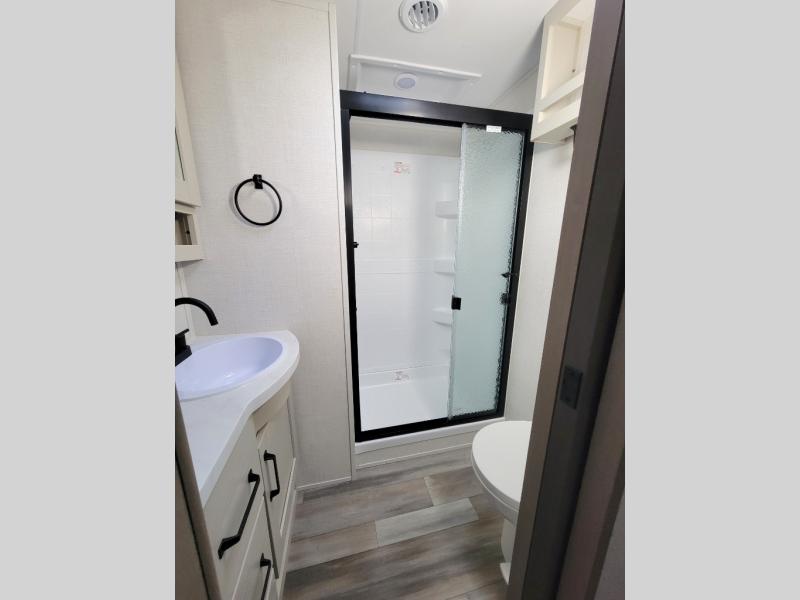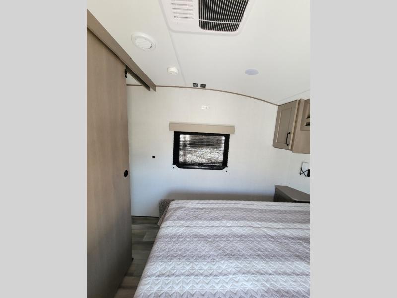 This rear kitchen fifth wheel is sure to meet all of your camping needs! Since the exterior length is only 26' 11", you can easily maneuver in and out of campgrounds. The rear kitchen includes ample counter space to prep meals, a three burner cooktop, and overhead storage for all your necessities. There is a 10 cu. ft. 12V refrigerator within the slide out that also includes the theater seating, and the booth dinette provides a place to dine or play a card game. You will appreciate having convenient storage by the entry door, along with pull-out pet bowls, a functional wardrobe closet in the bedroom and an exterior pass-thru for belongings and camping gear. When you're ready to turn in for the night, the queen bed is sure to bring a great night's rest, while your guests sleep on the booth dinette or optional tri-fold sofa if you replace the theater seating!