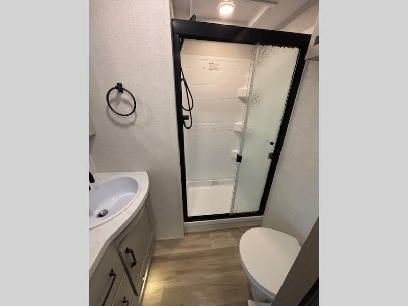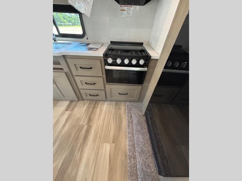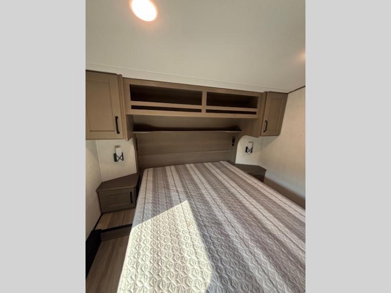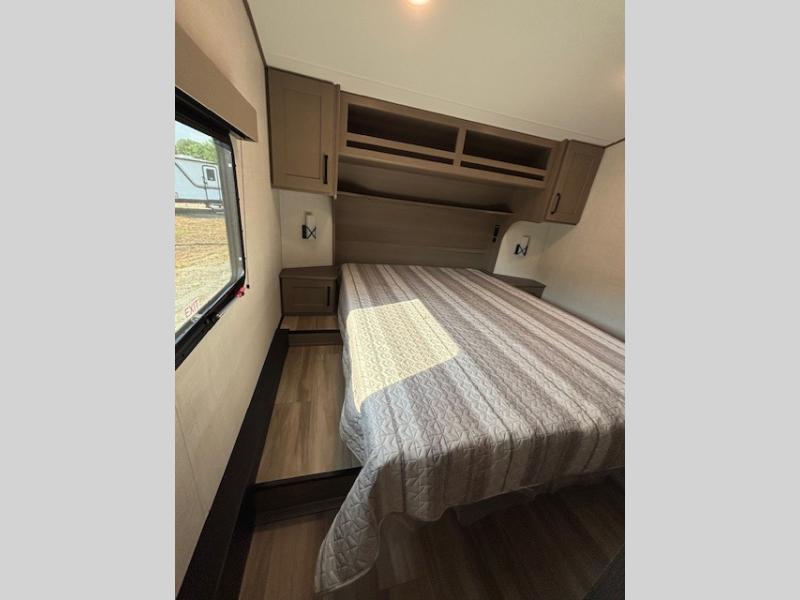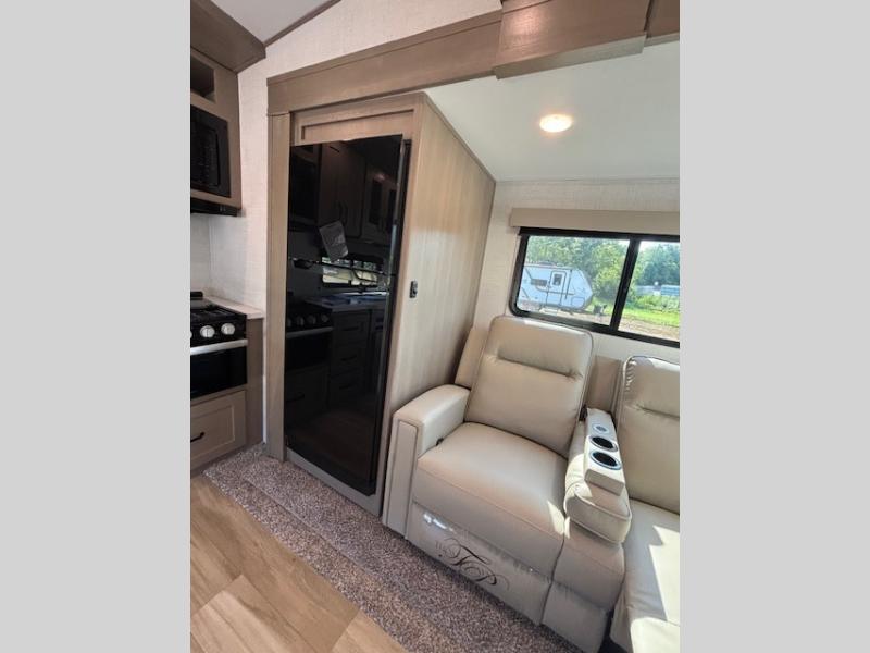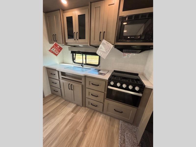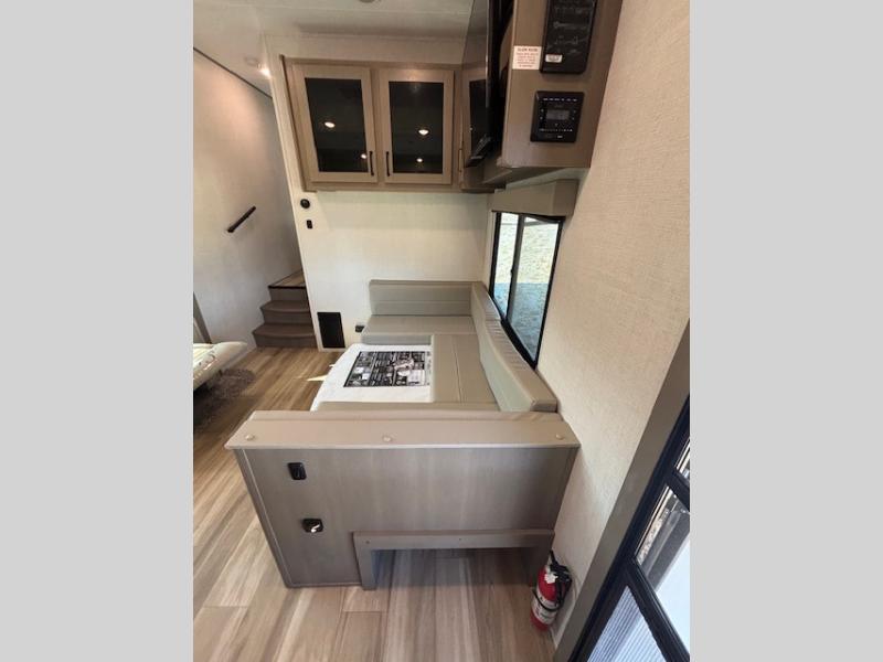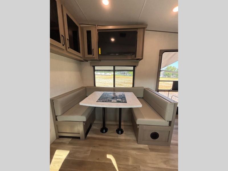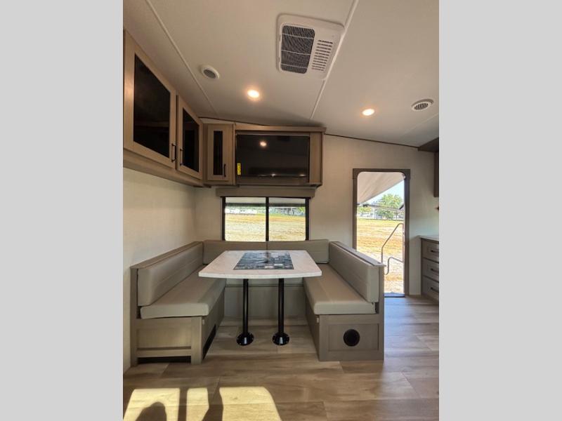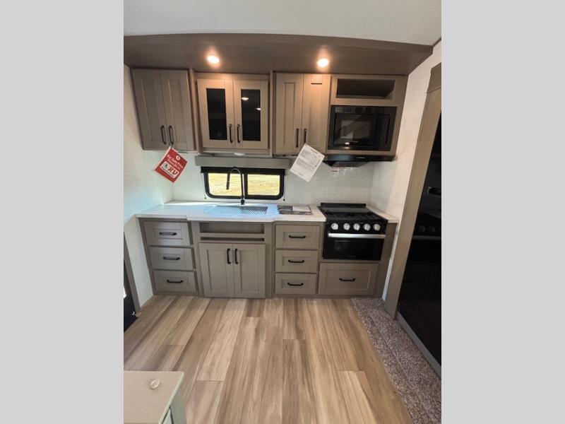 This rear kitchen fifth wheel is sure to meet all of your camping needs! Since the exterior length is only 26' 11", you can easily maneuver in and out of campgrounds. The rear kitchen includes ample counter space to prep meals, a three burner cooktop, and overhead storage for all your necessities. There is a 10 cu. ft. 12V refrigerator within the slide out that also includes the theater seating, and the booth dinette provides a place to dine or play a card game. You will appreciate having convenient storage by the entry door, along with pull-out pet bowls, a functional wardrobe closet in the bedroom and an exterior pass-thru for belongings and camping gear. When you're ready to turn in for the night, the queen bed is sure to bring a great night's rest, while your guests sleep on the booth dinette or optional tri-fold sofa if you replace the theater seating!
