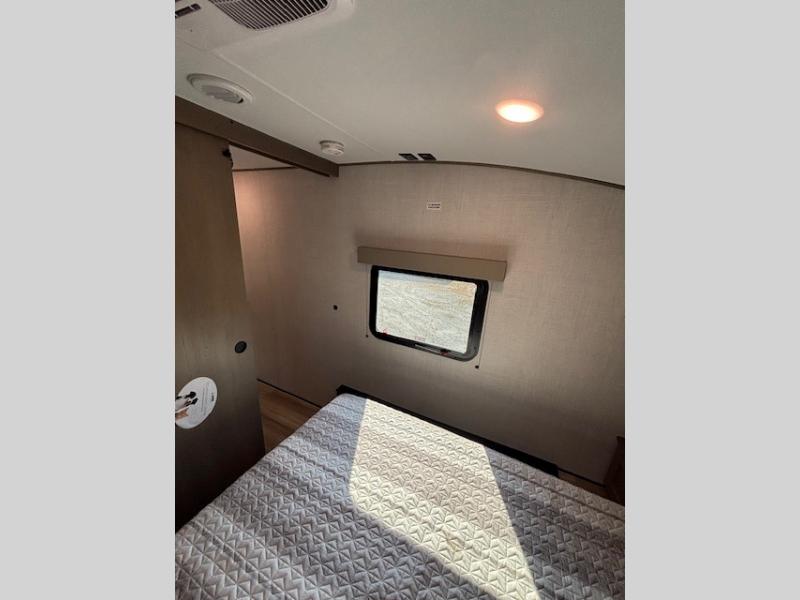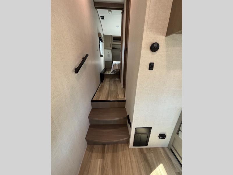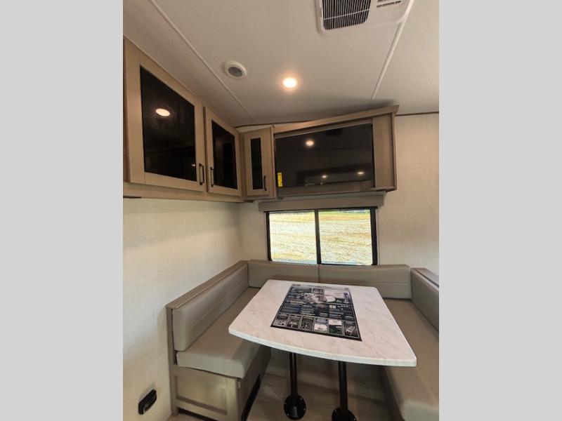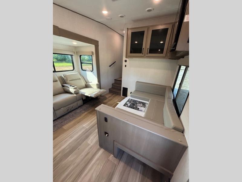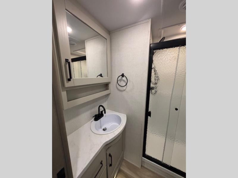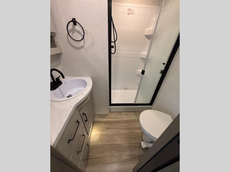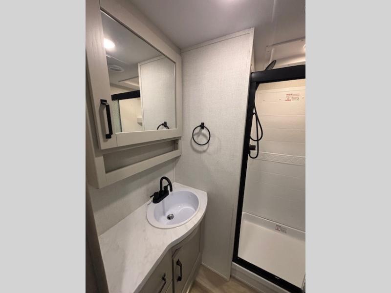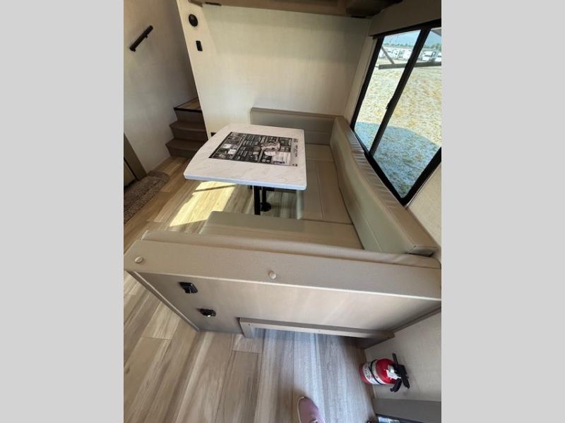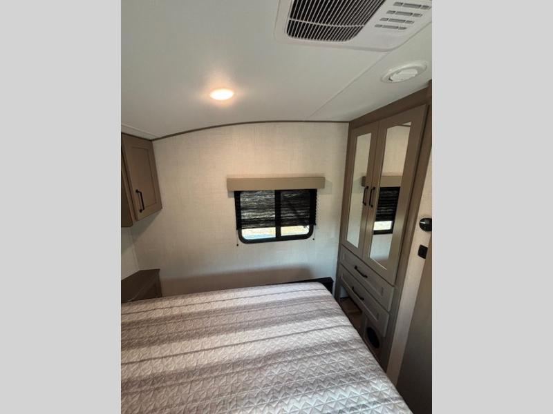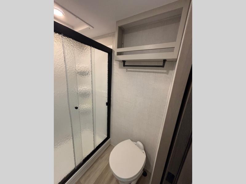 This rear kitchen fifth wheel is sure to meet all of your camping needs! Since the exterior length is only 26' 11", you can easily maneuver in and out of campgrounds. The rear kitchen includes ample counter space to prep meals, a three burner cooktop, and overhead storage for all your necessities. There is a 10 cu. ft. 12V refrigerator within the slide out that also includes the theater seating, and the booth dinette provides a place to dine or play a card game. You will appreciate having convenient storage by the entry door, along with pull-out pet bowls, a functional wardrobe closet in the bedroom and an exterior pass-thru for belongings and camping gear. When you're ready to turn in for the night, the queen bed is sure to bring a great night's rest, while your guests sleep on the booth dinette or optional tri-fold sofa if you replace the theater seating!
