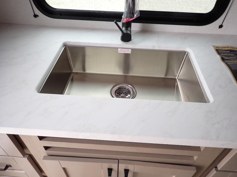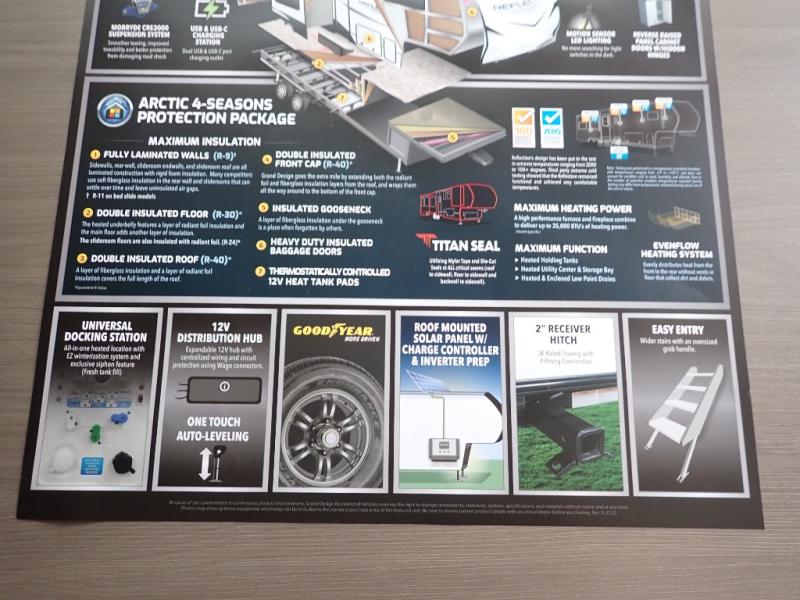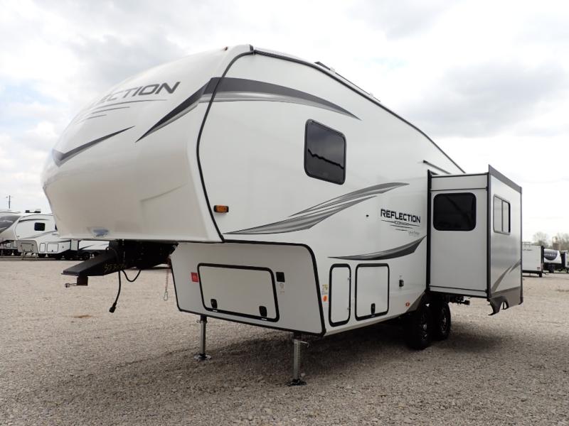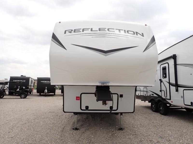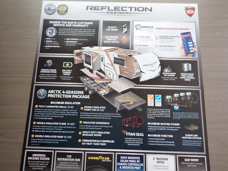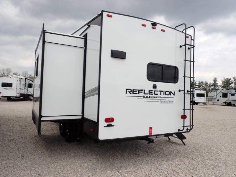 Each Reflection 100 Series fifth wheel by Grand Design is affordable and packed with luxury for unforgettable camping memories! The MorRyde CRE3000 suspension system and Goodyear Endurance tires will provide smooth towing from home to campground. And the solar package with a 180W solar panel, 60 Amp charge controller and 12V refrigerator will allow you to camp for longer periods of time and in more locations! A heated and enclosed underbelly with circulating heat is included in the Arctic 4-Seasons Protection Package, along with a double insulated roof and front cap, and thermofoil insulation under the holding tanks so you can camp all year long if you choose. You will appreciate having an on-demand water heater for hot showers after exploring, and the universal all-in-one docking station will let you monitor your RVs tanks levels and functions with ease. These models also include many luxurious interior features, such as premium Congoleum flooring, pleated shades, residential cabinetry, and matte black fixtures and hardware. Don't let the Reflection 100 Series fifth wheels pass you by!