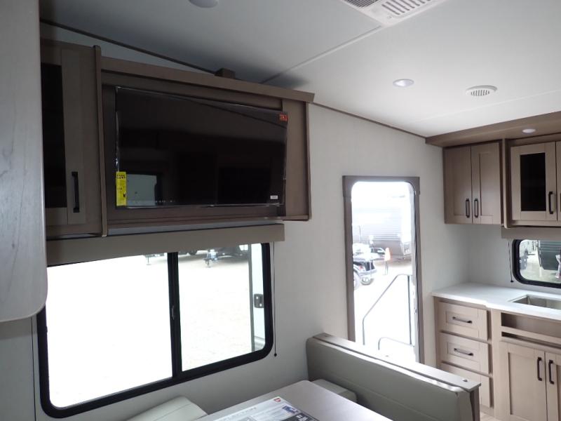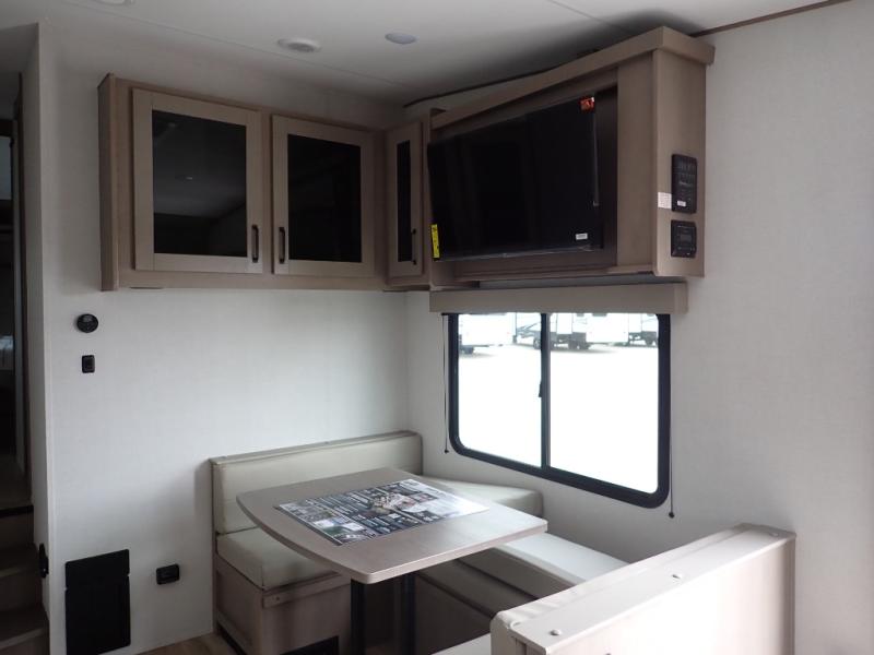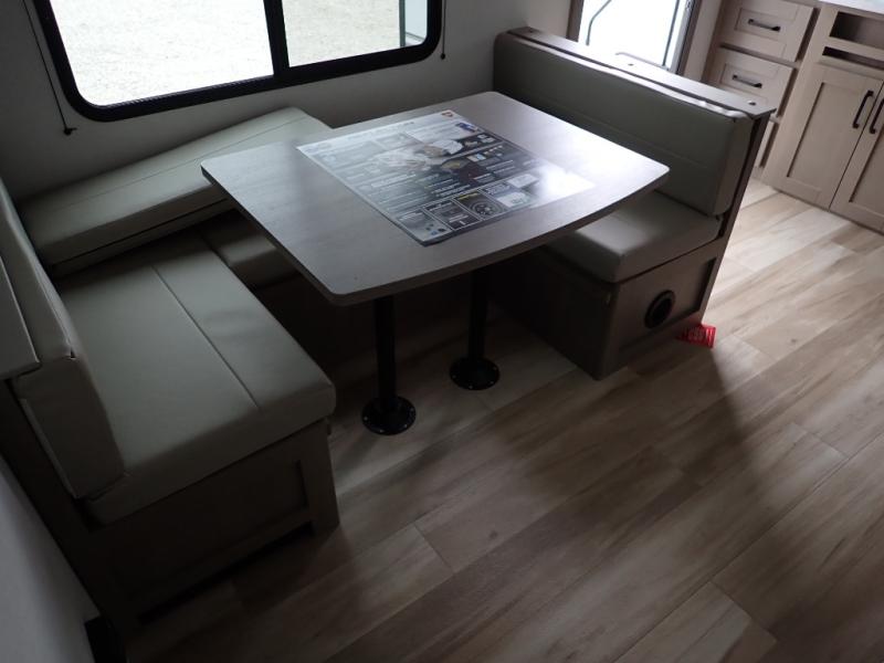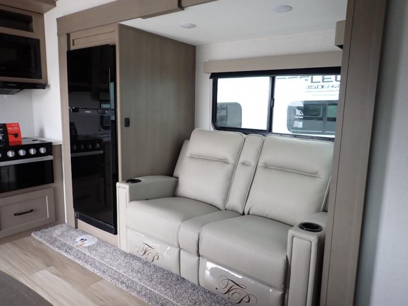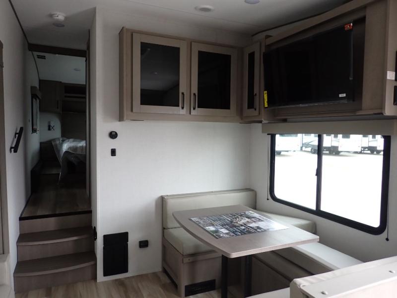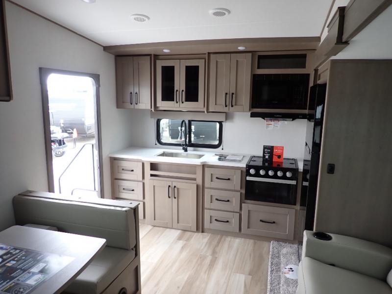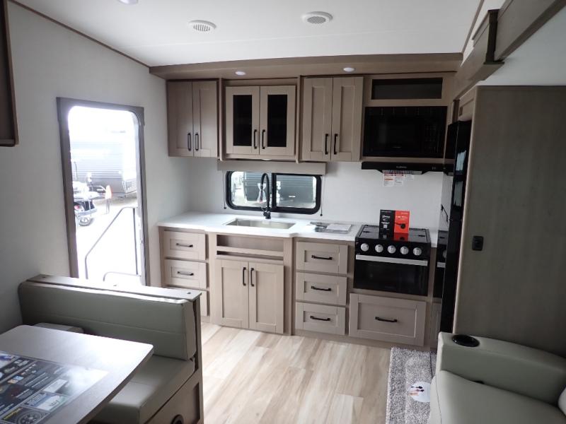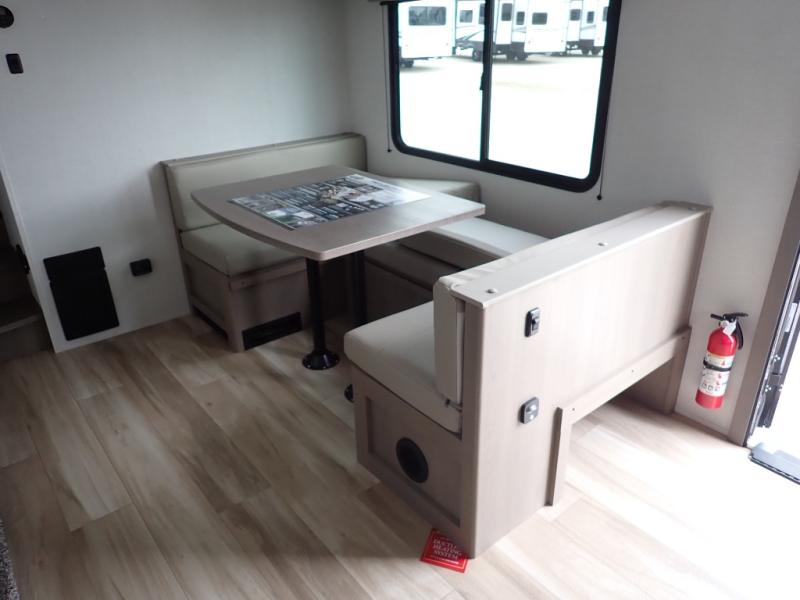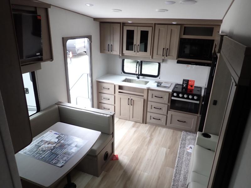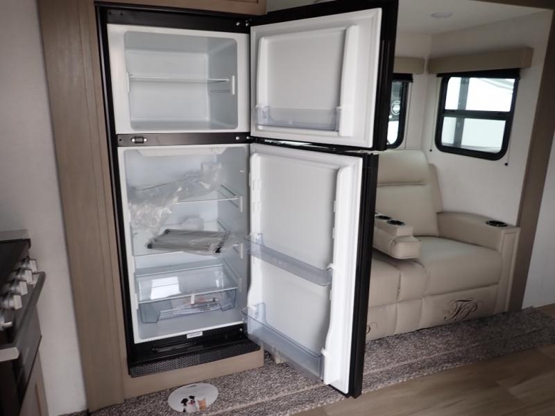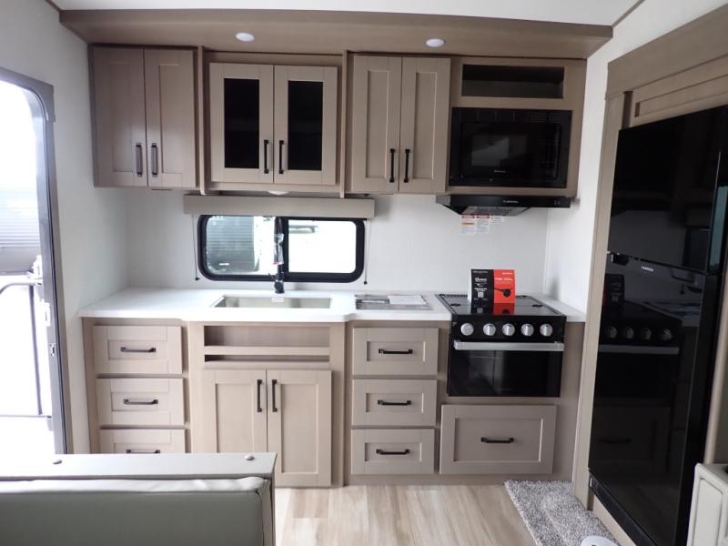 This rear kitchen fifth wheel is sure to meet all of your camping needs! Since the exterior length is only 26' 11", you can easily maneuver in and out of campgrounds. The rear kitchen includes ample counter space to prep meals, a three burner cooktop, and overhead storage for all your necessities. There is a 10 cu. ft. 12V refrigerator within the slide out that also includes the theater seating, and the U-shaped dinette provides a place to dine or play a card game. You will appreciate having convenient storage by the entry door, along with pull-out pet bowls, a functional wardrobe closet in the bedroom and an exterior pass-thru for belongings and camping gear. When you're ready to turn in for the night, the queen bed is sure to bring a great night's rest, while your guests sleep on the booth dinette or optional tri-fold sofa if you replace the theater seating!