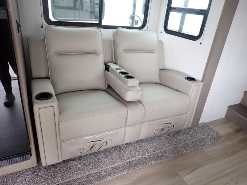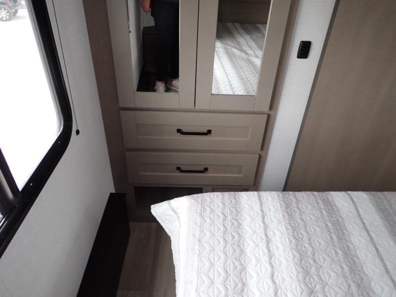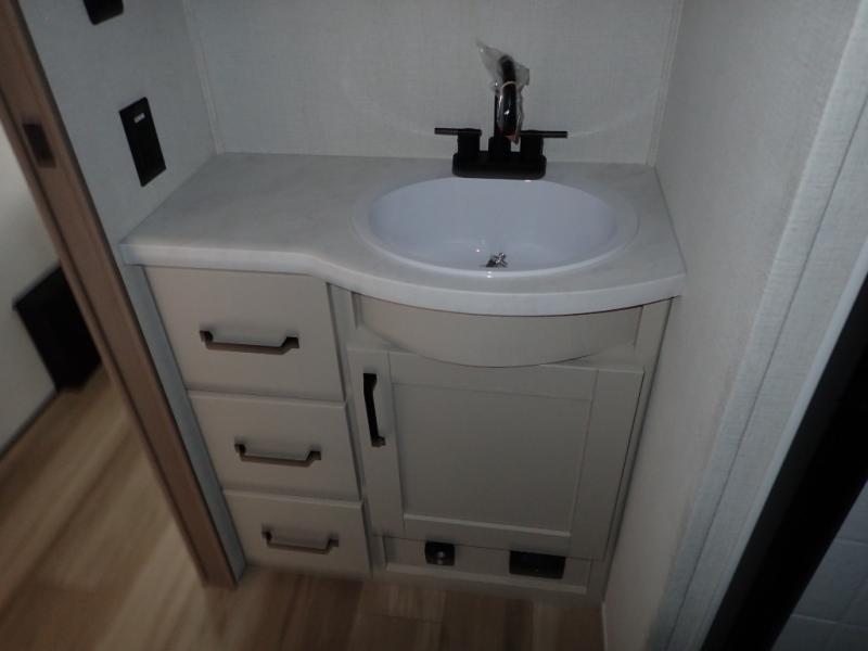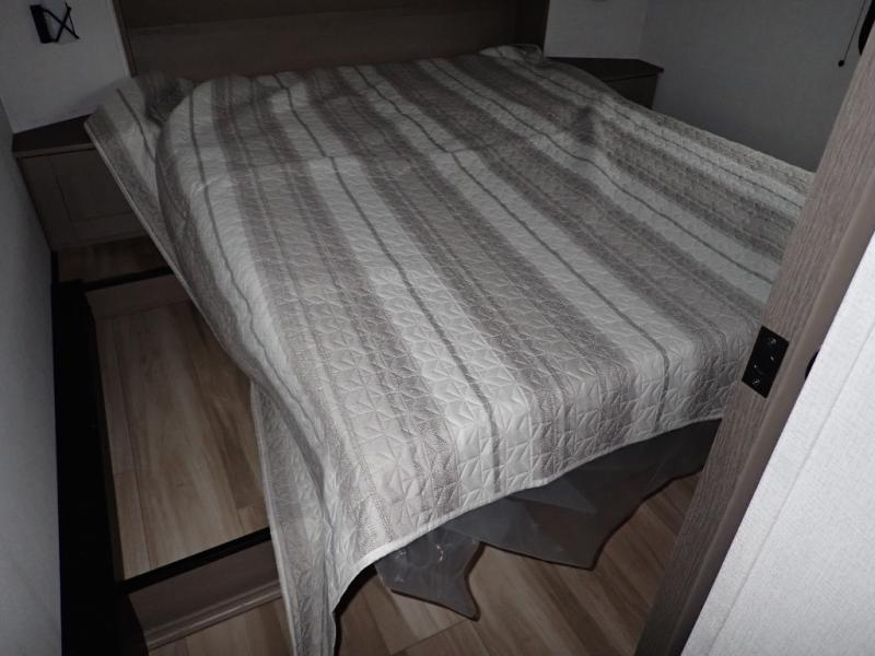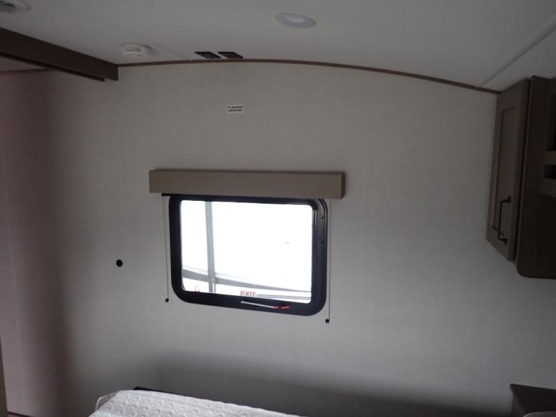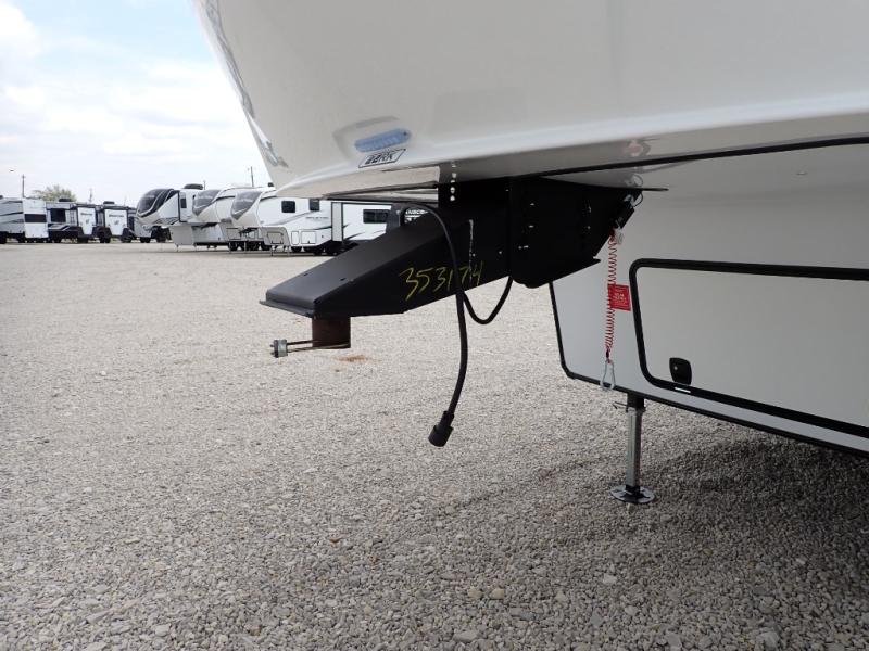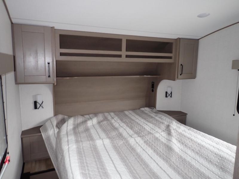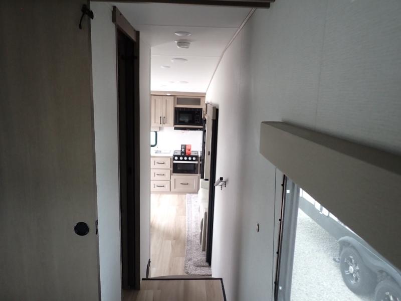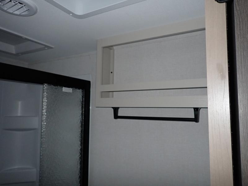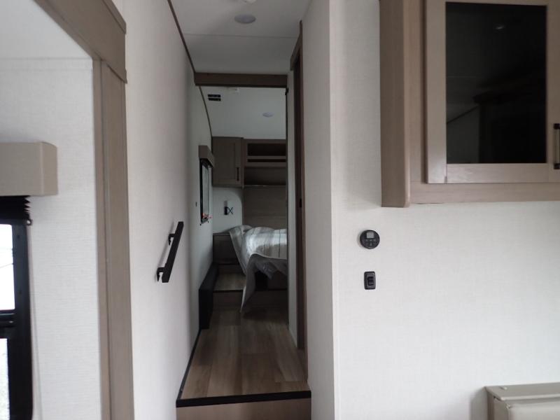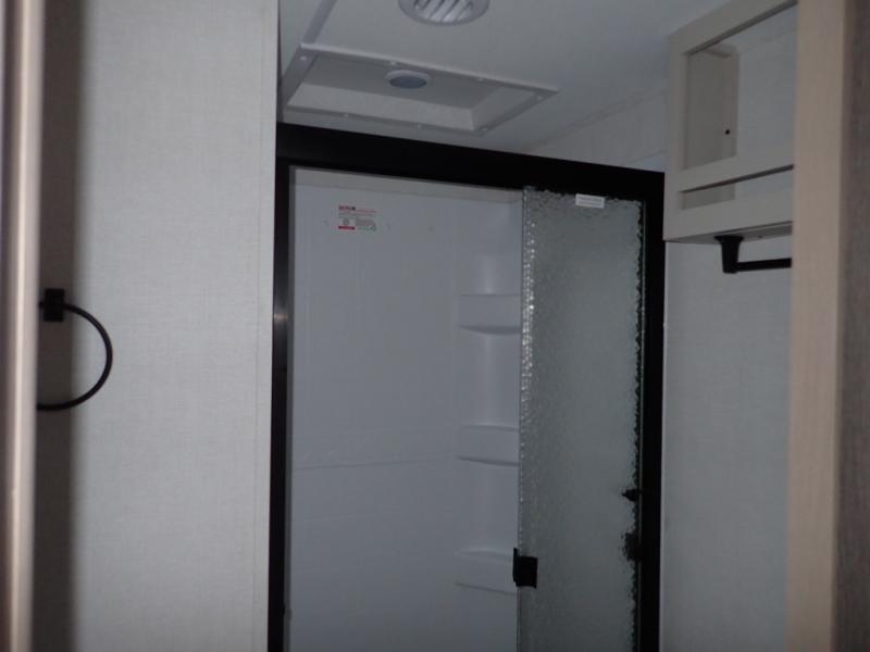 This rear kitchen fifth wheel is sure to meet all of your camping needs! Since the exterior length is only 26' 11", you can easily maneuver in and out of campgrounds. The rear kitchen includes ample counter space to prep meals, a three burner cooktop, and overhead storage for all your necessities. There is a 10 cu. ft. 12V refrigerator within the slide out that also includes the theater seating, and the U-shaped dinette provides a place to dine or play a card game. You will appreciate having convenient storage by the entry door, along with pull-out pet bowls, a functional wardrobe closet in the bedroom and an exterior pass-thru for belongings and camping gear. When you're ready to turn in for the night, the queen bed is sure to bring a great night's rest, while your guests sleep on the booth dinette or optional tri-fold sofa if you replace the theater seating!