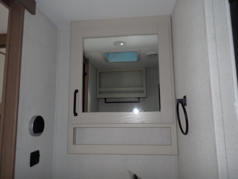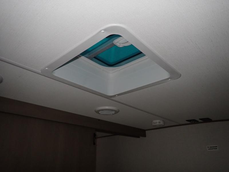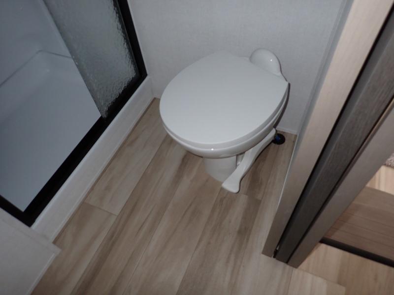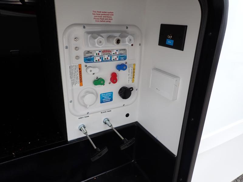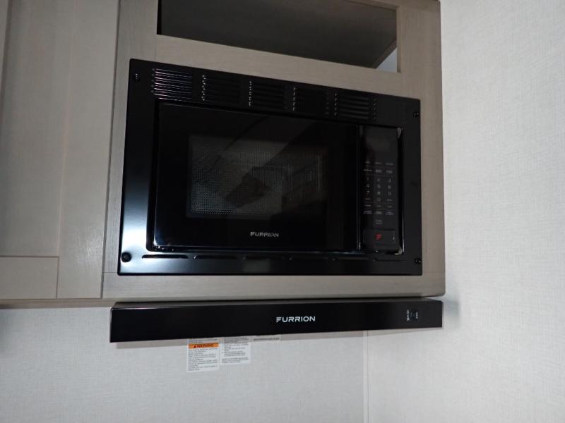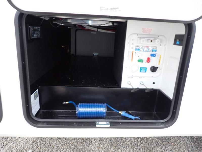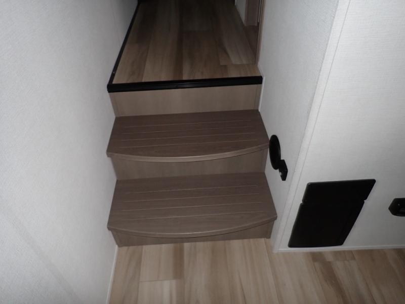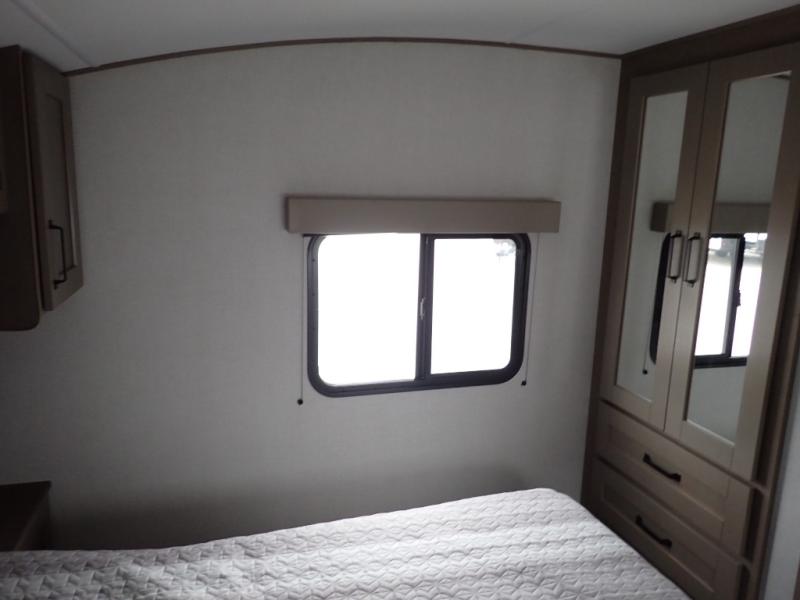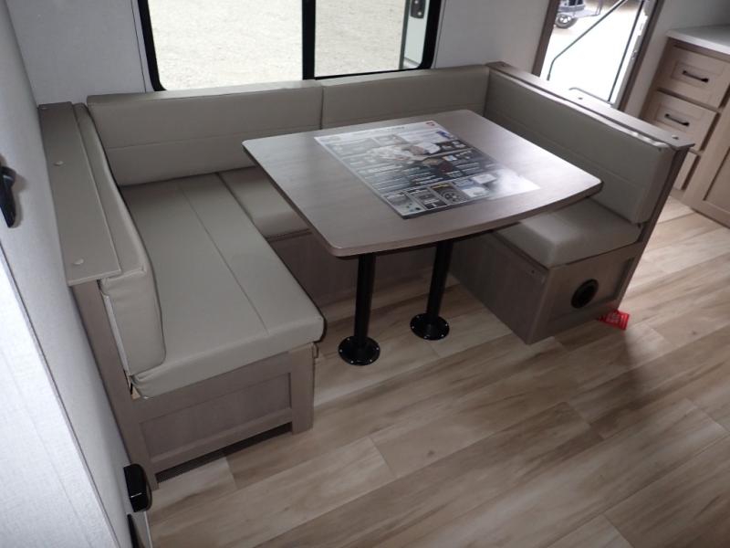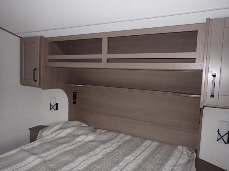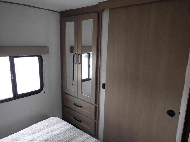 This rear kitchen fifth wheel is sure to meet all of your camping needs! Since the exterior length is only 26' 11", you can easily maneuver in and out of campgrounds. The rear kitchen includes ample counter space to prep meals, a three burner cooktop, and overhead storage for all your necessities. There is a 10 cu. ft. 12V refrigerator within the slide out that also includes the theater seating, and the U-shaped dinette provides a place to dine or play a card game. You will appreciate having convenient storage by the entry door, along with pull-out pet bowls, a functional wardrobe closet in the bedroom and an exterior pass-thru for belongings and camping gear. When you're ready to turn in for the night, the queen bed is sure to bring a great night's rest, while your guests sleep on the booth dinette or optional tri-fold sofa if you replace the theater seating!