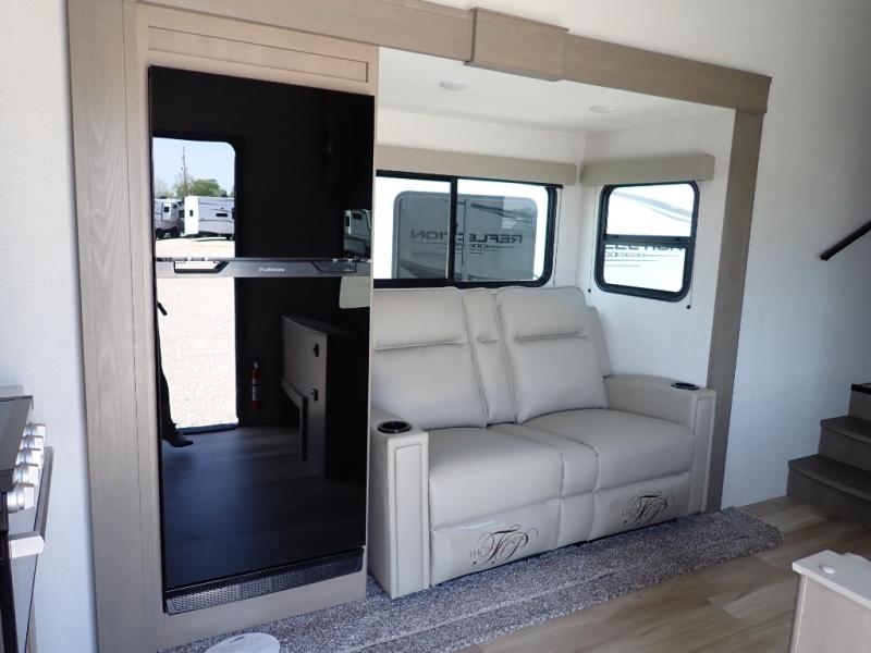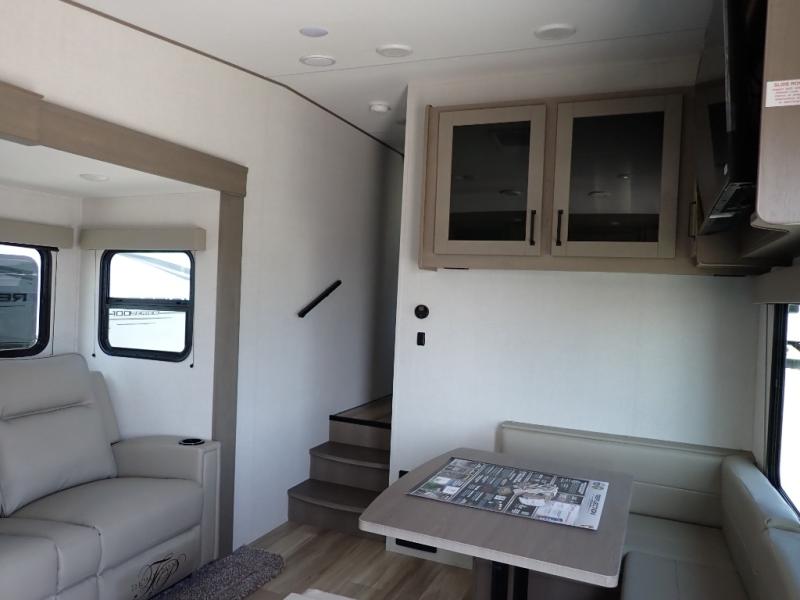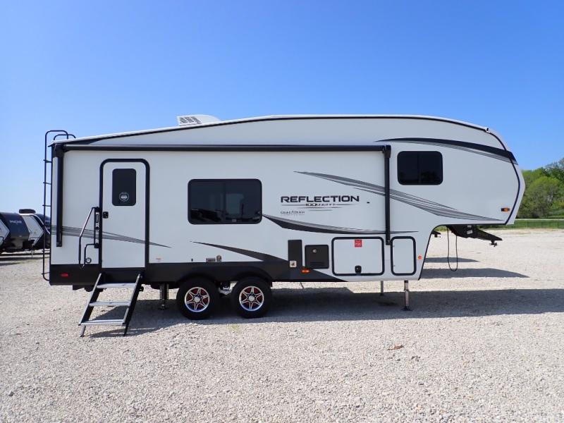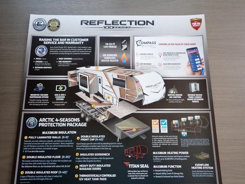 Each Reflection 100 Series fifth wheel by Grand Design is affordable and packed with luxury for unforgettable camping memories! The MorRyde CRE3000 suspension system and Goodyear Endurance tires will provide smooth towing from home to campground. And the solar package with a 180W solar panel, 60 Amp charge controller and 12V refrigerator will allow you to camp for longer periods of time and in more locations! A heated and enclosed underbelly with circulating heat is included in the Arctic 4-Seasons Protection Package, along with a double insulated roof and front cap, and thermofoil insulation under the holding tanks so you can camp all year long if you choose. You will appreciate having an on-demand water heater for hot showers after exploring, and the universal all-in-one docking station will let you monitor your RVs tanks levels and functions with ease. These models also include many luxurious interior features, such as premium Congoleum flooring, pleated shades, residential cabinetry, and matte black fixtures and hardware. Don't let the Reflection 100 Series fifth wheels pass you by!