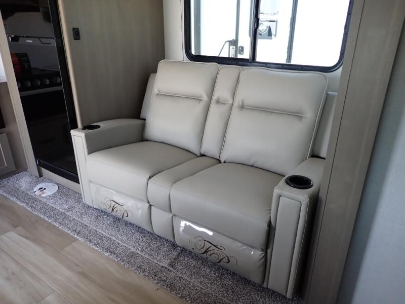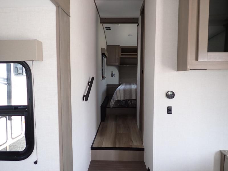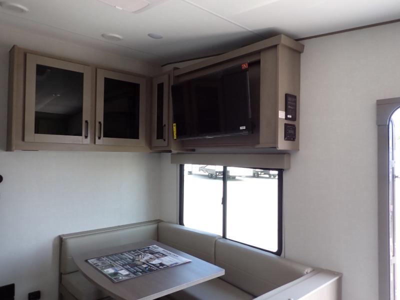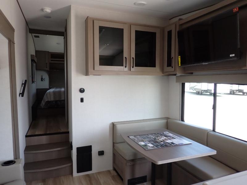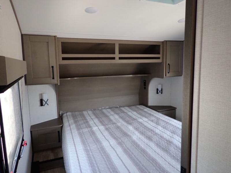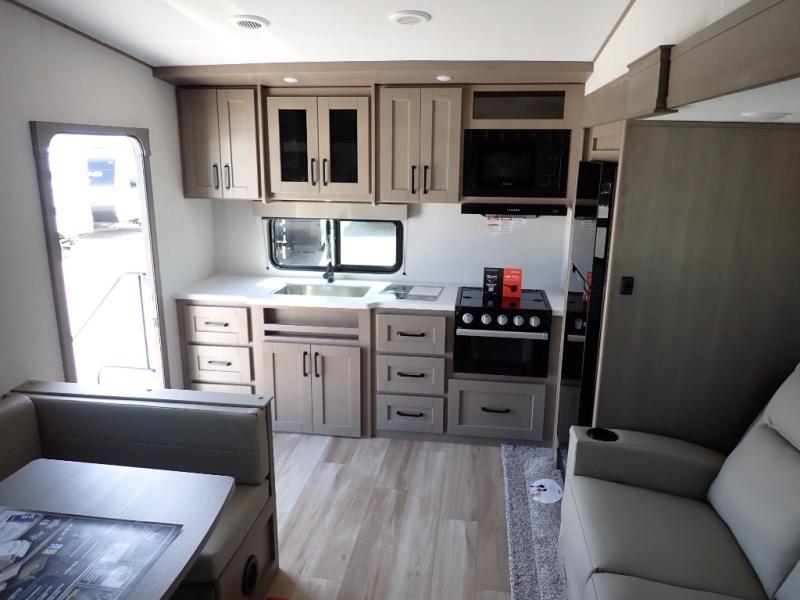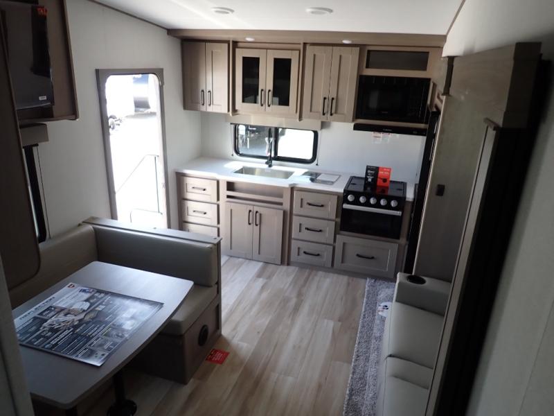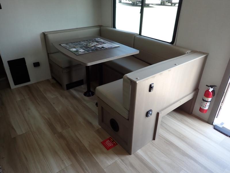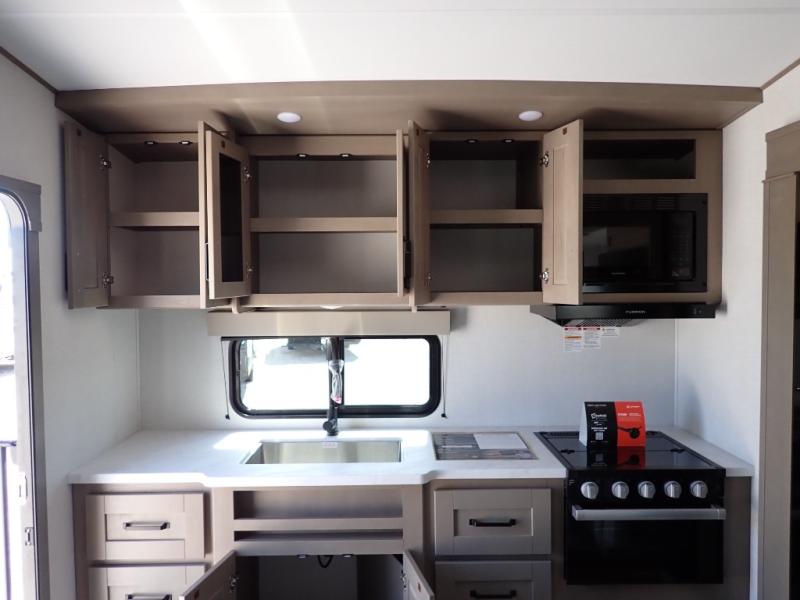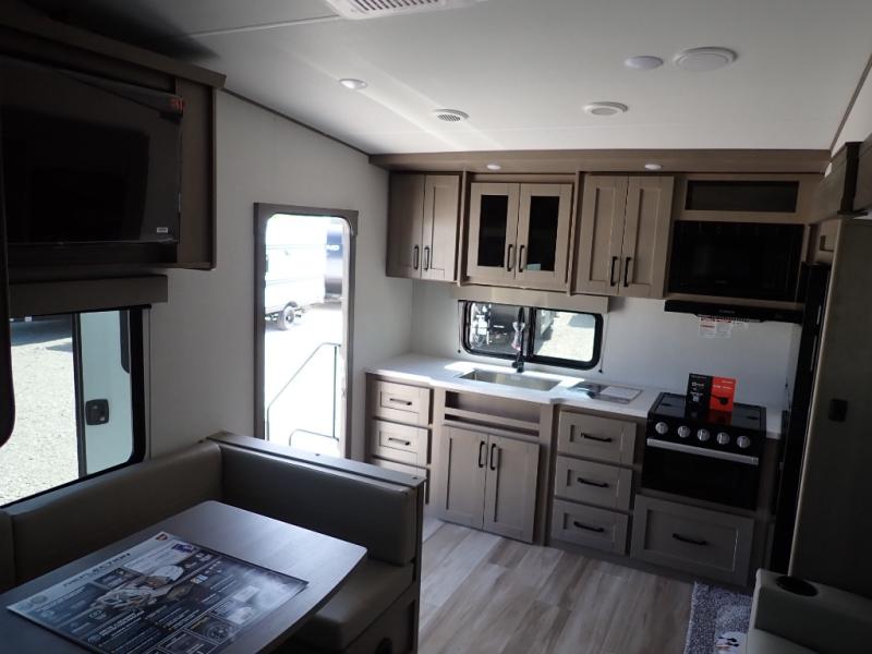 This rear kitchen fifth wheel is sure to meet all of your camping needs! Since the exterior length is only 26' 11", you can easily maneuver in and out of campgrounds. The rear kitchen includes ample counter space to prep meals, a three burner cooktop, and overhead storage for all your necessities. There is a 10 cu. ft. 12V refrigerator within the slide out that also includes the theater seating, and the U-shaped dinette provides a place to dine or play a card game. You will appreciate having convenient storage by the entry door, along with pull-out pet bowls, a functional wardrobe closet in the bedroom and an exterior pass-thru for belongings and camping gear. When you're ready to turn in for the night, the queen bed is sure to bring a great night's rest, while your guests sleep on the booth dinette or optional tri-fold sofa if you replace the theater seating!