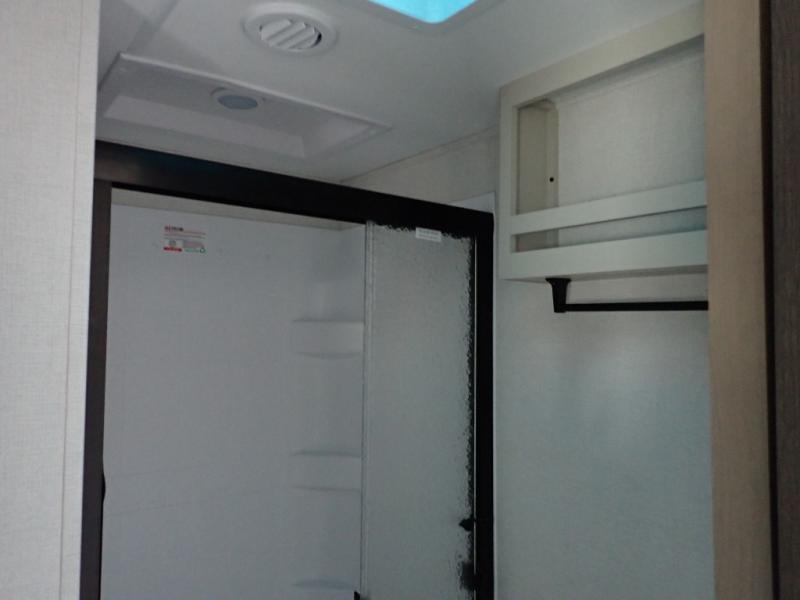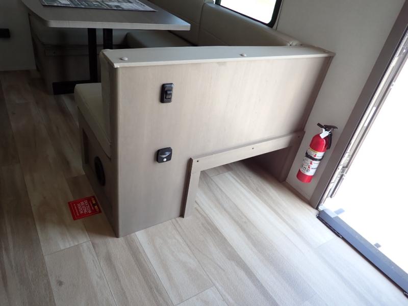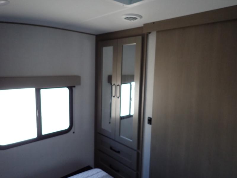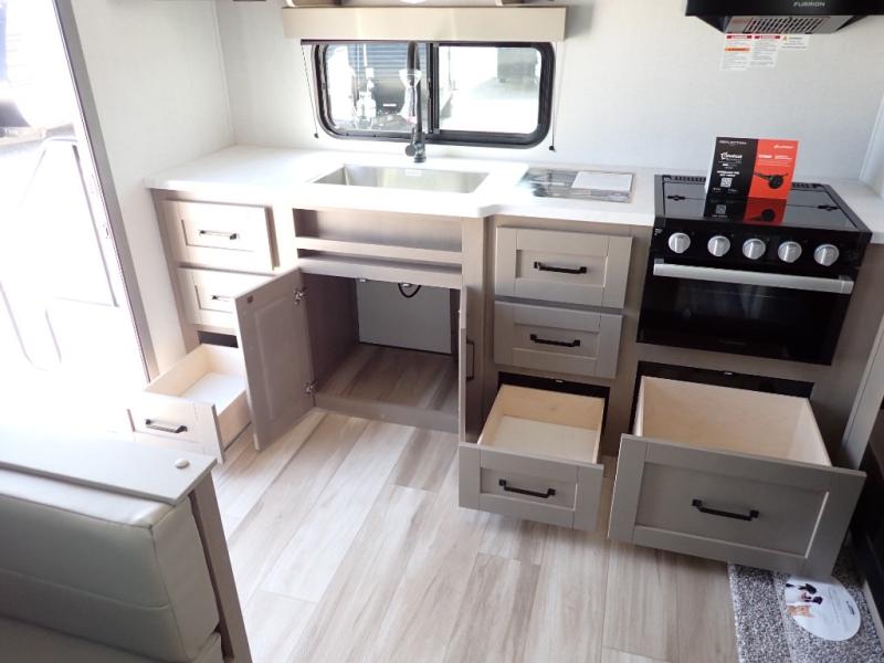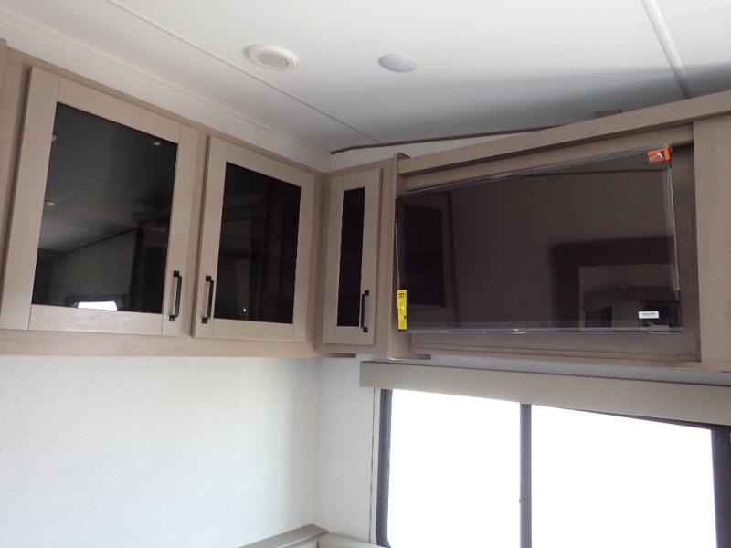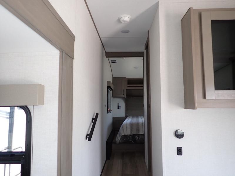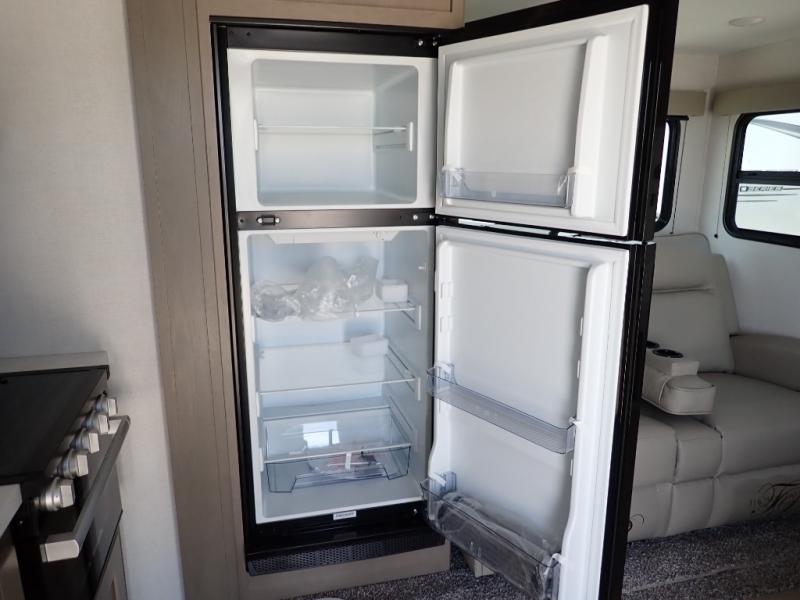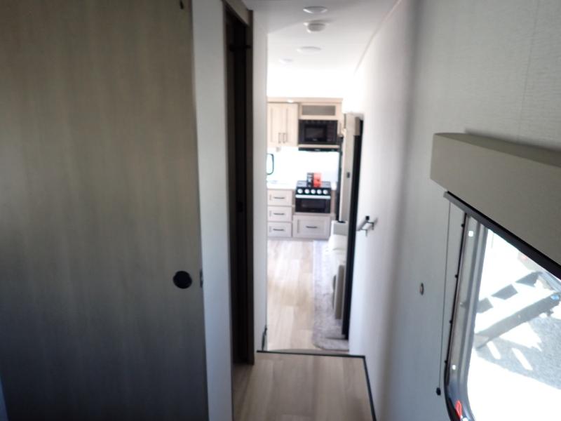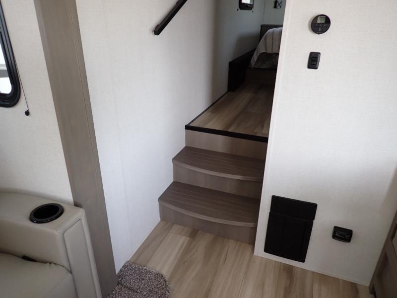 This rear kitchen fifth wheel is sure to meet all of your camping needs! Since the exterior length is only 26' 11", you can easily maneuver in and out of campgrounds. The rear kitchen includes ample counter space to prep meals, a three burner cooktop, and overhead storage for all your necessities. There is a 10 cu. ft. 12V refrigerator within the slide out that also includes the theater seating, and the U-shaped dinette provides a place to dine or play a card game. You will appreciate having convenient storage by the entry door, along with pull-out pet bowls, a functional wardrobe closet in the bedroom and an exterior pass-thru for belongings and camping gear. When you're ready to turn in for the night, the queen bed is sure to bring a great night's rest, while your guests sleep on the booth dinette or optional tri-fold sofa if you replace the theater seating!