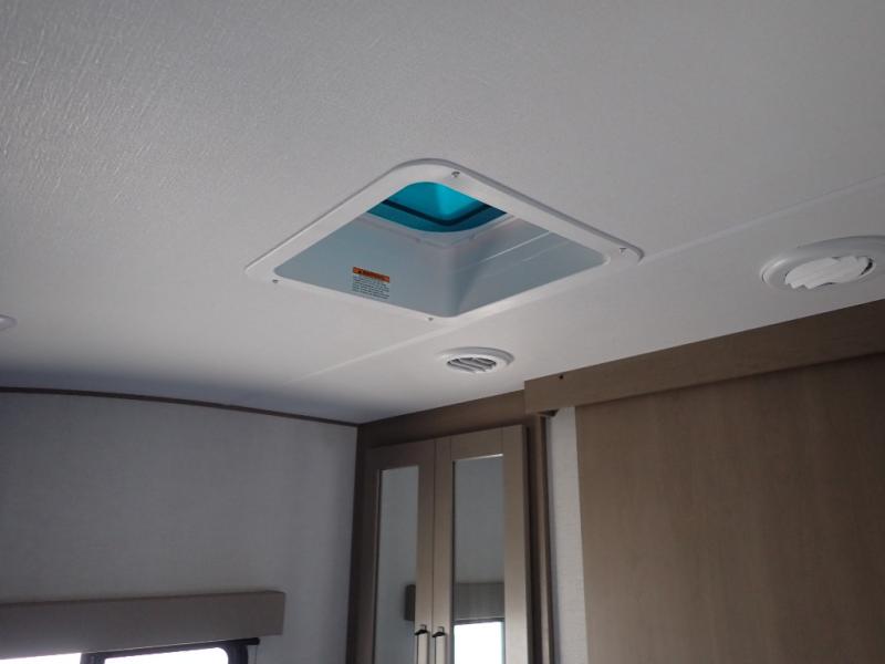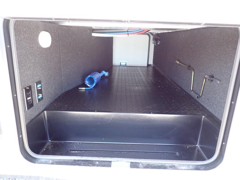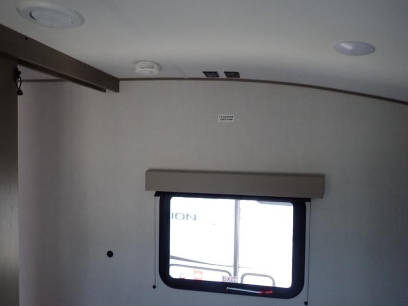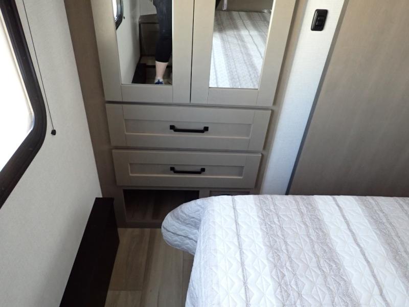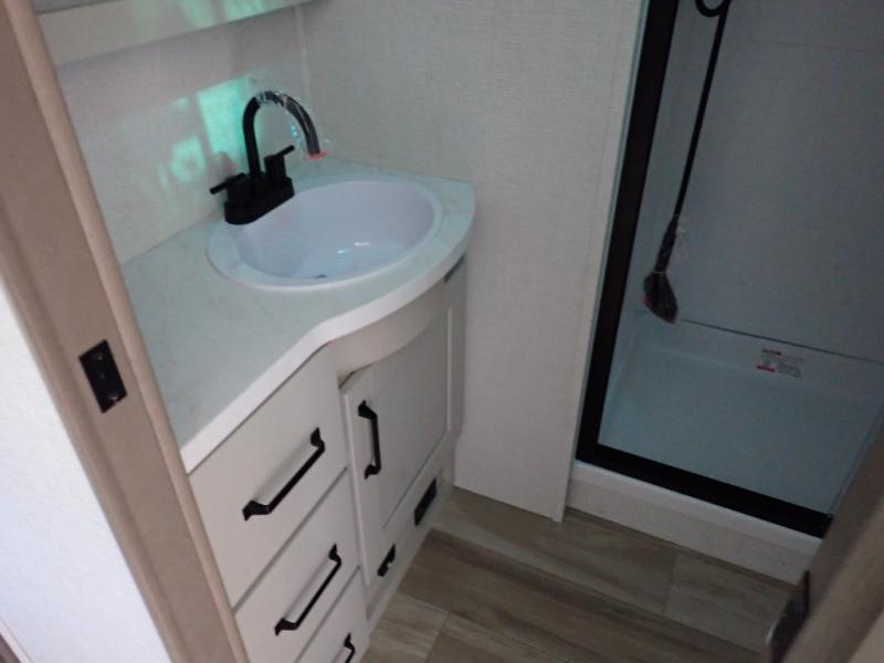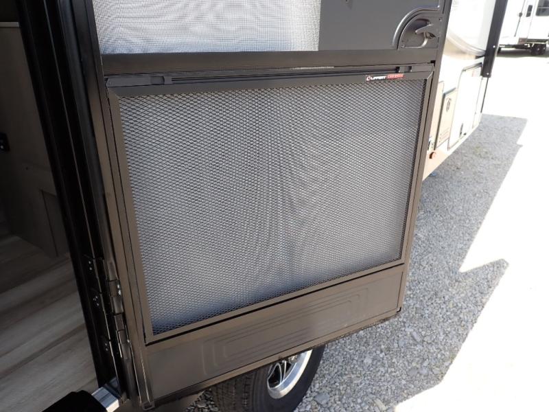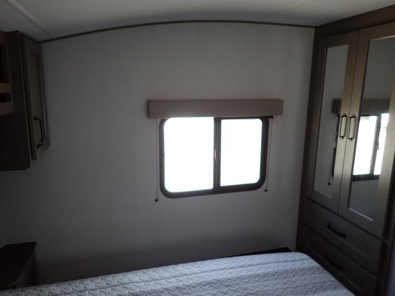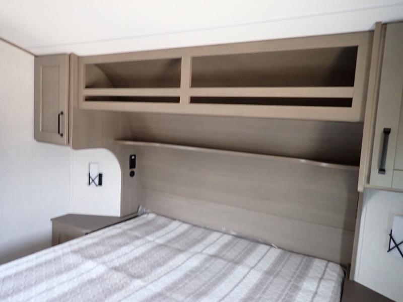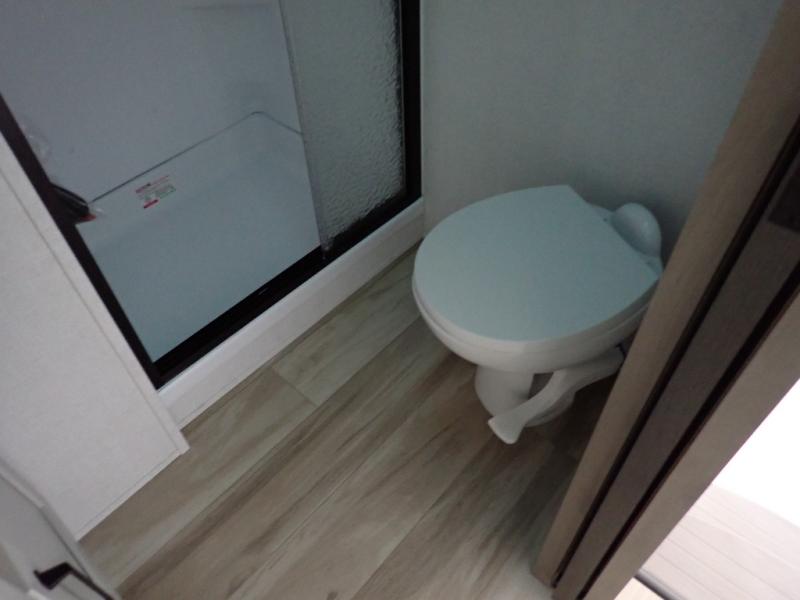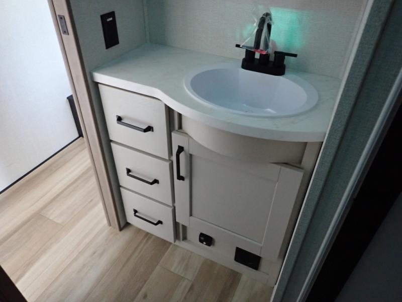This rear kitchen fifth wheel is sure to meet all of your camping needs! Since the exterior length is only 26' 11", you can easily maneuver in and out of campgrounds. The rear kitchen includes ample counter space to prep meals, a three burner cooktop, and overhead storage for all your necessities. There is a 10 cu. ft. 12V refrigerator within the slide out that also includes the theater seating, and the U-shaped dinette provides a place to dine or play a card game. You will appreciate having convenient storage by the entry door, along with pull-out pet bowls, a functional wardrobe closet in the bedroom and an exterior pass-thru for belongings and camping gear. When you're ready to turn in for the night, the queen bed is sure to bring a great night's rest, while your guests sleep on the booth dinette or optional tri-fold sofa if you replace the theater seating!