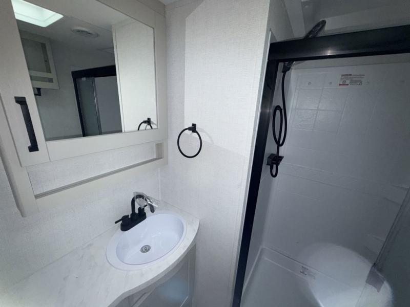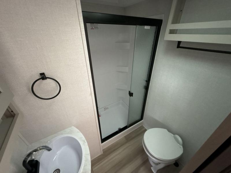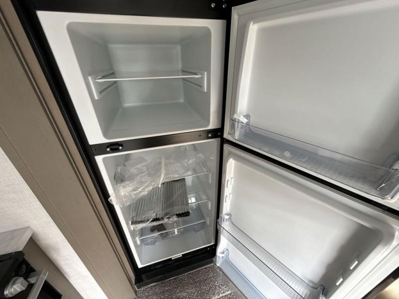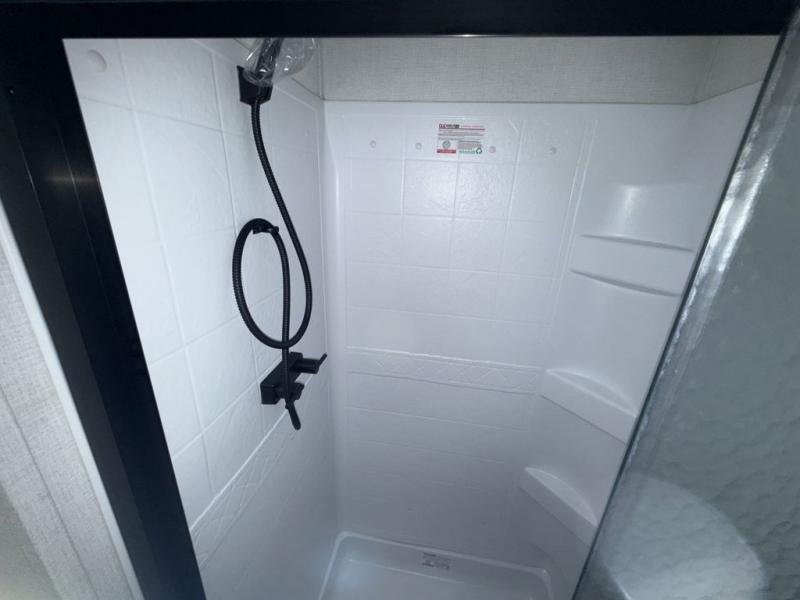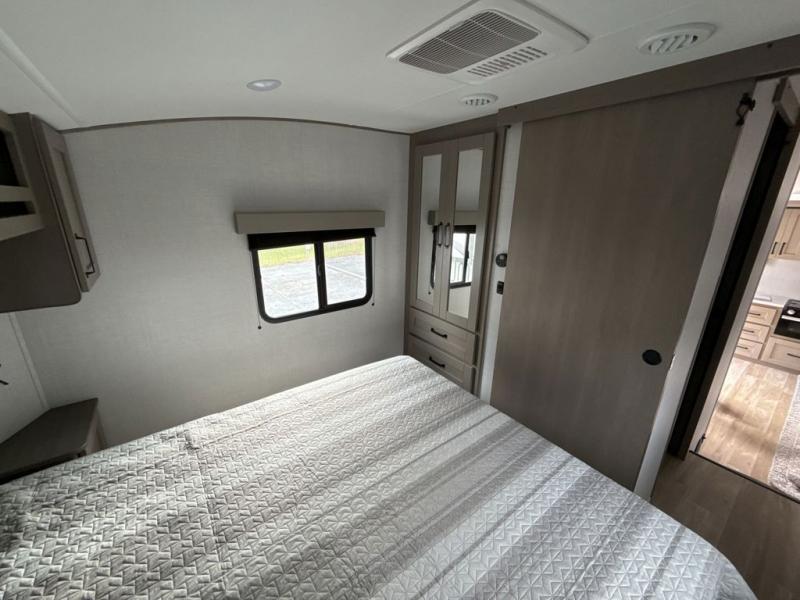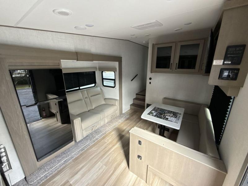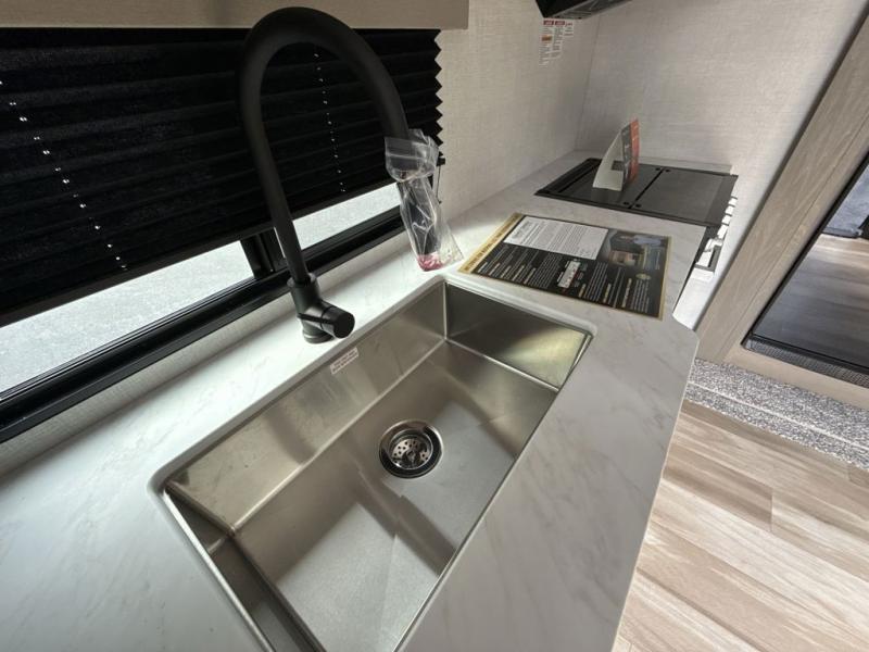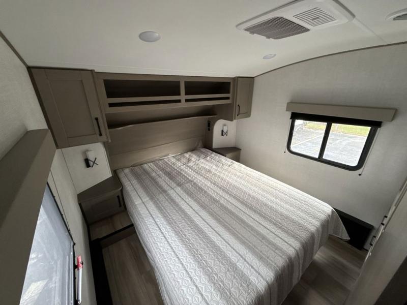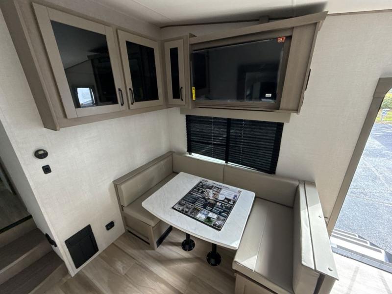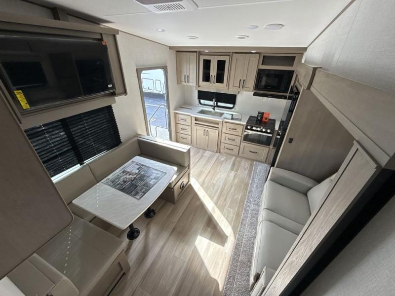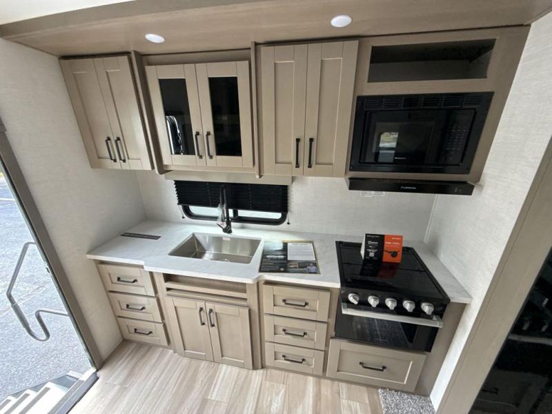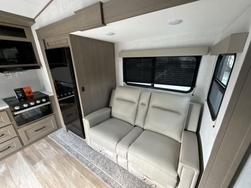 This rear kitchen fifth wheel is sure to meet all of your camping needs! Since the exterior length is only 26' 11", you can easily maneuver in and out of campgrounds. The rear kitchen includes ample counter space to prep meals, a three burner cooktop, and overhead storage for all your necessities. There is a 10 cu. ft. 12V refrigerator within the slide out that also includes the theater seating, and the U-shaped dinette provides a place to dine or play a card game. You will appreciate having convenient storage by the entry door, along with pull-out pet bowls, a functional wardrobe closet in the bedroom and an exterior pass-thru for belongings and camping gear. When you're ready to turn in for the night, the queen bed is sure to bring a great night's rest, while your guests sleep on the booth dinette or optional tri-fold sofa if you replace the theater seating!
