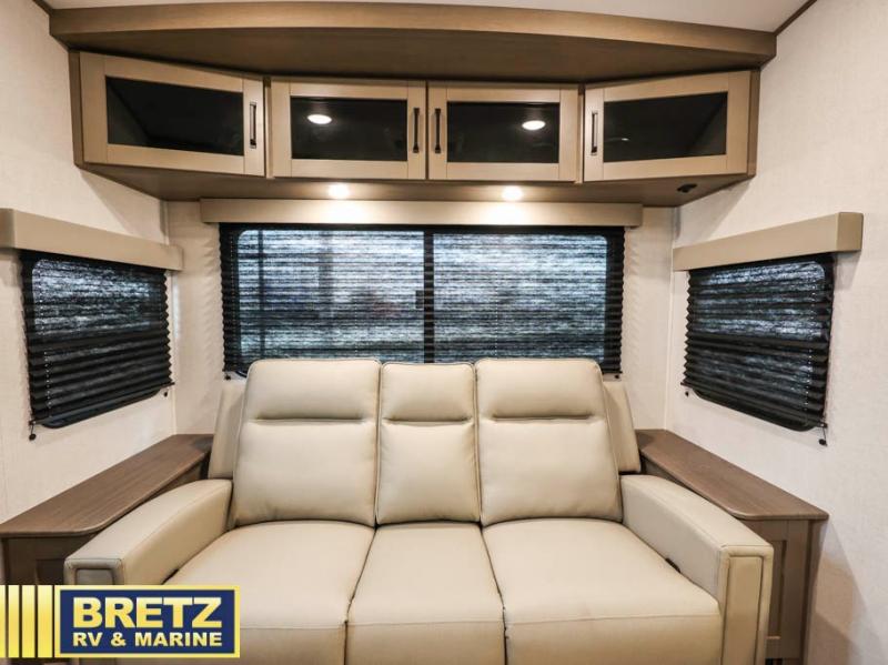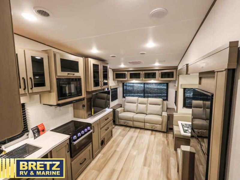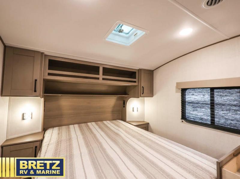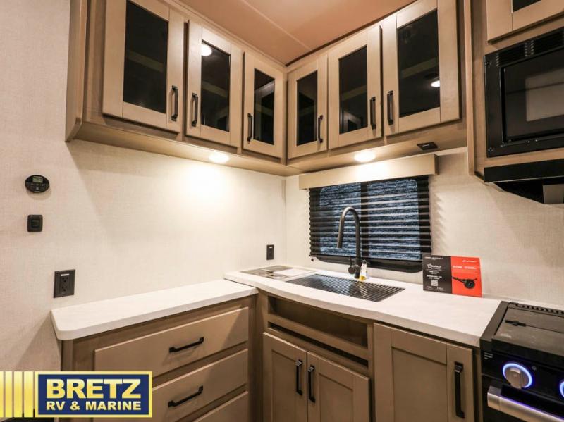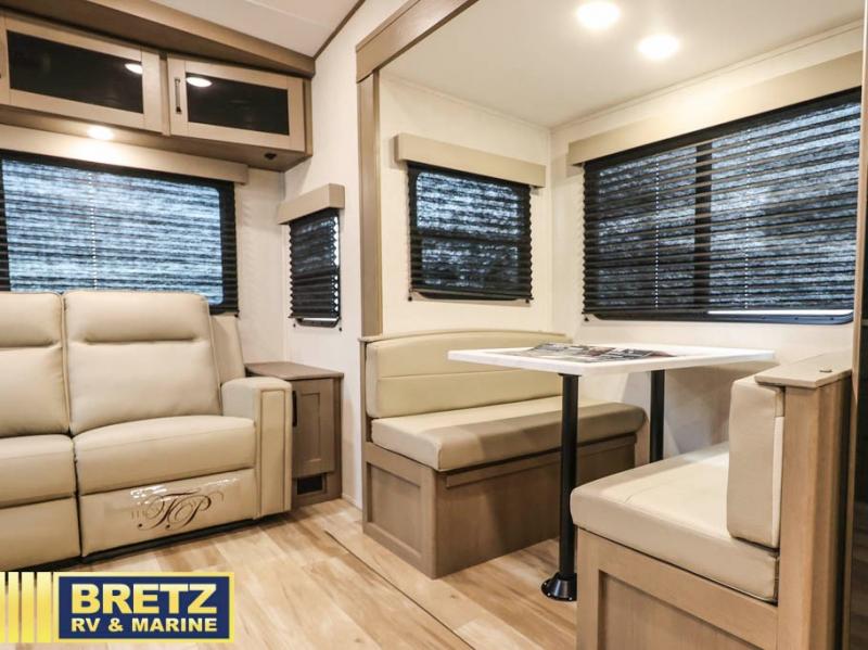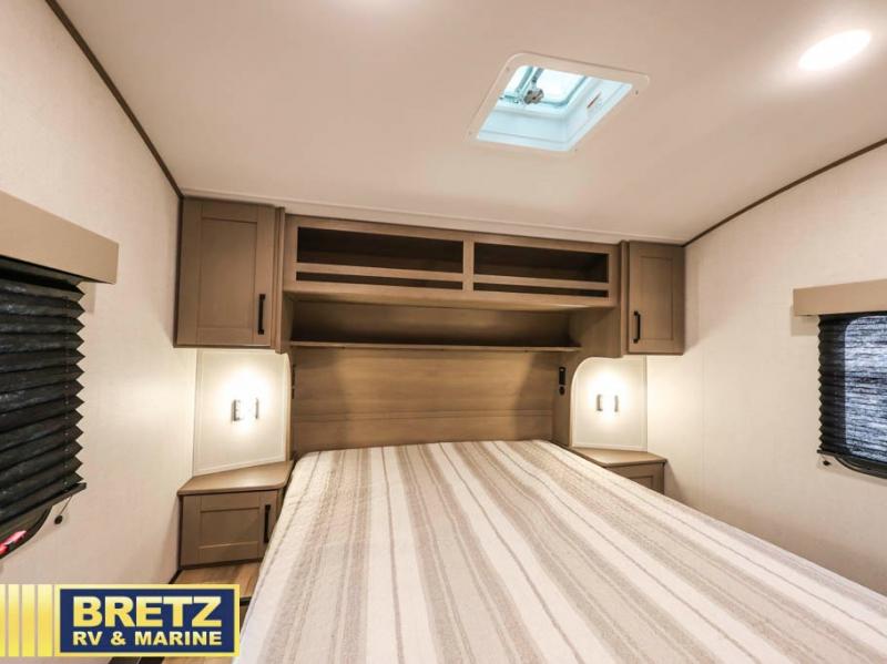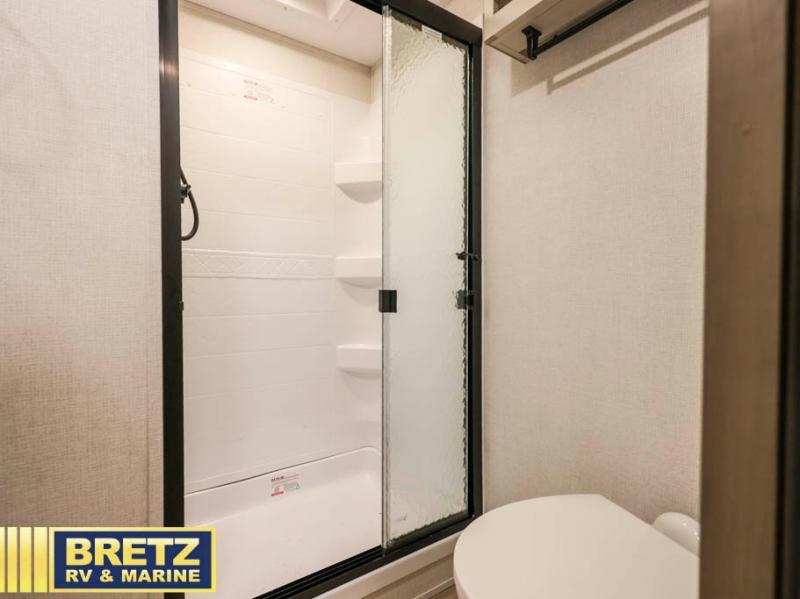 This is the perfect couple's trailer with a space for an overnight guest or two little ones on the booth dinette. You can switch out this dinette for an optional swivel dinette as well, and the standard theater seating can be replaced by an optional trundle bed if you need more sleeping space. A 40" HDTV will keep you entertained when the weather isn't cooperating, and you can whip up your best meals in the full kitchen. And a 19' power awning will provide shade if you choose to take your plate outdoors! The spacious full bath will let you clean up each day, and you'll feel right at home in the front private bedroom with a queen bed!