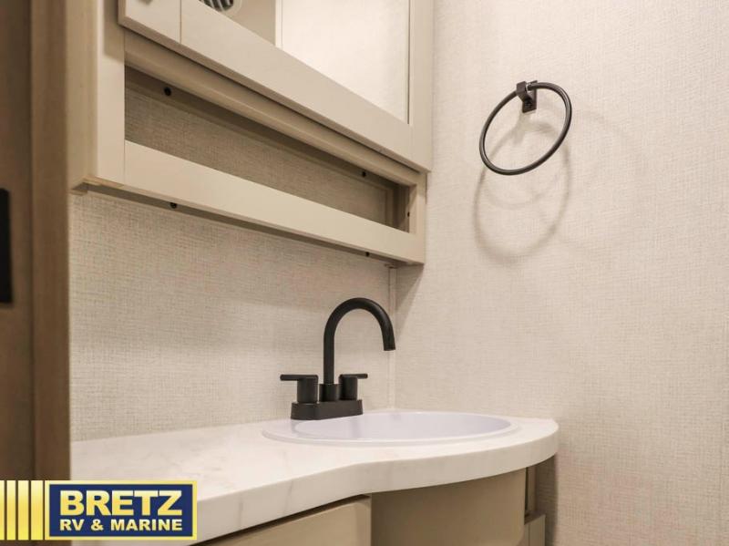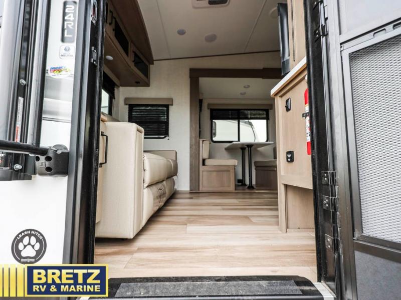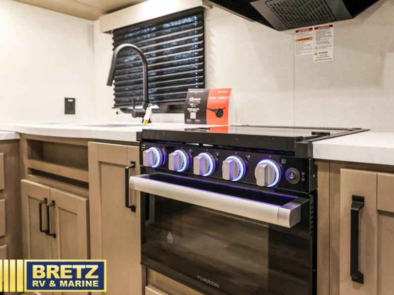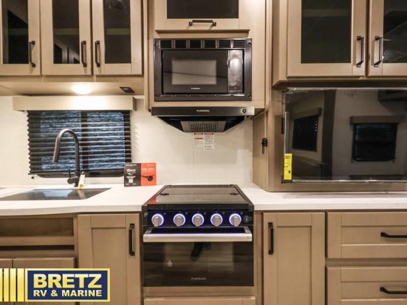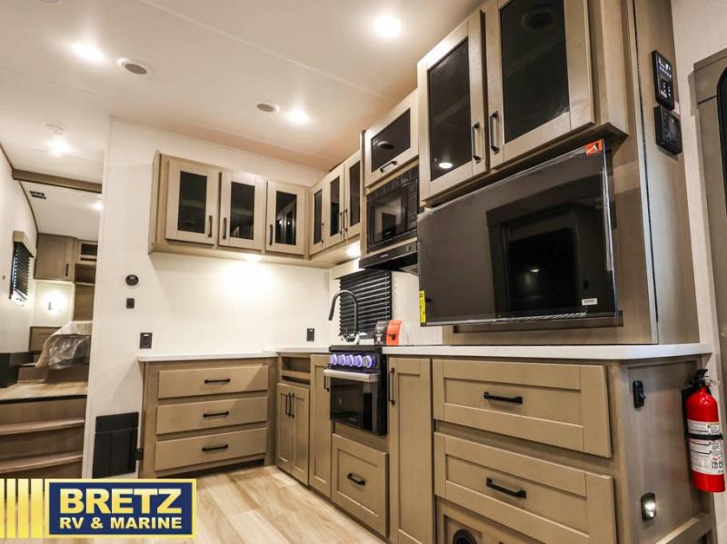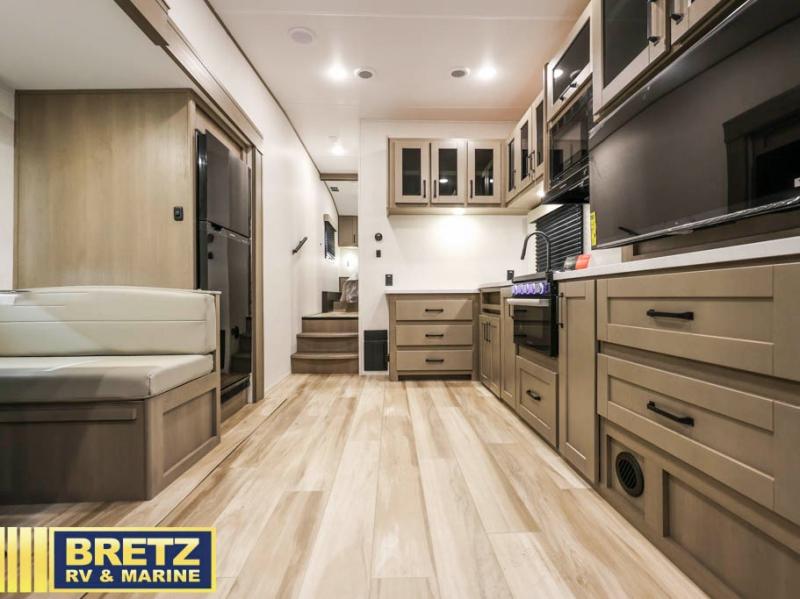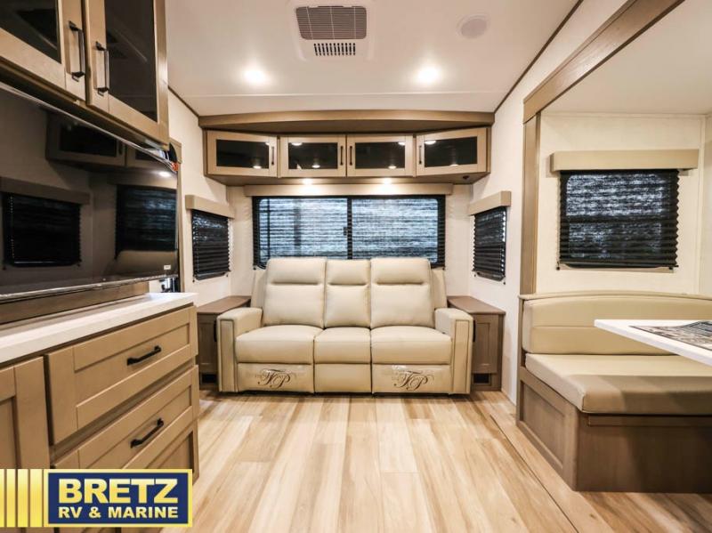 This is the perfect couple's trailer with a space for an overnight guest or two little ones on the booth dinette. You can switch out this dinette for an optional swivel dinette as well, and the standard theater seating can be replaced by an optional trundle bed if you need more sleeping space. A 40" HDTV will keep you entertained when the weather isn't cooperating, and you can whip up your best meals in the full kitchen. And a 19' power awning will provide shade if you choose to take your plate outdoors! The spacious full bath will let you clean up each day, and you'll feel right at home in the front private bedroom with a queen bed!