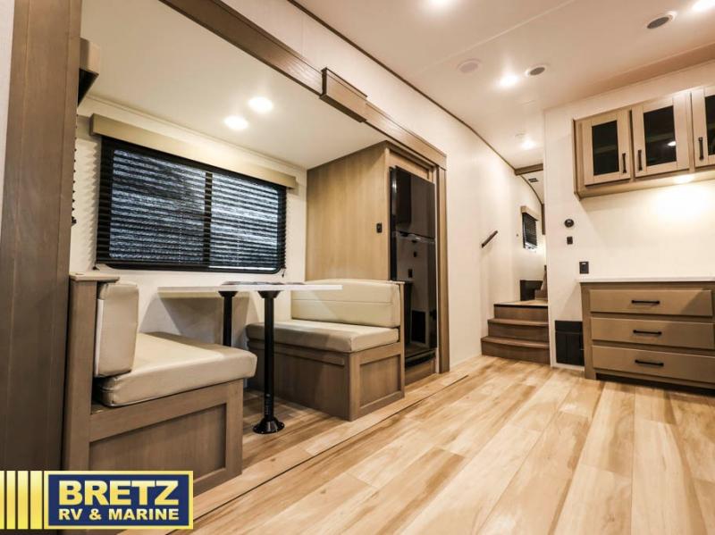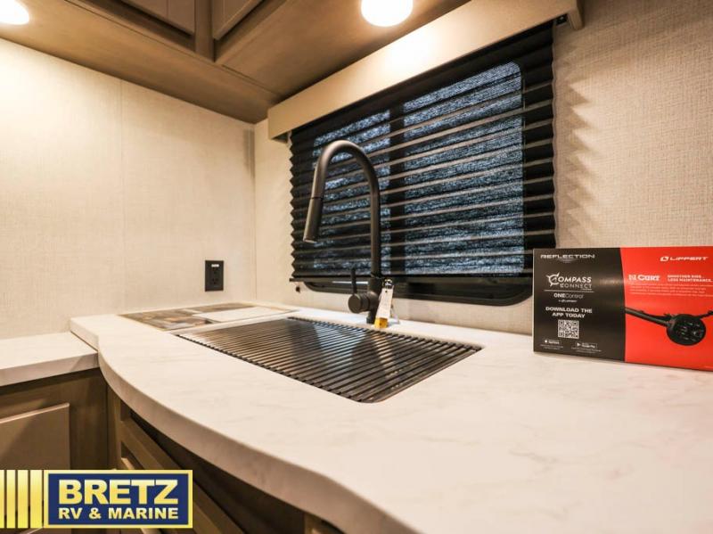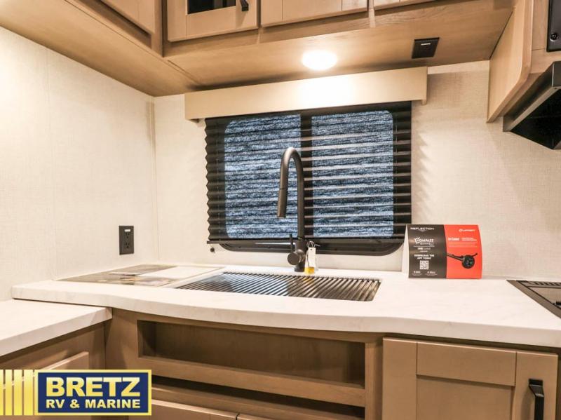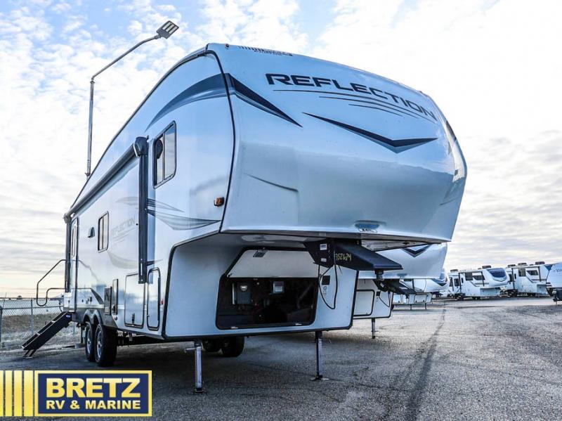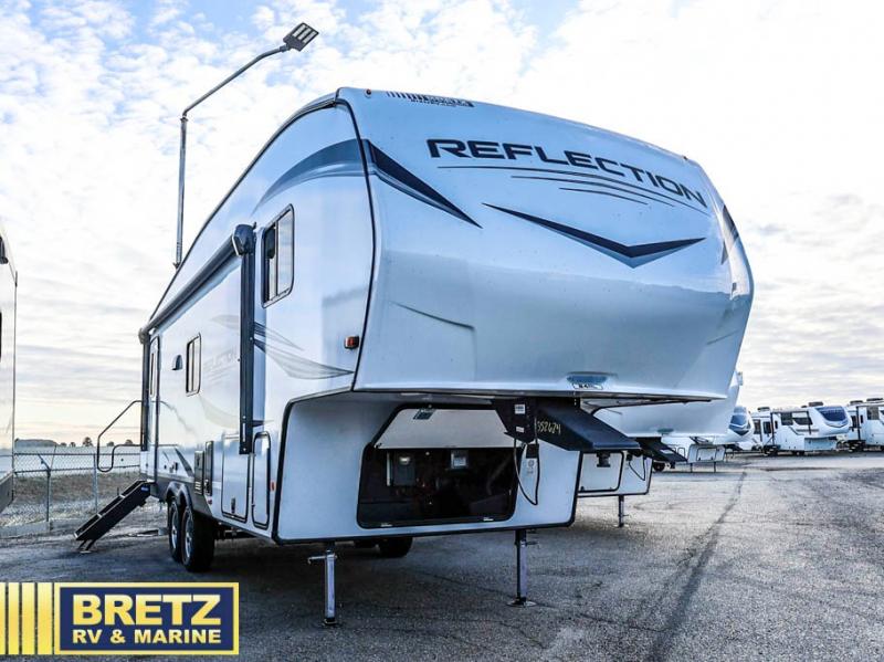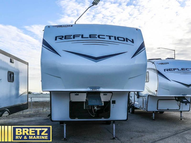 Each Reflection 100 Series fifth wheel by Grand Design is affordable and packed with luxury for unforgettable camping memories! The MorRyde CRE3000 suspension system and Goodyear Endurance tires will provide smooth towing from home to campground. And the solar package with a 180W solar panel, 60 Amp charge controller and 12V refrigerator will allow you to camp for longer periods of time and in more locations! A heated and enclosed underbelly with circulating heat is included in the Arctic 4-Seasons Protection Package, along with a double insulated roof and front cap, and thermofoil insulation under the holding tanks so you can camp all year long if you choose. You will appreciate having an on-demand water heater for hot showers after exploring, and the universal all-in-one docking station will let you monitor your RVs tanks levels and functions with ease. These models also include many luxurious interior features, such as premium Congoleum flooring, pleated shades, residential cabinetry, and matte black fixtures and hardware. Don't let the Reflection 100 Series fifth wheels pass you by!