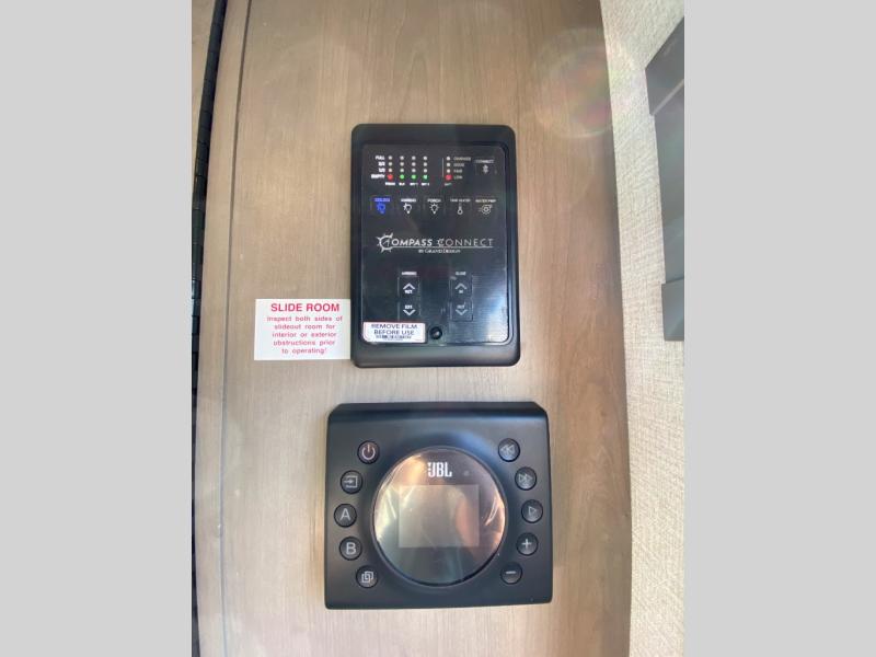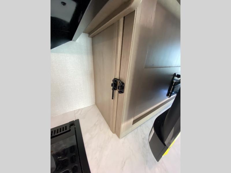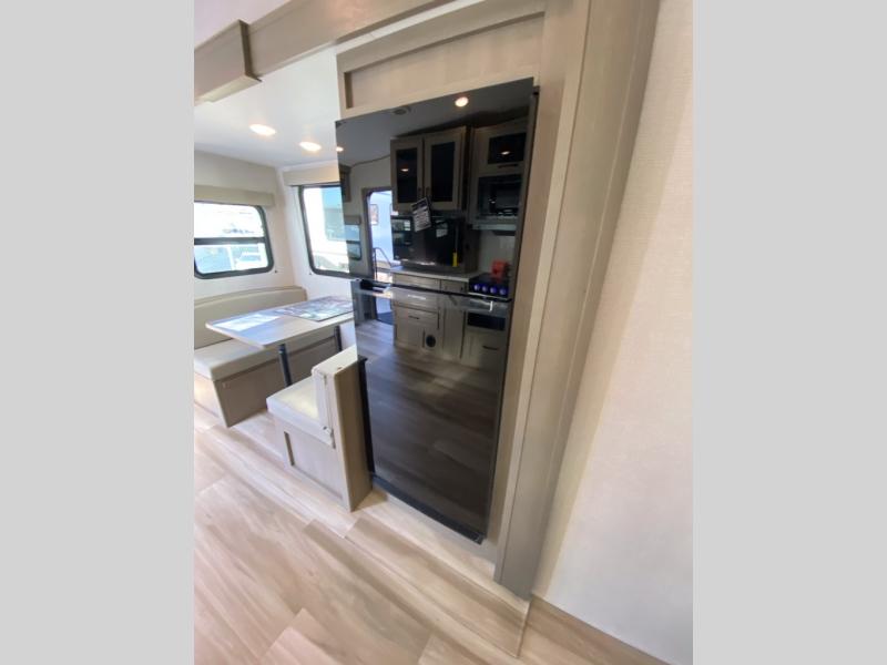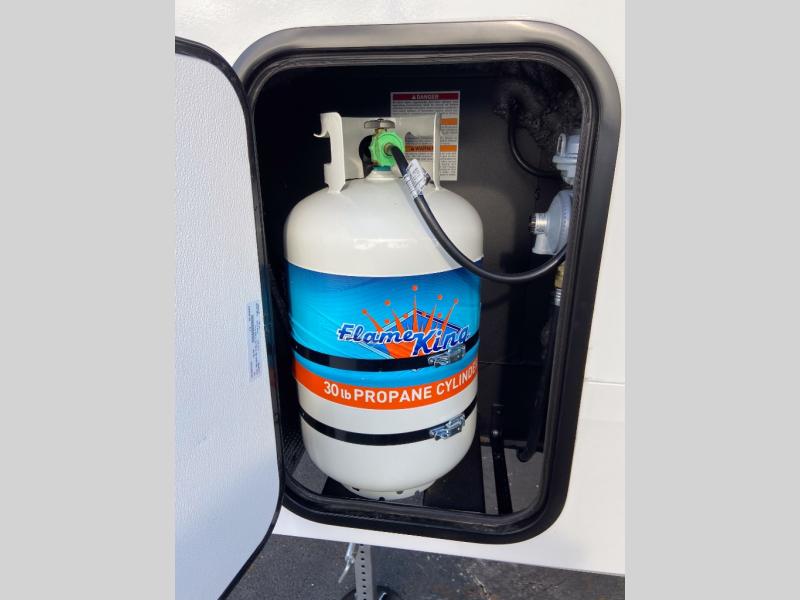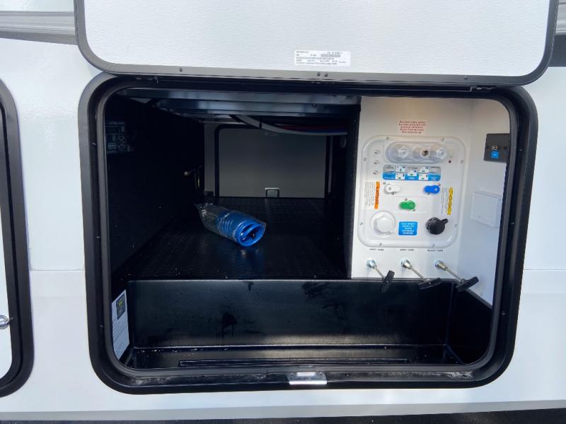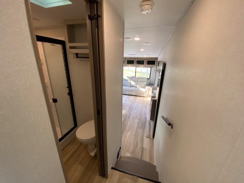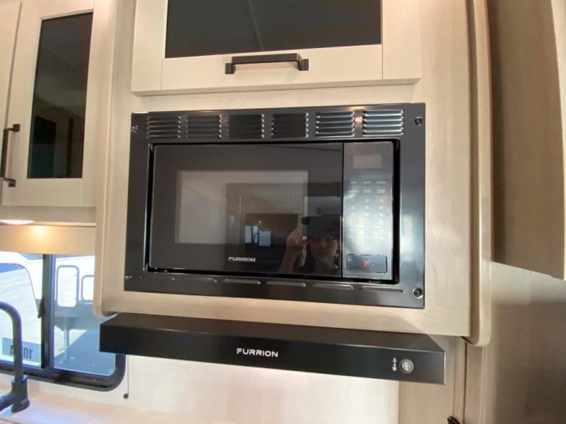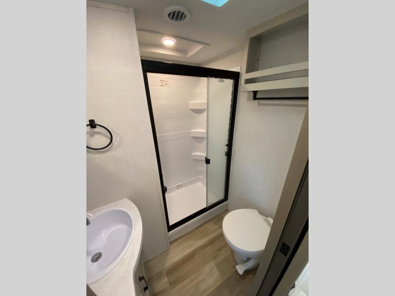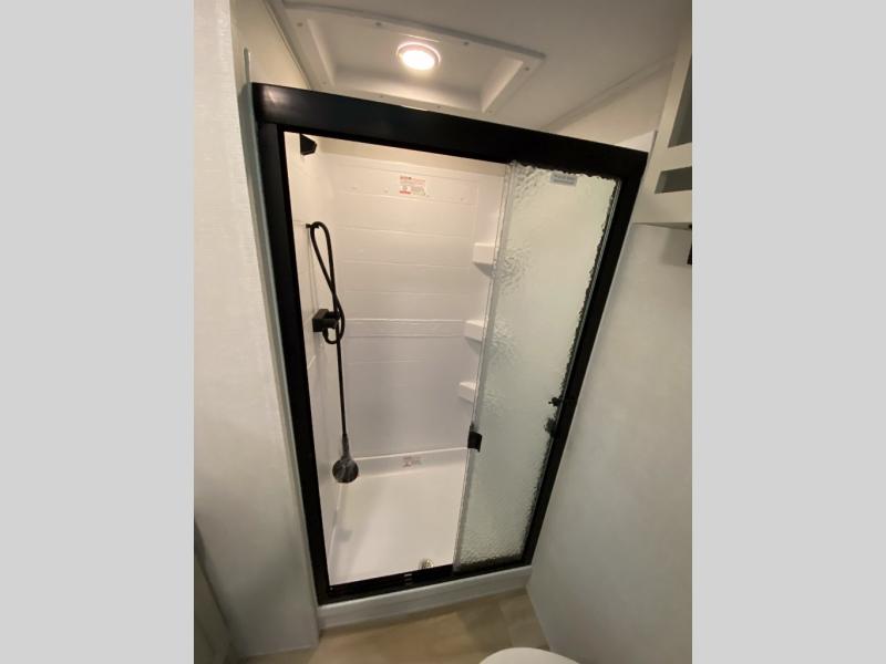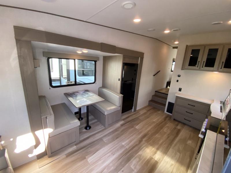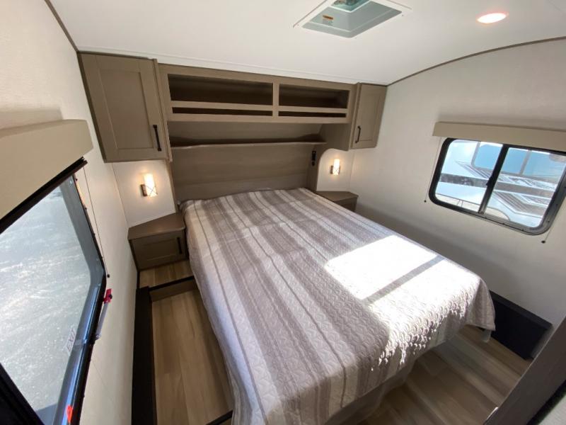 This is the perfect couple's trailer with a space for an overnight guest or two little ones on the booth dinette. You can switch out this dinette for an optional swivel dinette as well, and the standard theater seating can be replaced by an optional trundle bed if you need more sleeping space. A 40" HDTV will keep you entertained when the weather isn't cooperating, and you can whip up your best meals in the full kitchen. And a 19' power awning will provide shade if you choose to take your plate outdoors! The spacious full bath will let you clean up each day, and you'll feel right at home in the front private bedroom with a queen bed!