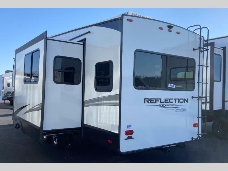 Each Reflection 100 Series fifth wheel by Grand Design is affordable and packed with luxury for unforgettable camping memories! The MorRyde CRE3000 suspension system and Goodyear Endurance tires will provide smooth towing from home to campground. And the solar package with a 180W solar panel, 60 Amp charge controller and 12V refrigerator will allow you to camp for longer periods of time and in more locations! A heated and enclosed underbelly with circulating heat is included in the Arctic 4-Seasons Protection Package, along with a double insulated roof and front cap, and thermofoil insulation under the holding tanks so you can camp all year long if you choose. You will appreciate having an on-demand water heater for hot showers after exploring, and the universal all-in-one docking station will let you monitor your RVs tanks levels and functions with ease. These models also include many luxurious interior features, such as premium Congoleum flooring, pleated shades, residential cabinetry, and matte black fixtures and hardware. Don't let the Reflection 100 Series fifth wheels pass you by!