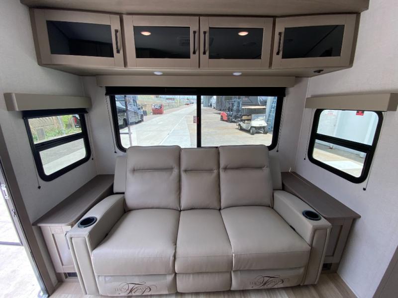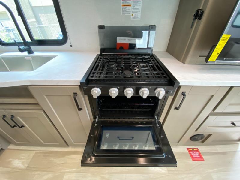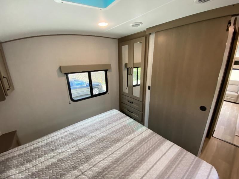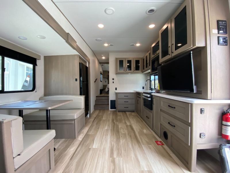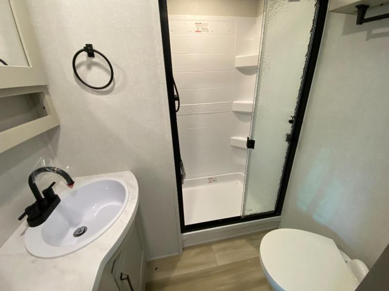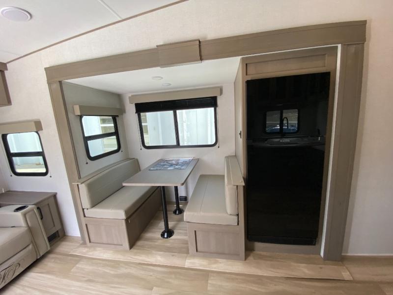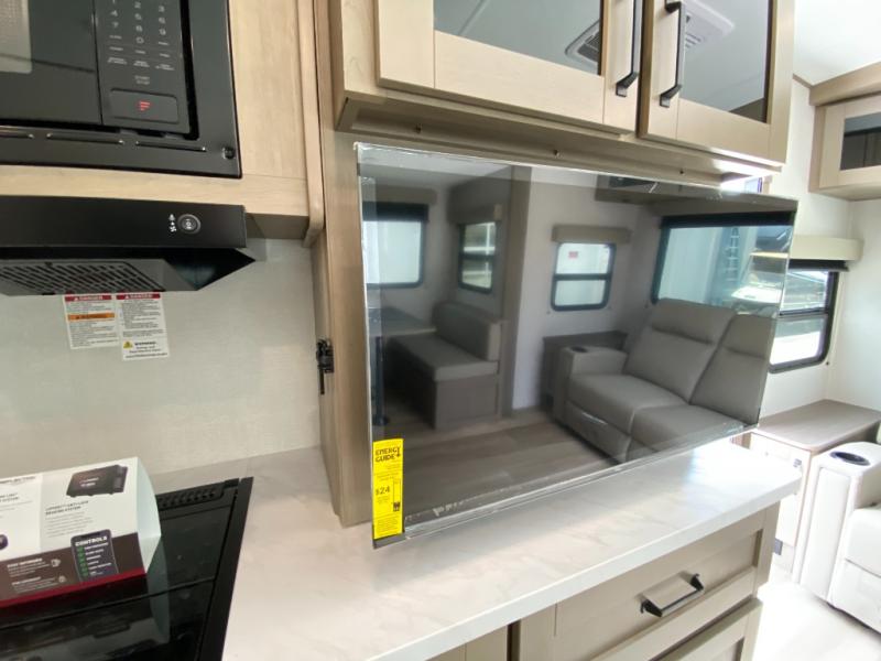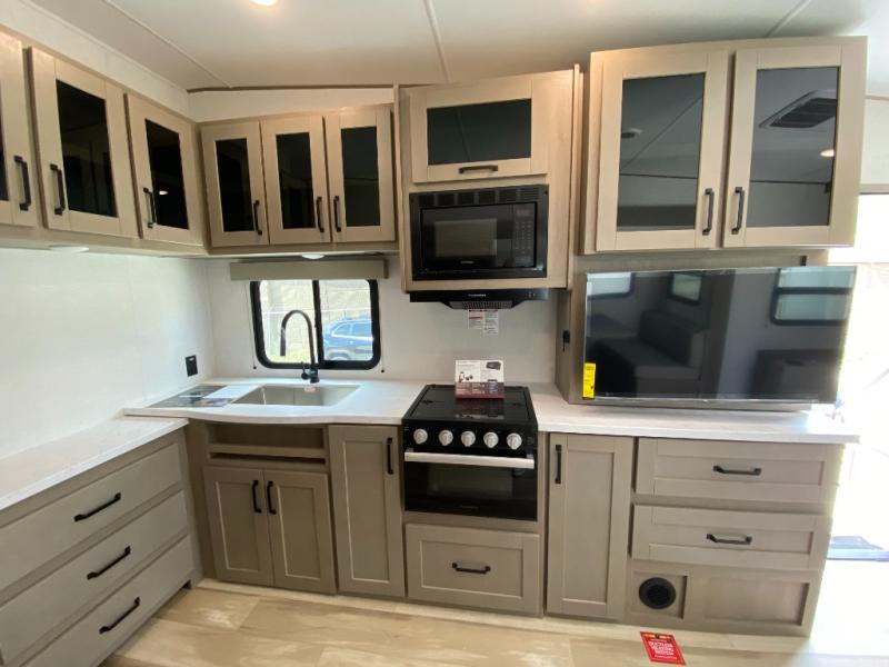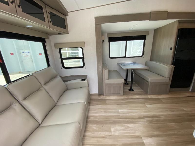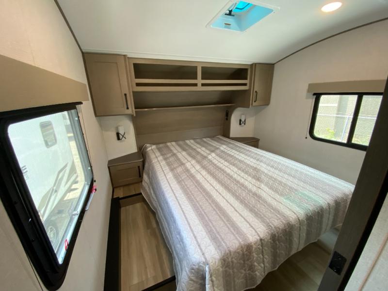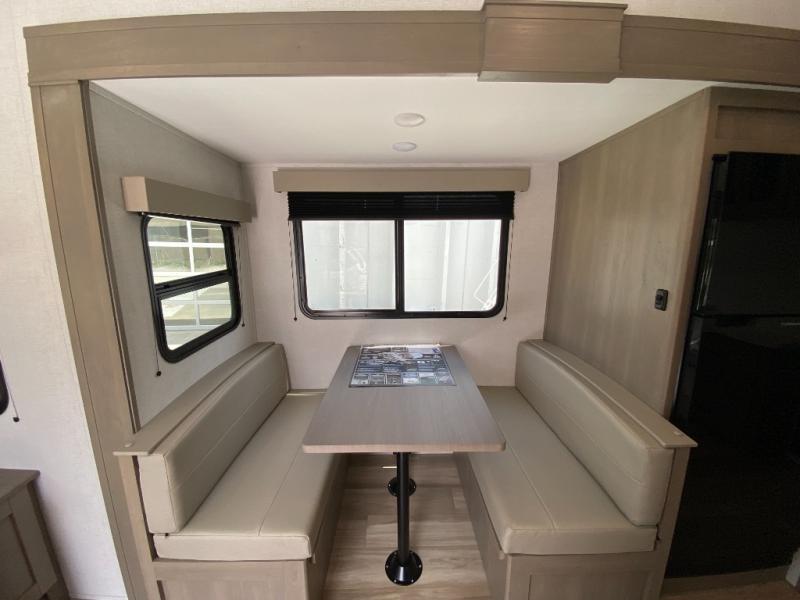 This is the perfect couple's trailer with a space for an overnight guest or two little ones on the booth dinette. You can switch out this dinette for an optional swivel dinette as well, and the standard theater seating can be replaced by an optional trundle bed if you need more sleeping space. A 40" HDTV will keep you entertained when the weather isn't cooperating, and you can whip up your best meals in the full kitchen. And a 19' power awning will provide shade if you choose to take your plate outdoors! The spacious full bath will let you clean up each day, and you'll feel right at home in the front private bedroom with a queen bed!