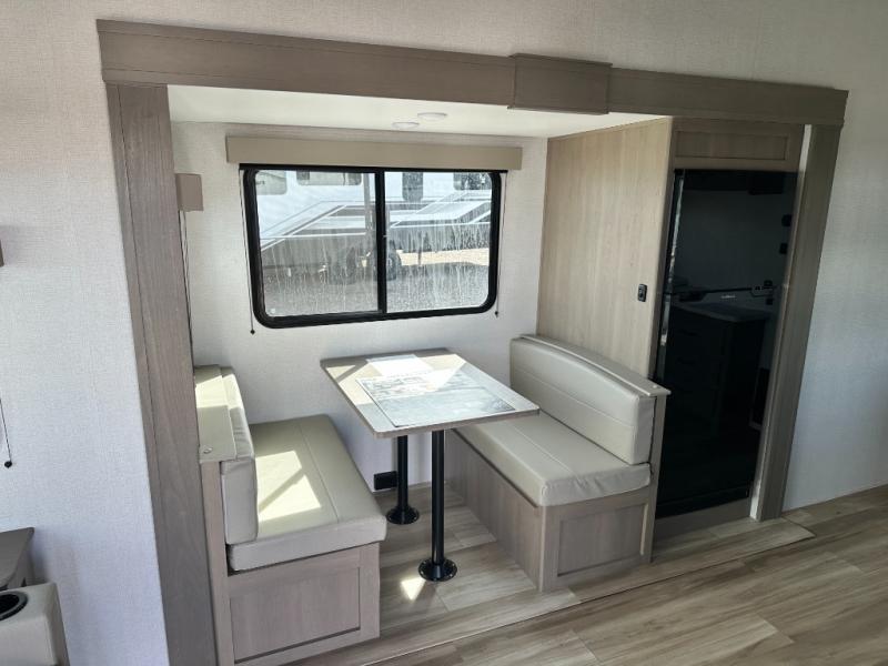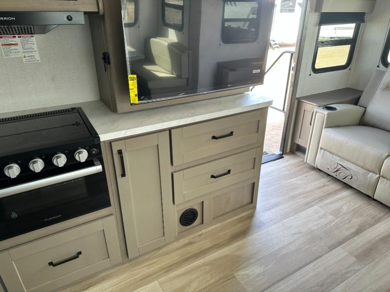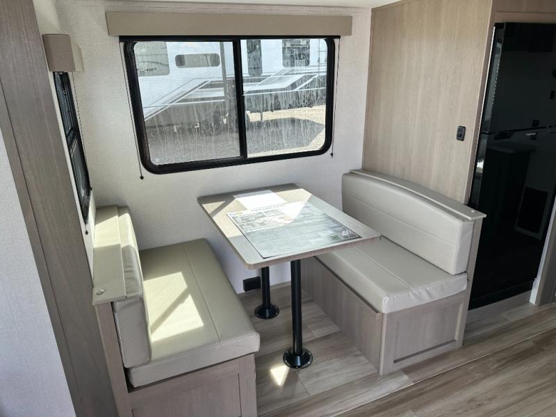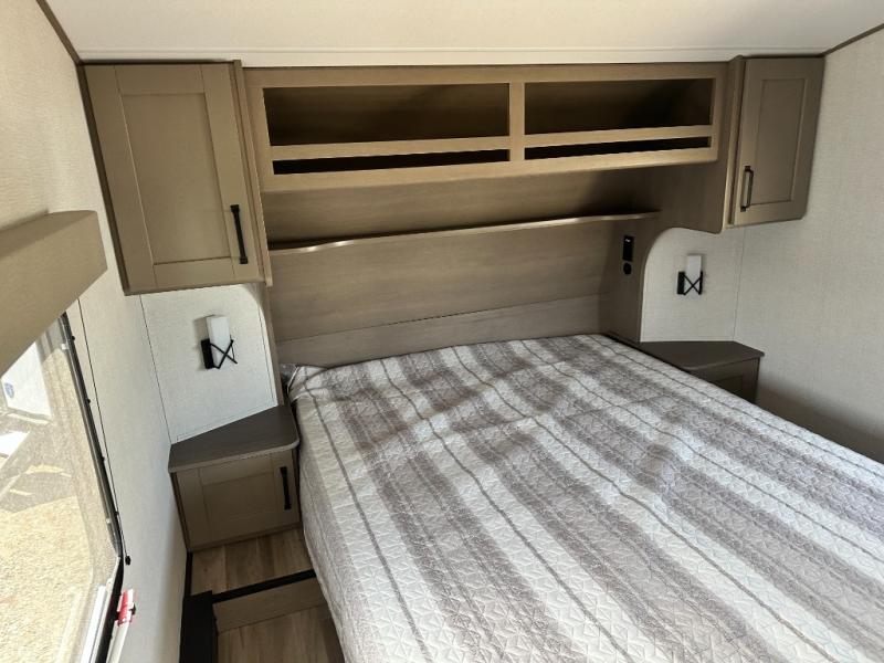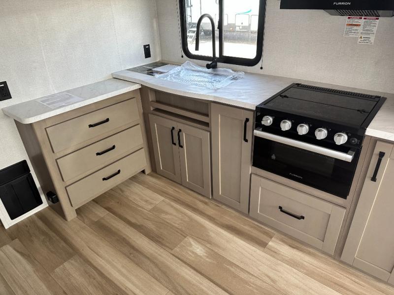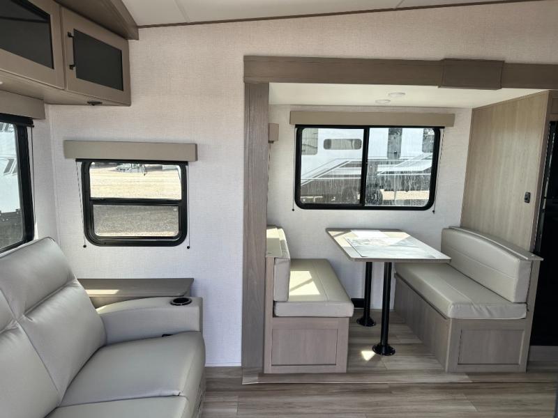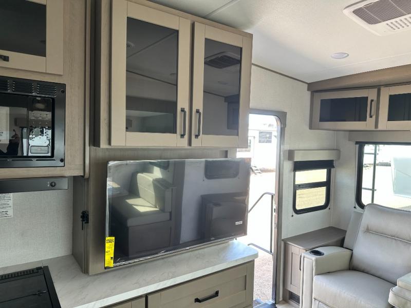 This is the perfect couple's trailer with a space for an overnight guest or two little ones on the booth dinette. You can switch out this dinette for an optional swivel dinette as well, and the standard theater seating can be replaced by an optional trundle bed if you need more sleeping space. A 40" HDTV will keep you entertained when the weather isn't cooperating, and you can whip up your best meals in the full kitchen. And a 19' power awning will provide shade if you choose to take your plate outdoors! The spacious full bath will let you clean up each day, and you'll feel right at home in the front private bedroom with a queen bed!